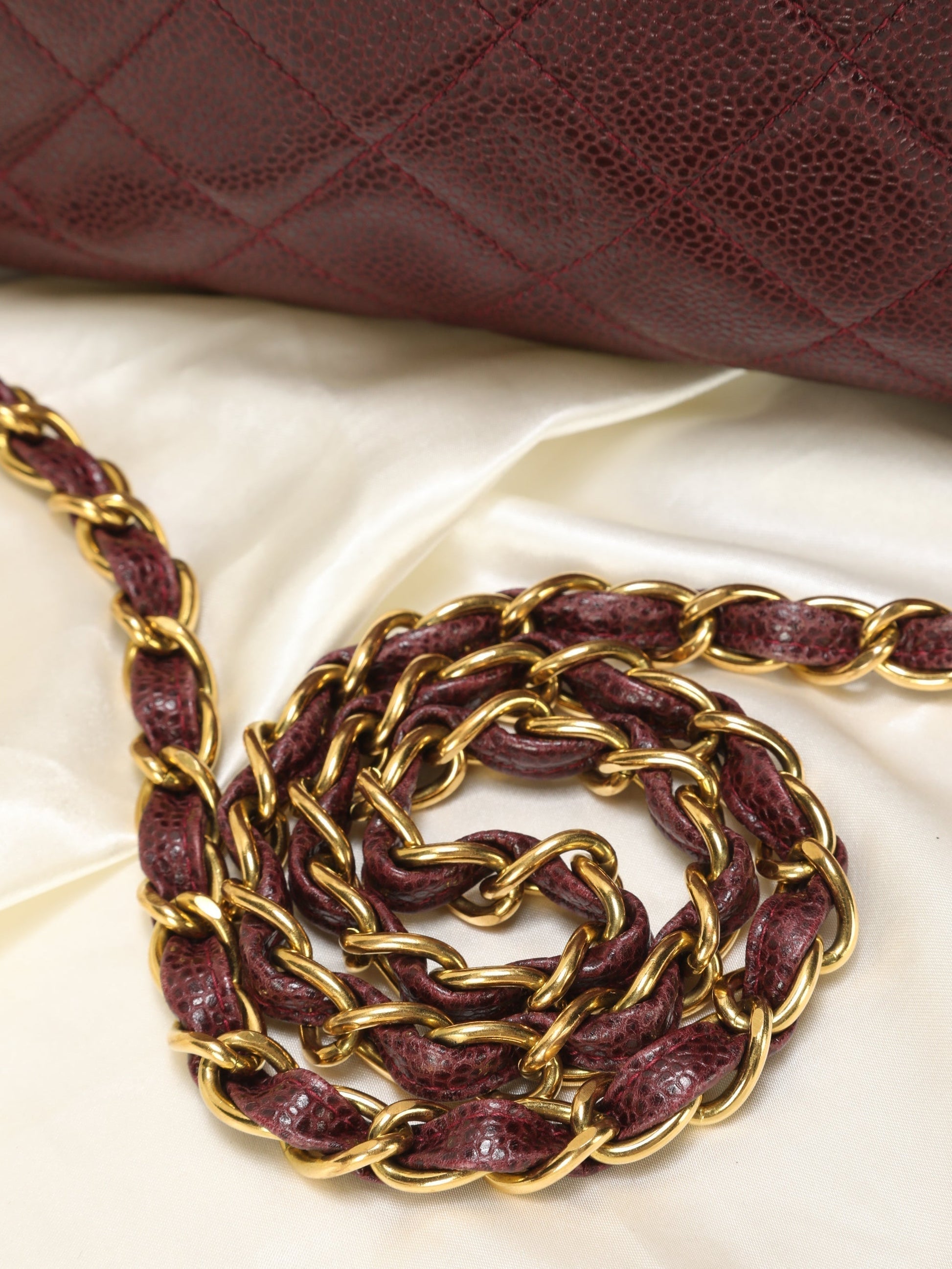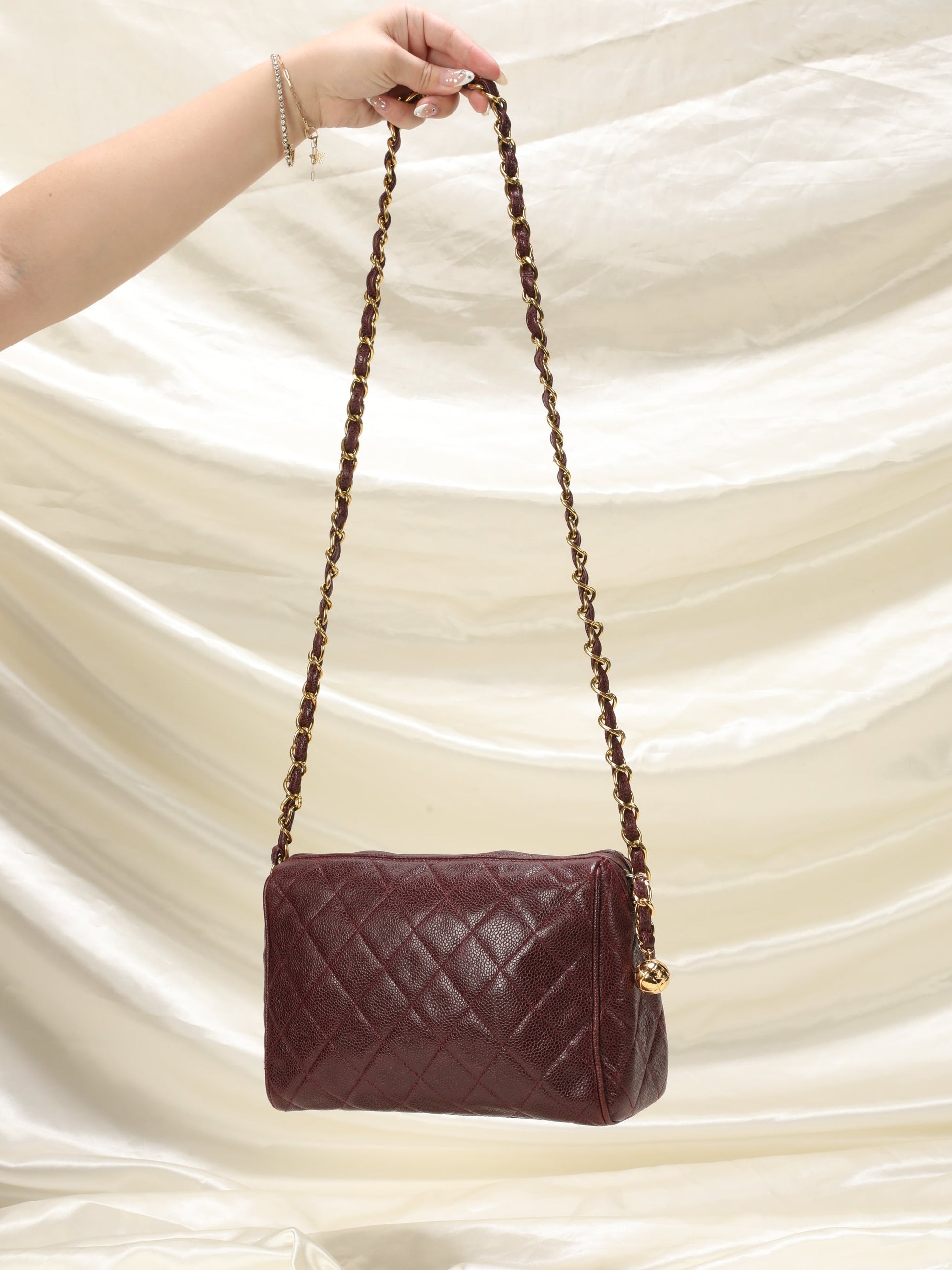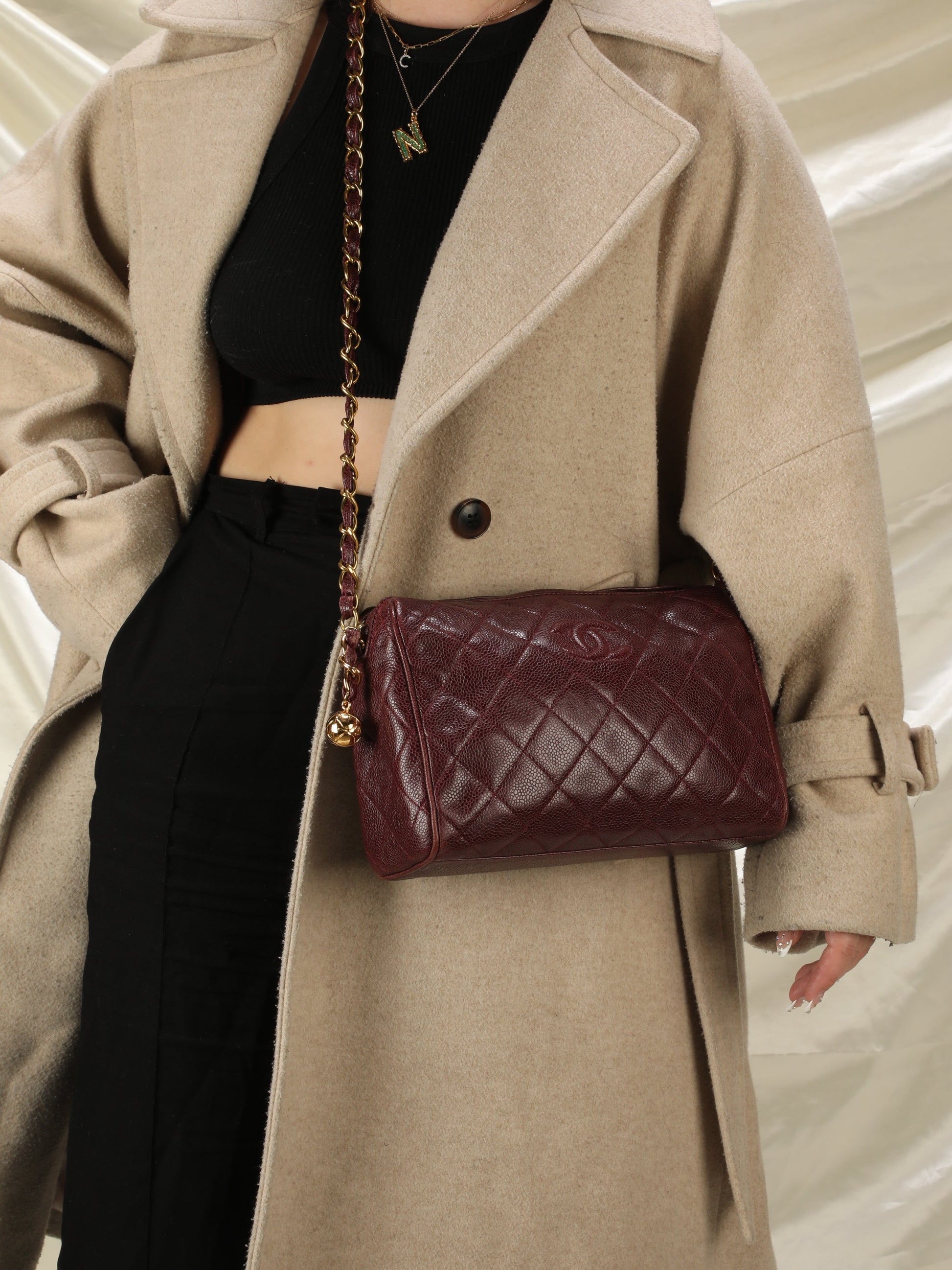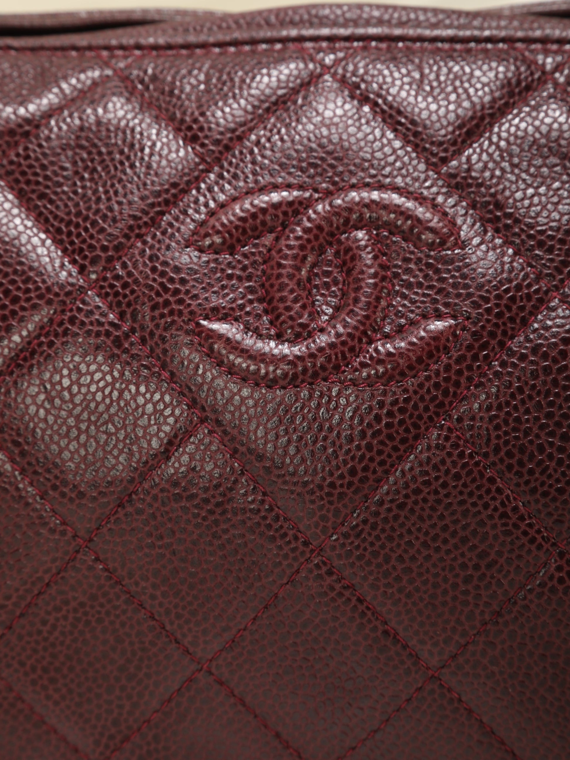 Chanel caviar bag in a gorgeous??wine-colored??hue combined with 24kt gold plated hardware. Classic Chanel chain. Crafted in the durable caviar material.??Chanel logo ball charm attached on zipper for added flare! 24kt gold plated hardware.