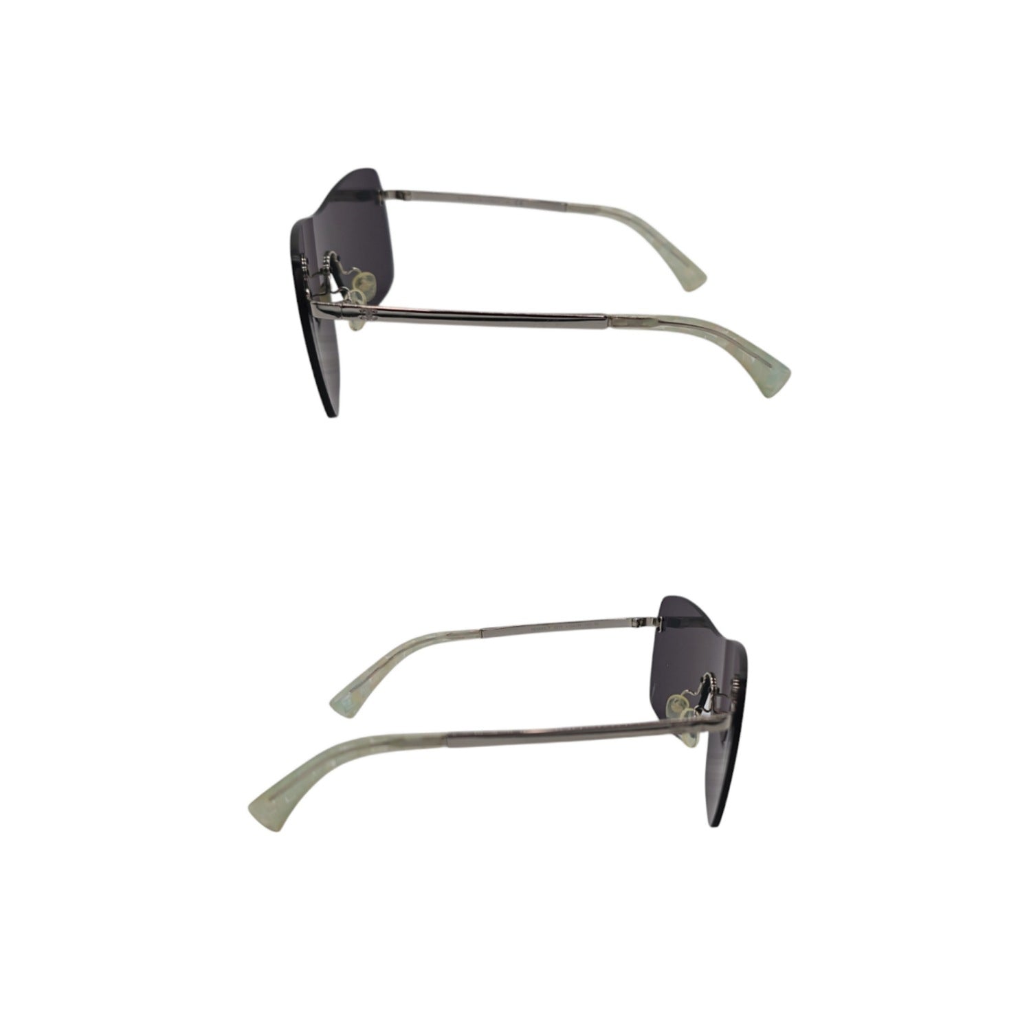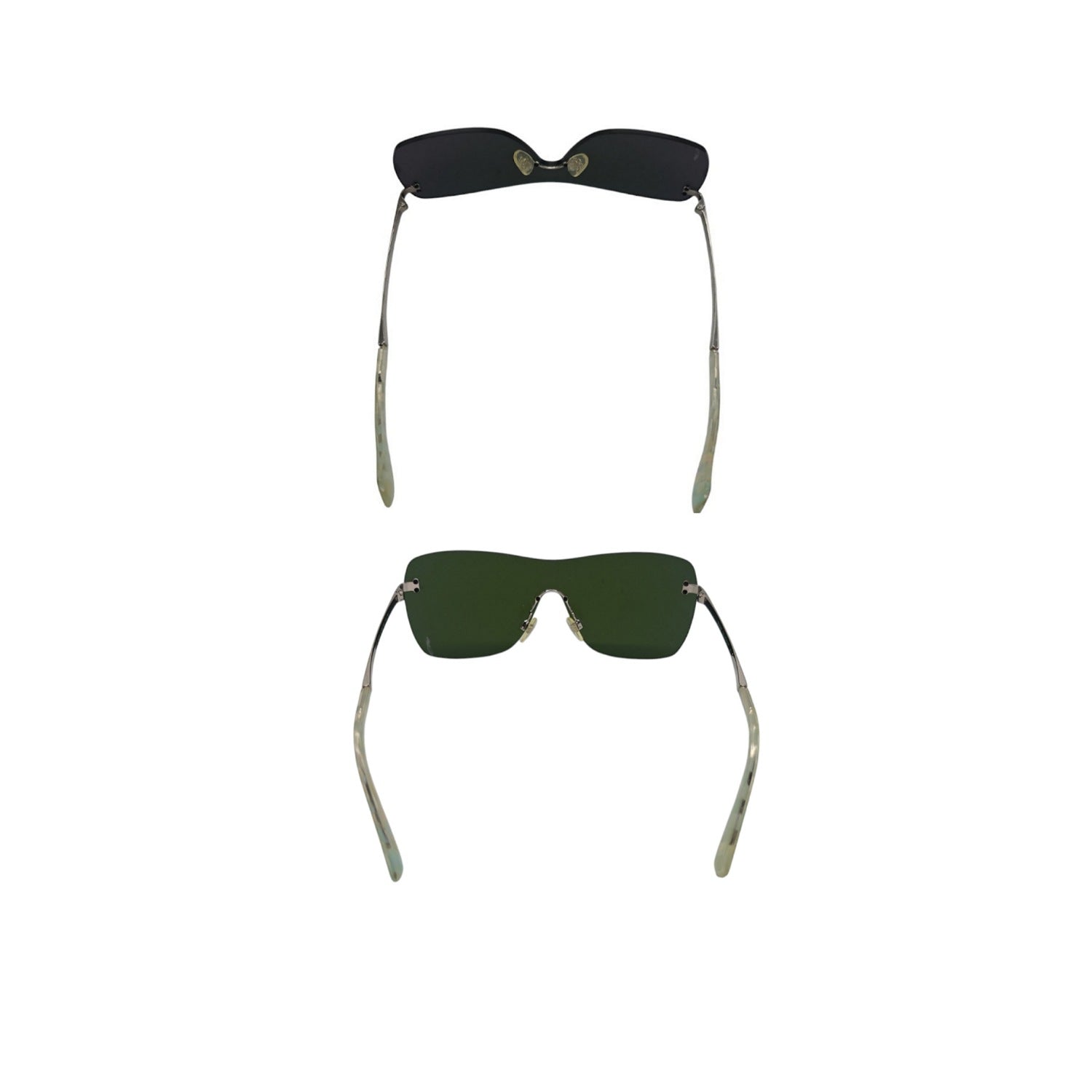 Elevate your style with these Chanel 4215 CC Shield Quilting Runway Sunglasses. Featuring a purple iridescent mirrored rimless lens with a unique quilting effect, these sunglasses are both fashionable and functional. The polished silver-tone arms etched with CC near the hinges add a touch of designer elegance. Made in Italy, these sunglasses come in a good condition with a case and cloth included. Perfect for any sunny day, these sunglasses will be your go-to choice.