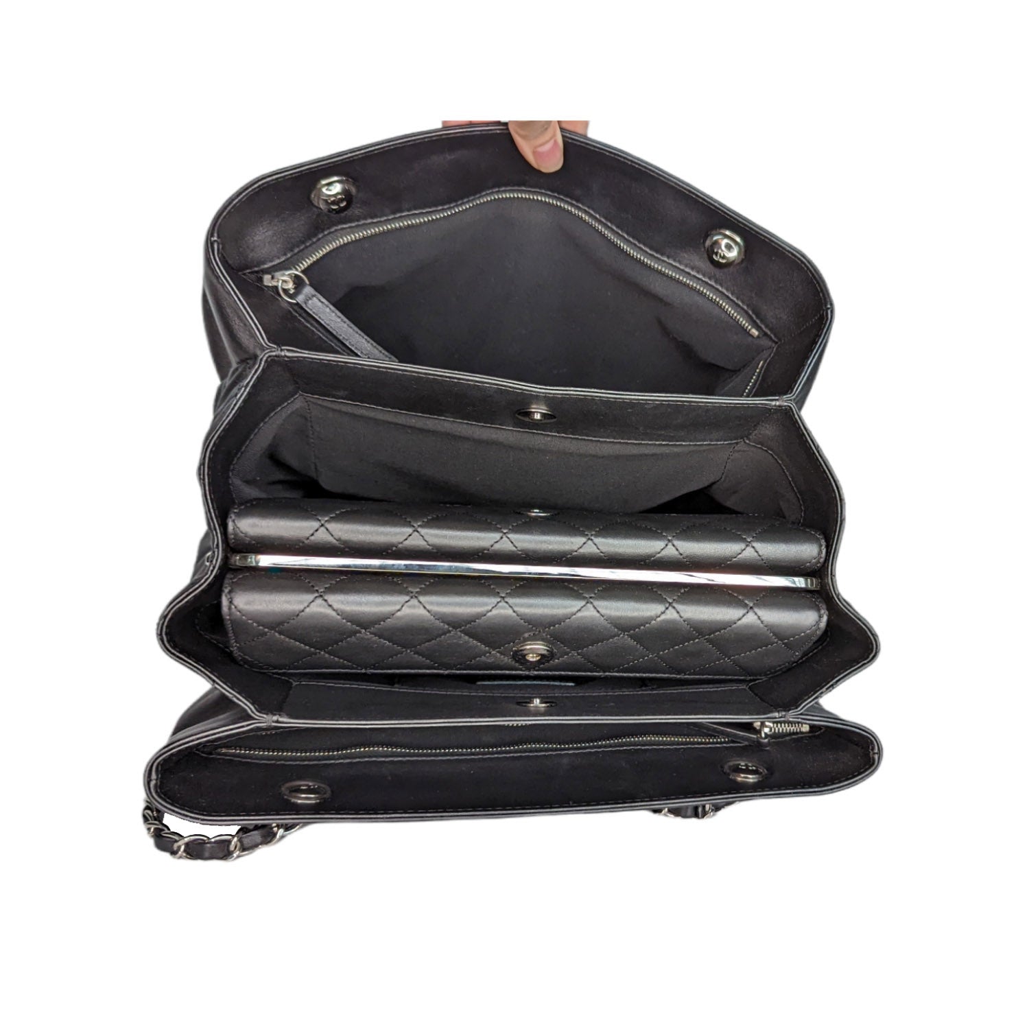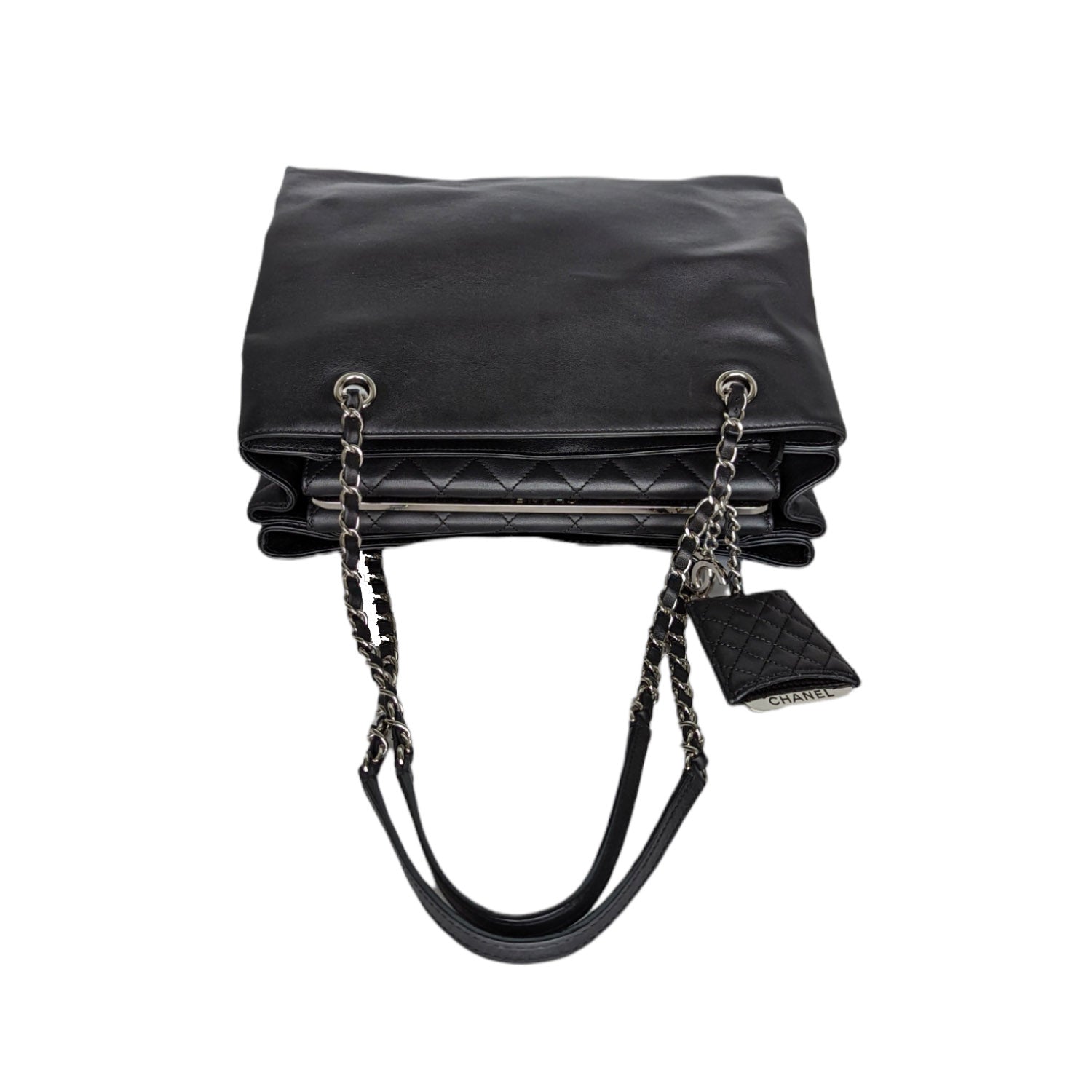 From the 2016 Collection by Karl Lagerfeld. This Chanel Accordion Shopping Tote is crafted of smooth Lambskin leather with quilted sides and trim. It features leather woven chain straps with leather shoulder pads, protective base studs, and silver-toned hardware. The interior is a fine textile with plenty of compartments and pockets. 5,000.