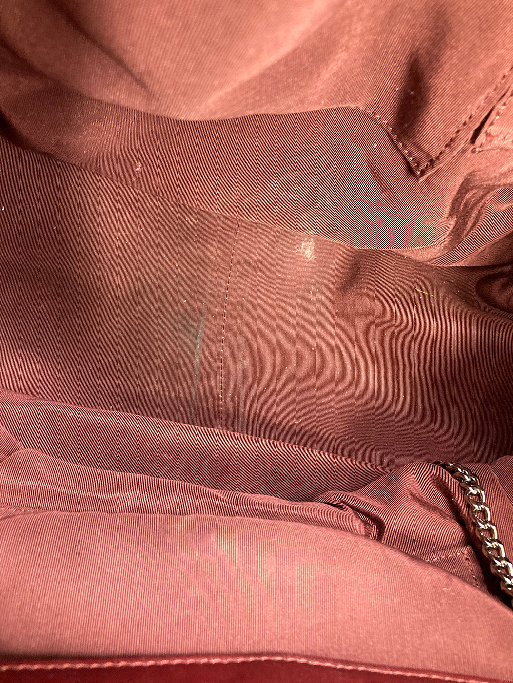 Chanel Astrakhan Black Leather Ruched Shopping Tote in excellent condition. Limited edition black leather ruched astrakhan front and back with CC quilted along both sides. Striped quilted pattern along sides and base. Top double leather wrapped and woven chain handles. top zip closure opens to a maroon nylon interior with 3 slit, one zipped, one flap side pocket and an attached silver chain key/wallet holder. Overall excellent condition. clean corners and edges. no exterior stains, smells or scuffs. signs of use inside with stains and spots on bottom of lining- see photos for details. They do not detract from the overall use or appearance of this piece when worn but must be mentioned. purchase includes a dust cover. measurements: 14"x12"x8" 11" strap drop