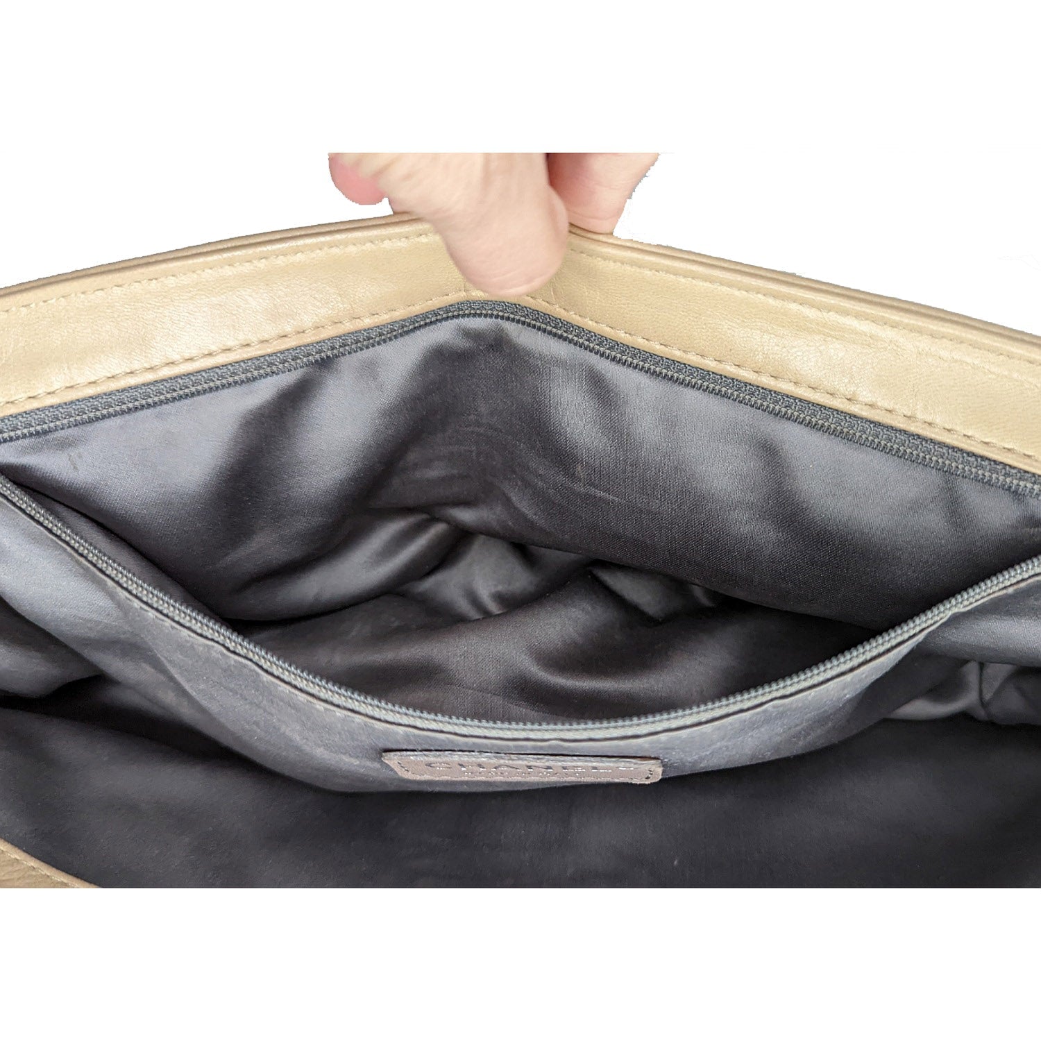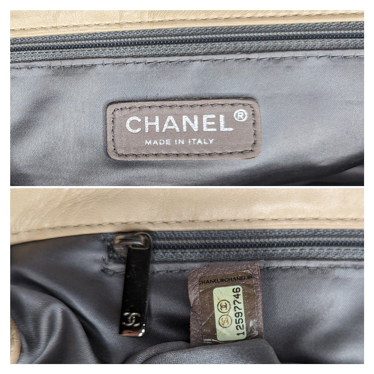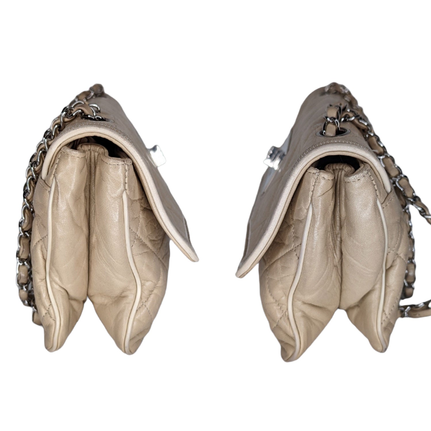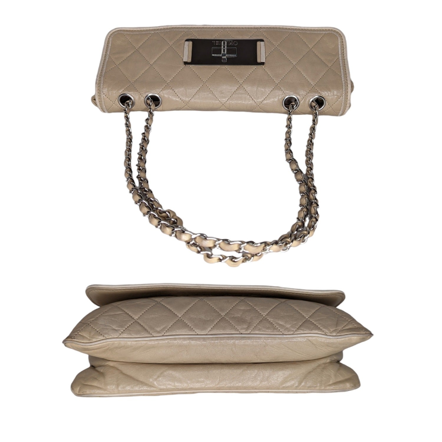 Go glam with this gorgeous Chanel Mademoiselle East-West Flap, crafted in beige diamond-quilted lambskin leather with contrast stitching, featuring a silver-tone chain link shoulder strap threaded with leather, sides that expand, a Mademoiselle turn-lock, opens to a gray satin interior lining with a single zip pocket.