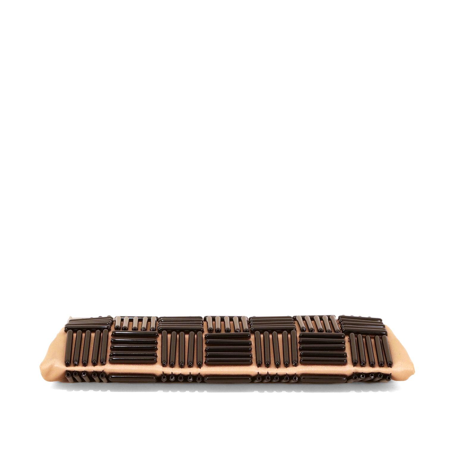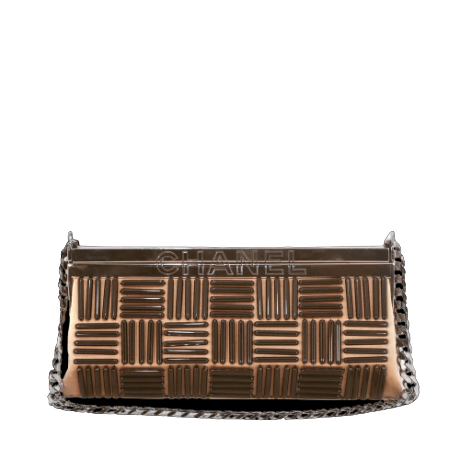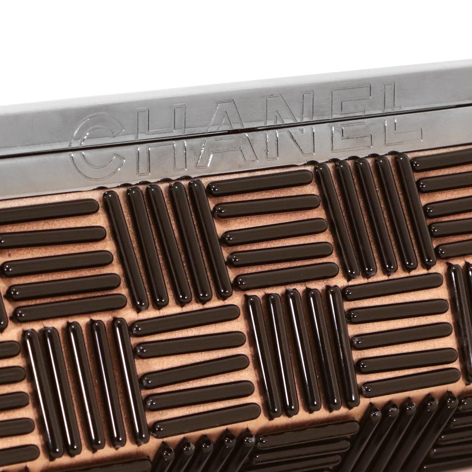 This Chanel Beige Satin Applique Clutch is in excellent condition. Very unique ornamentation combines beautifully with edgy silver accents.