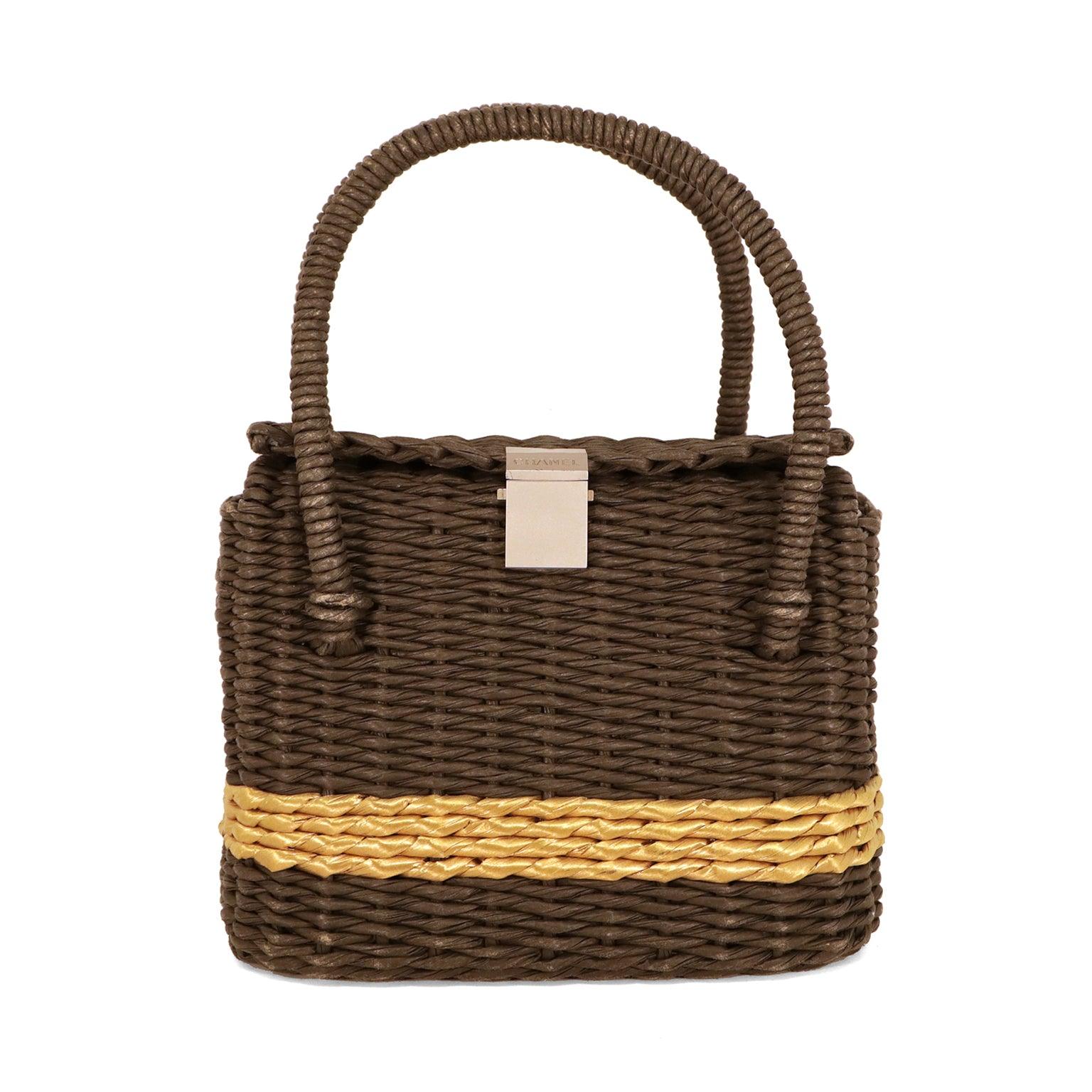 Black wicker sturdy woven bag has golden banded stripe. Matte silver tone hardware closure. Double handles are fashionably carried at the elbow or in hand. Dust bag included.