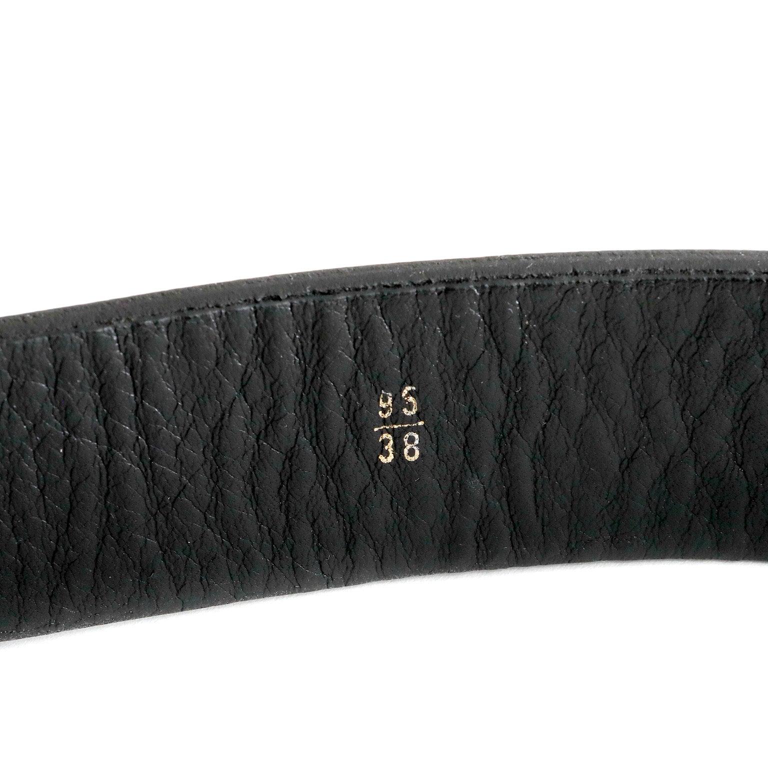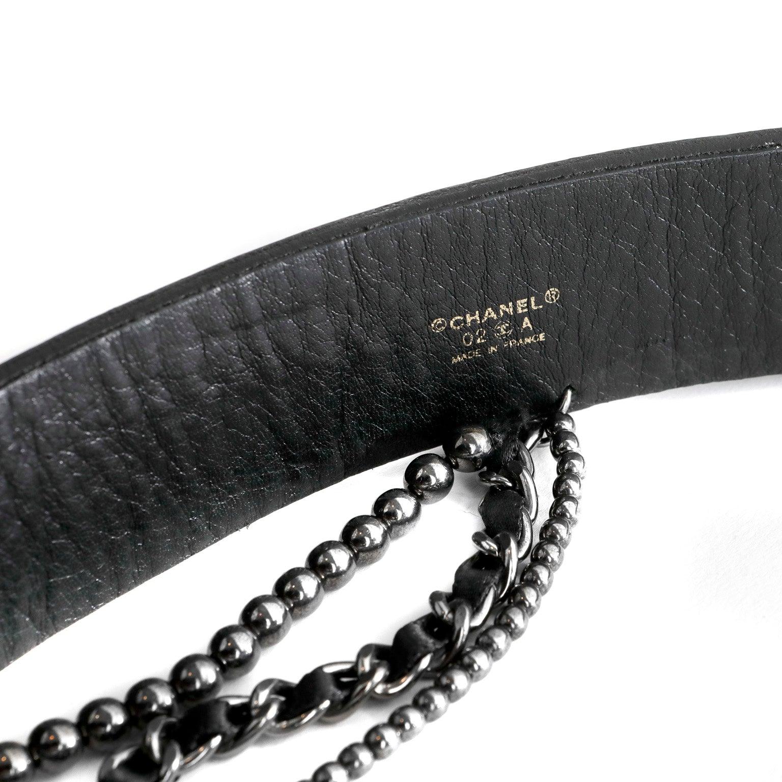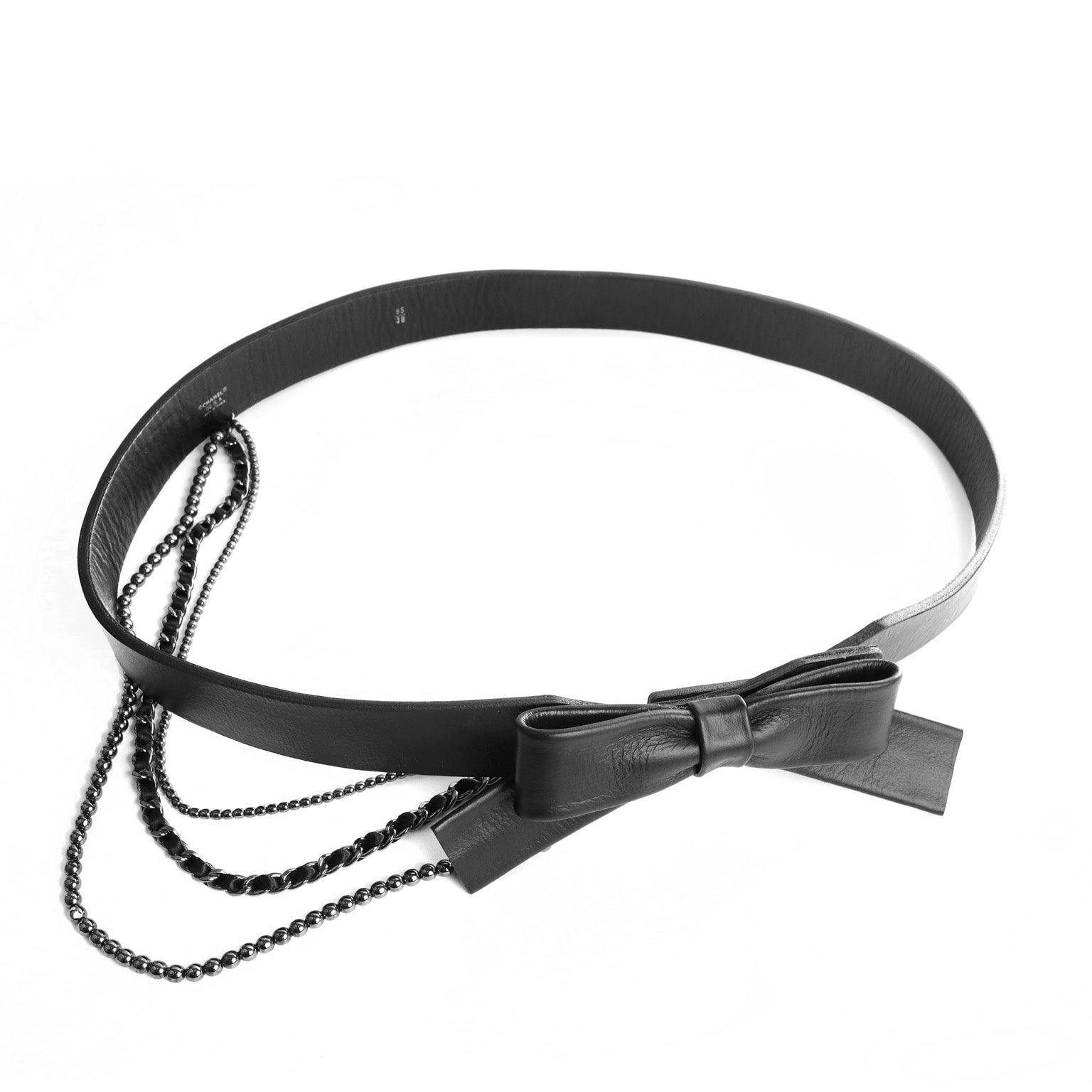 This Chanel Black Bow Belt is in mint condition. Black leather belt is covered with black wool fabric and has a central bow closure. Three different style chains dangle decoratively from the side. Snap closure. Made in France. Size 95/ 38.