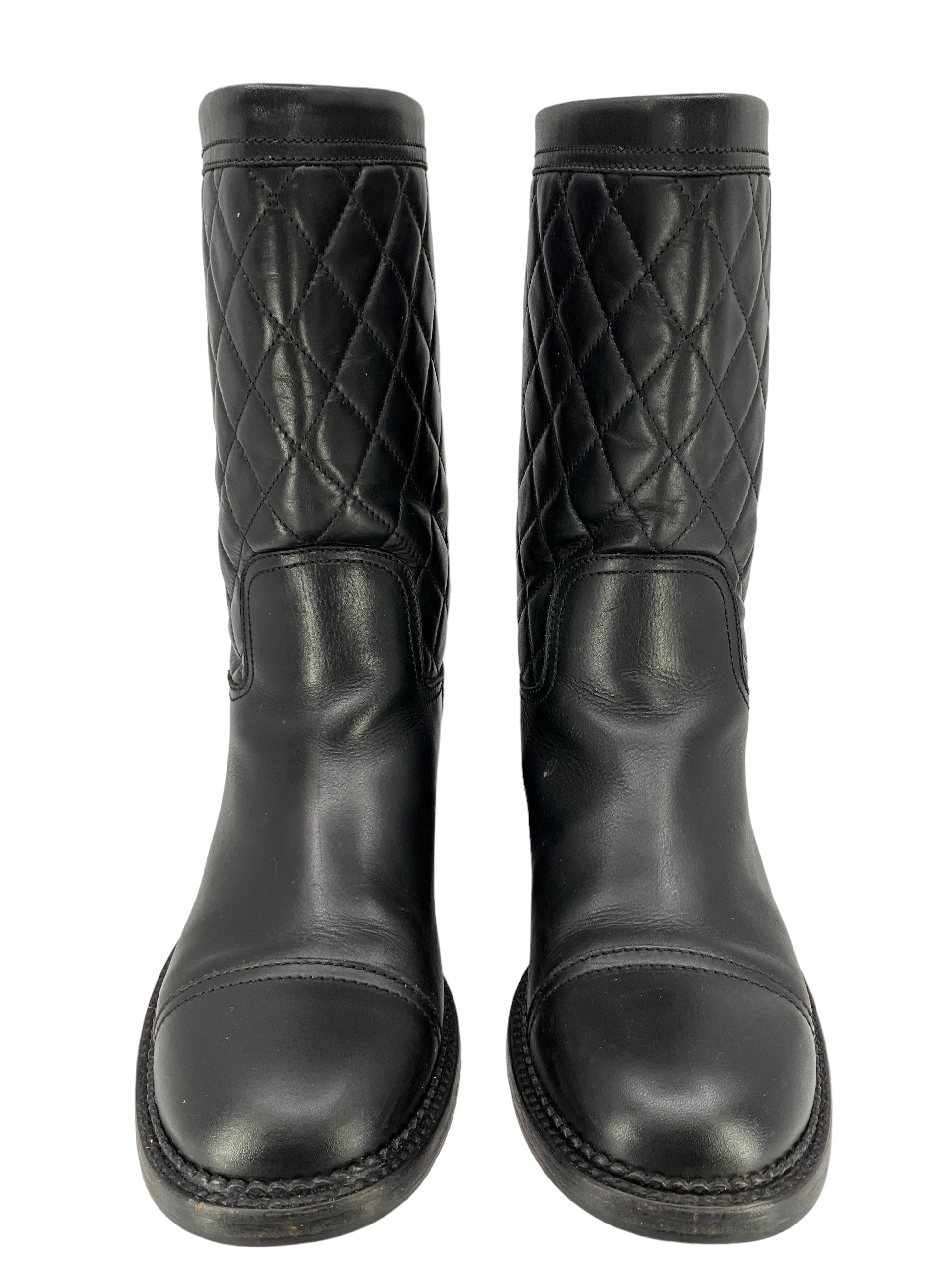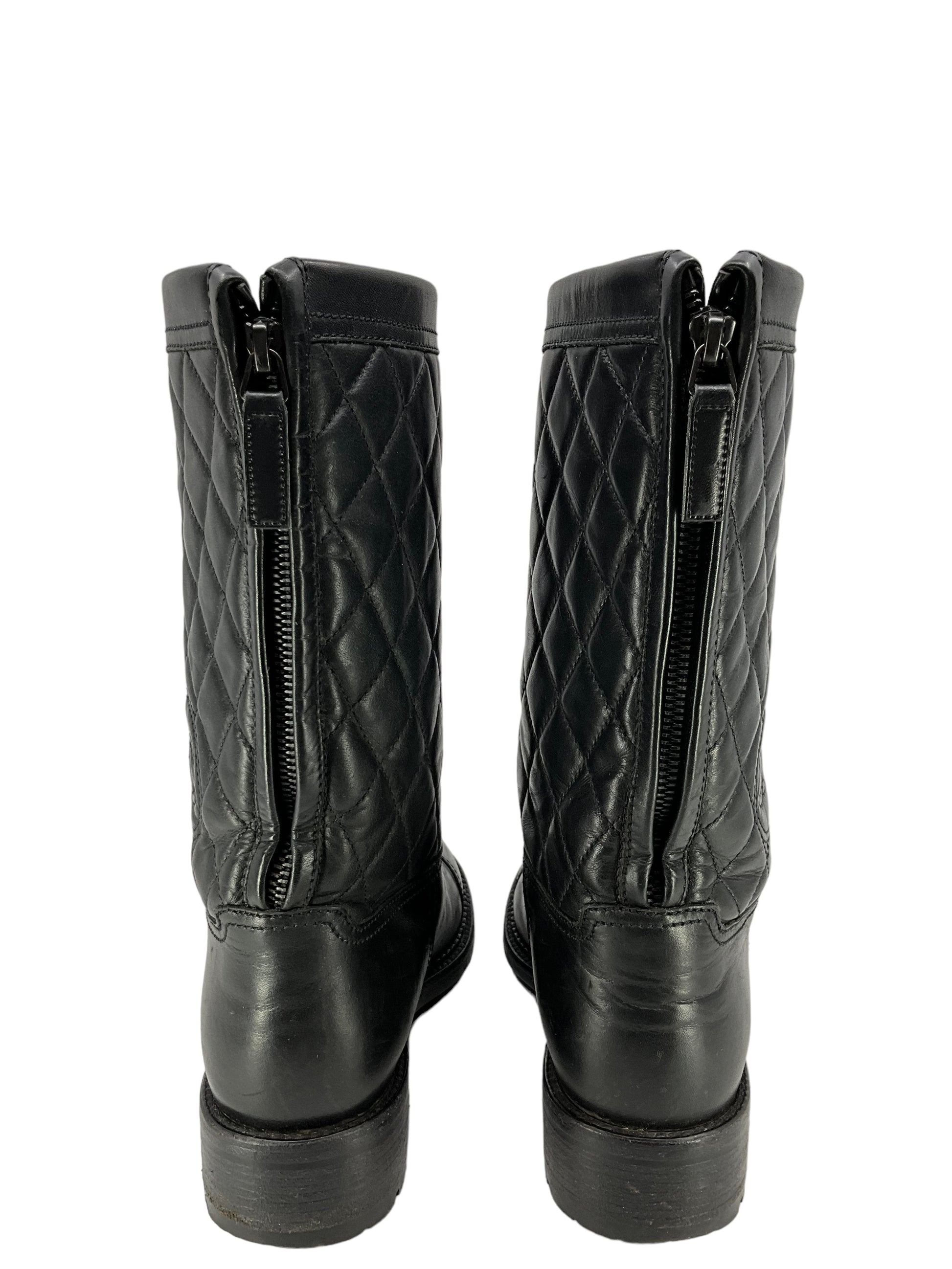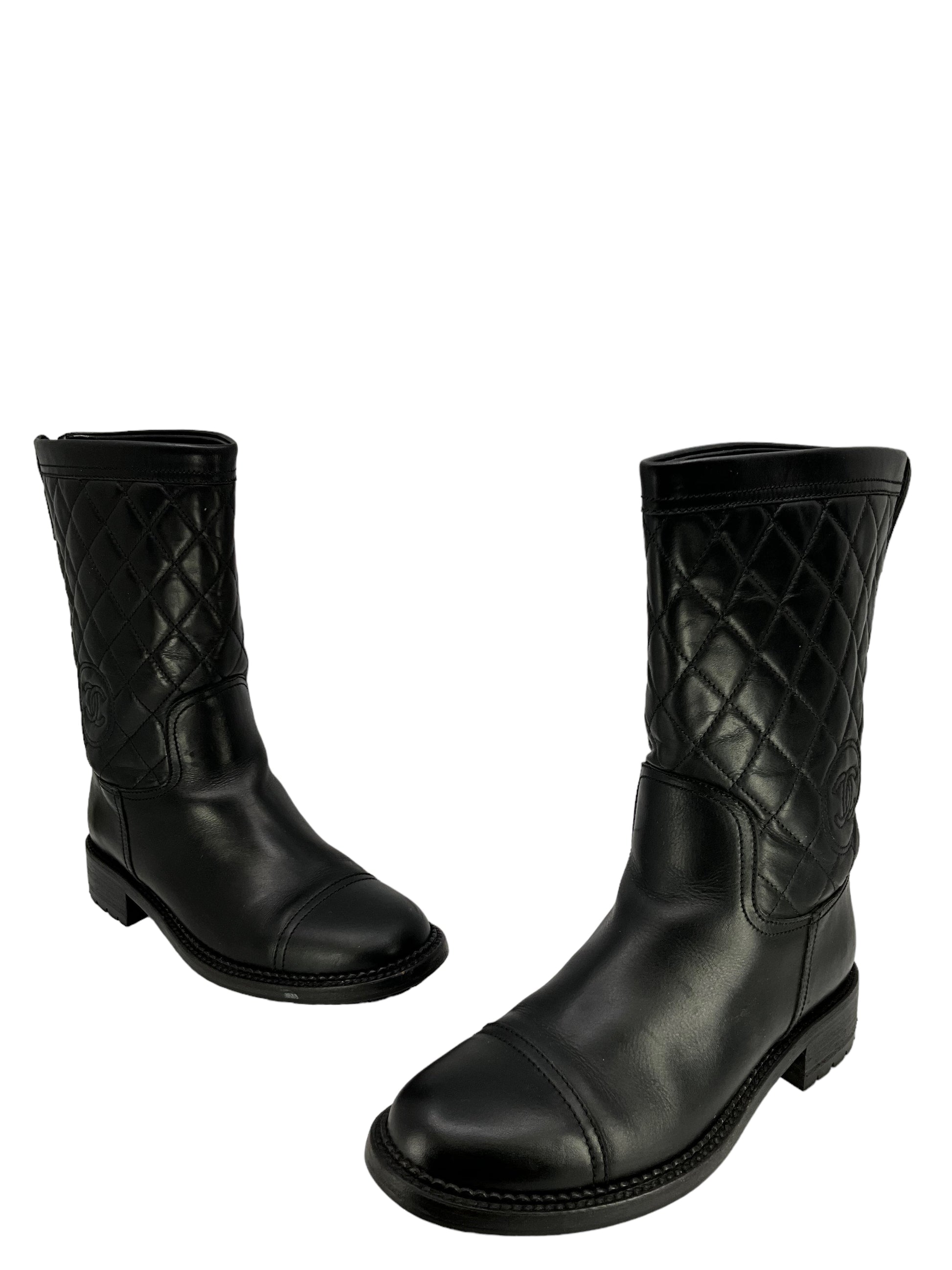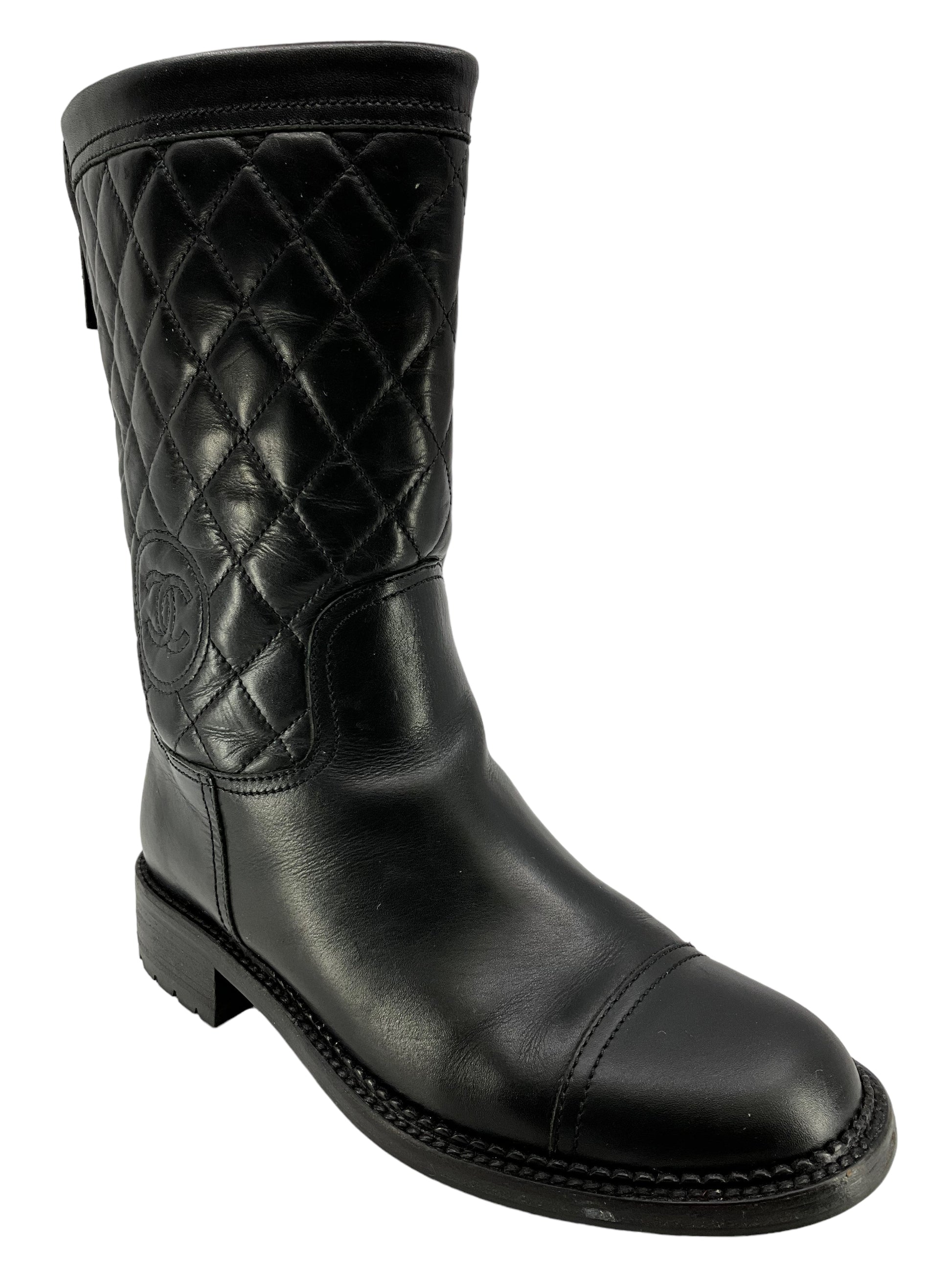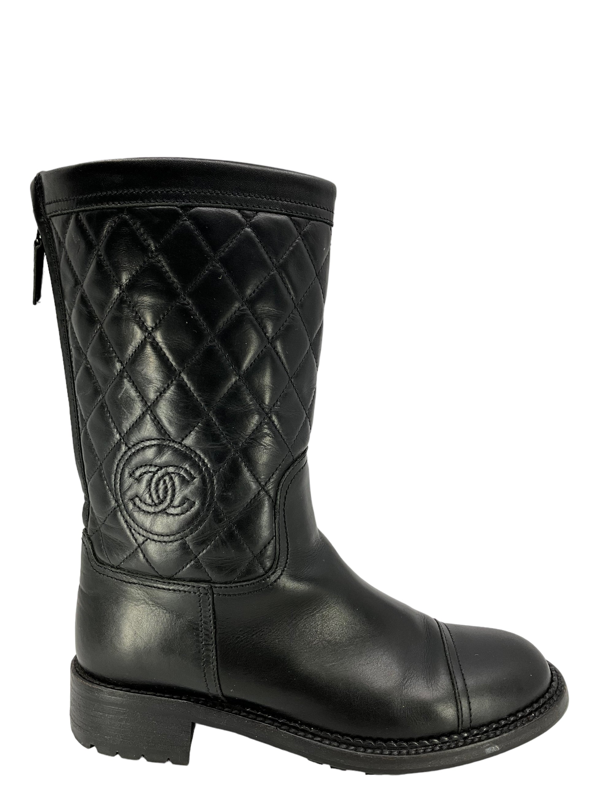We ity of these Chanel boots, size 8.5, crafted from the classic black quilted calfskin leather. These boots feature a "CC" logo on the side quilt, back zippers, round toe, 1.25in" heel, leather insoles and rubber soles. These boots come with the original box.