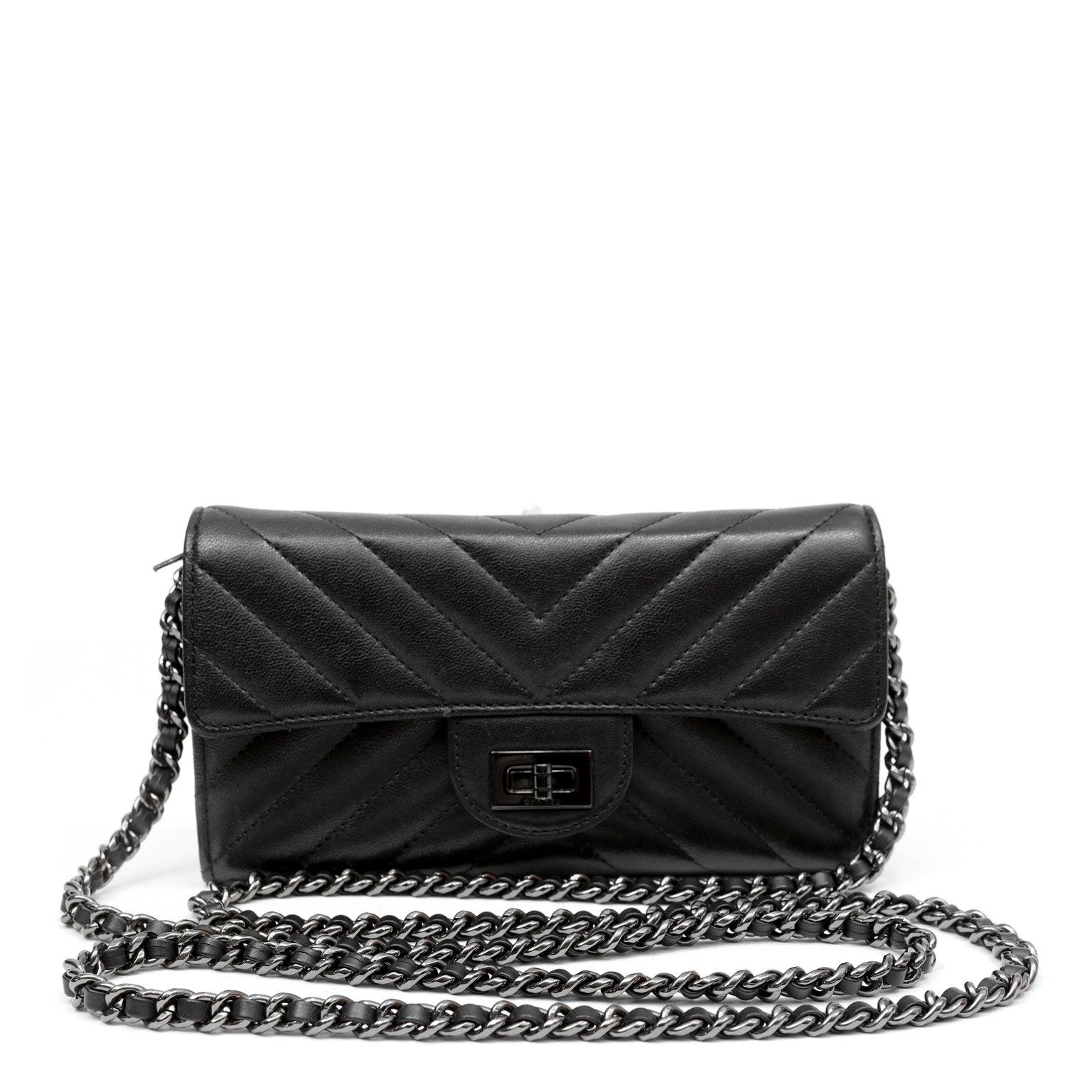 Black leather long wallet is quilted in chevron pattern. All black mademoiselle twist lock closure. Black leather interior has twelve card slots and a zippered section between dual open compartments. Extra-long leather and silver chain strap is comfortably carried across the body.Dust bag included.