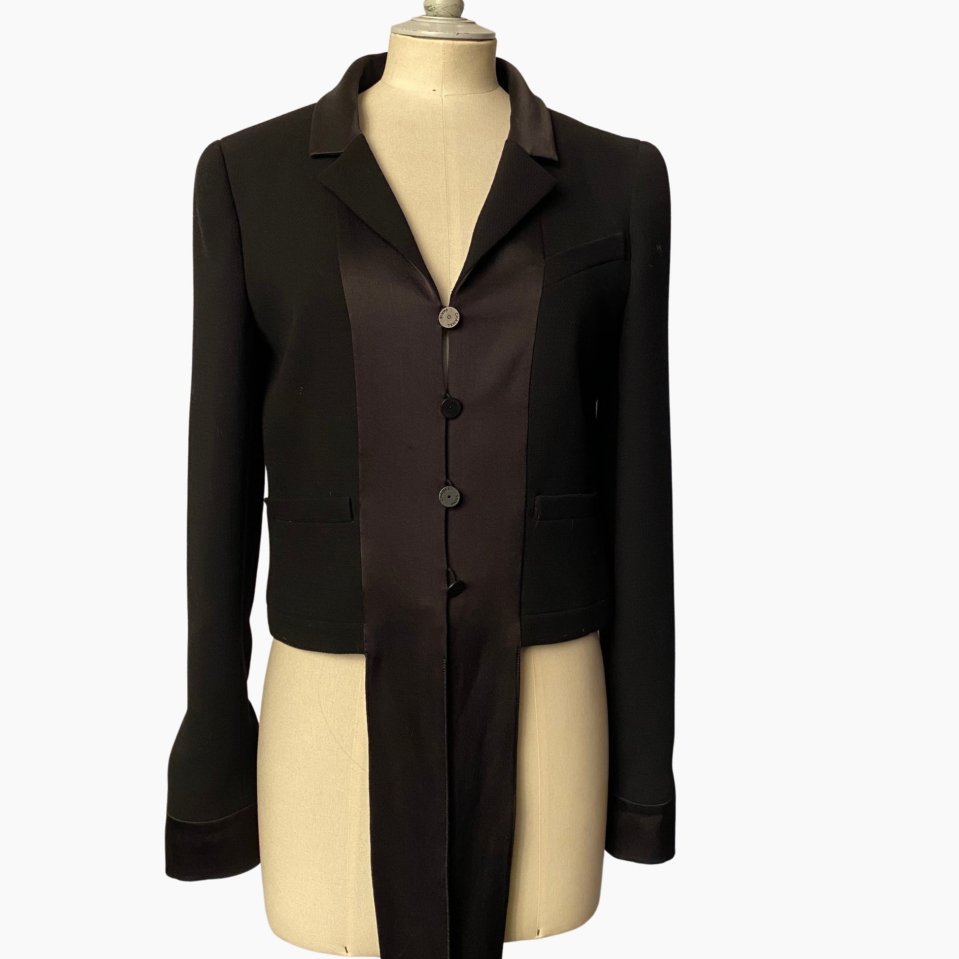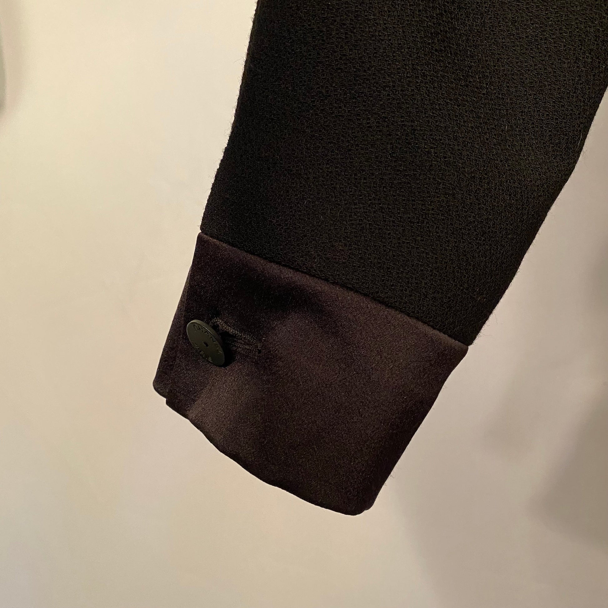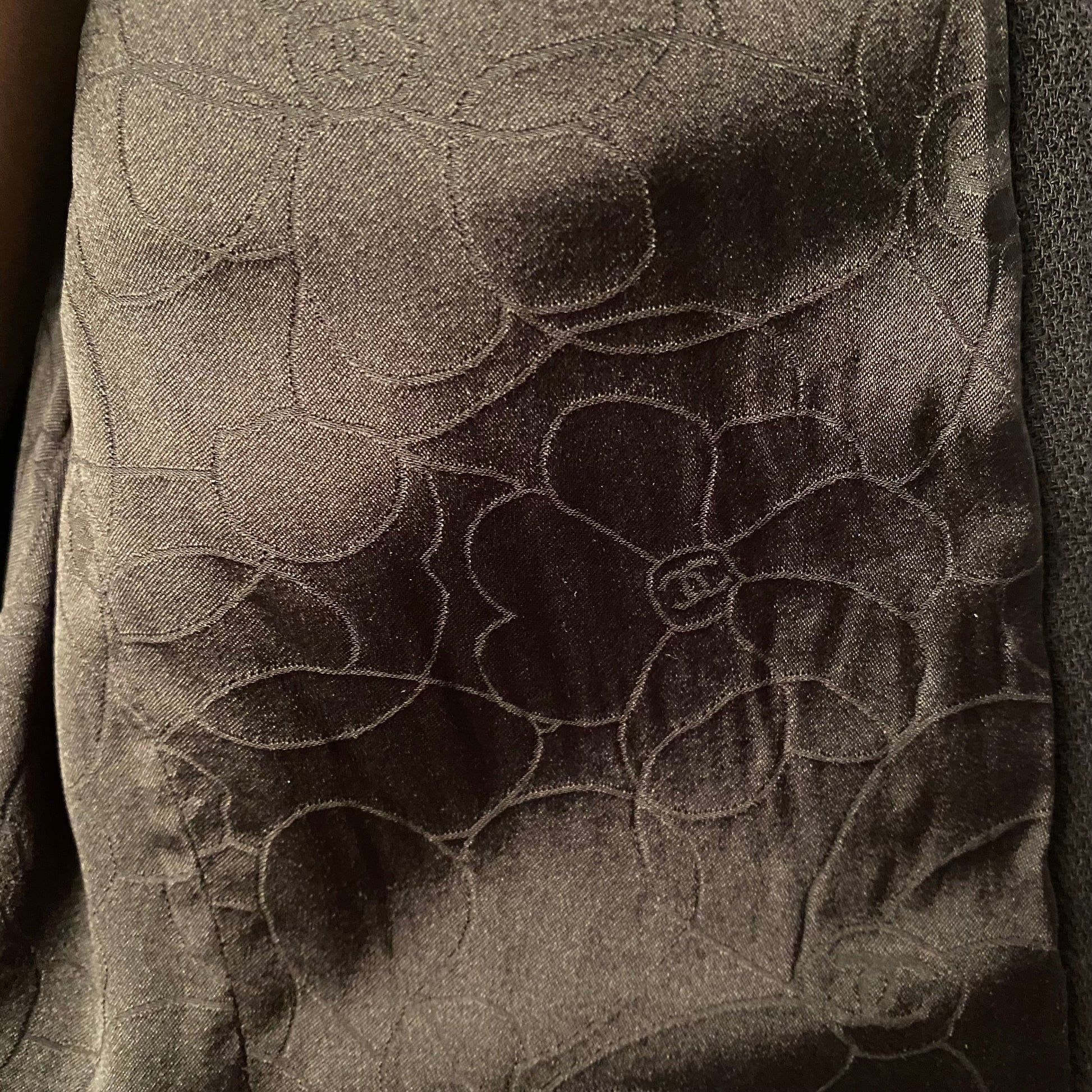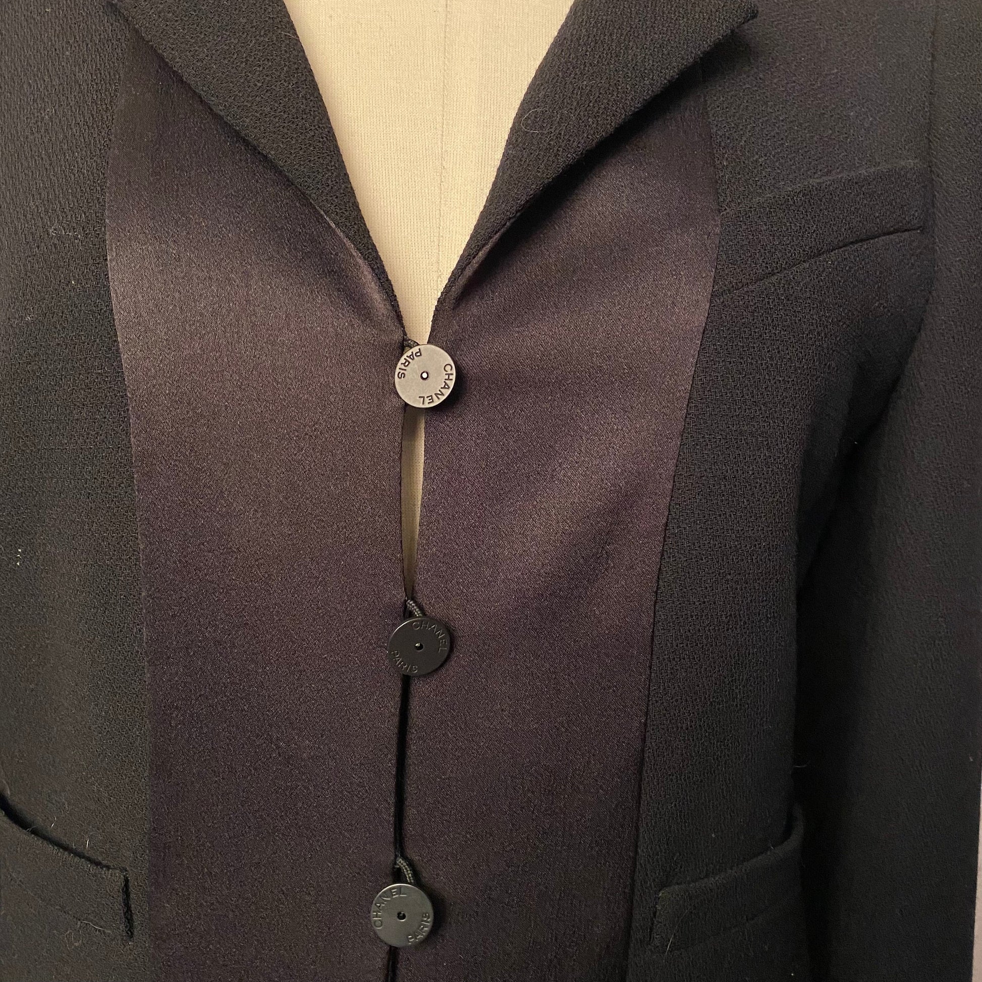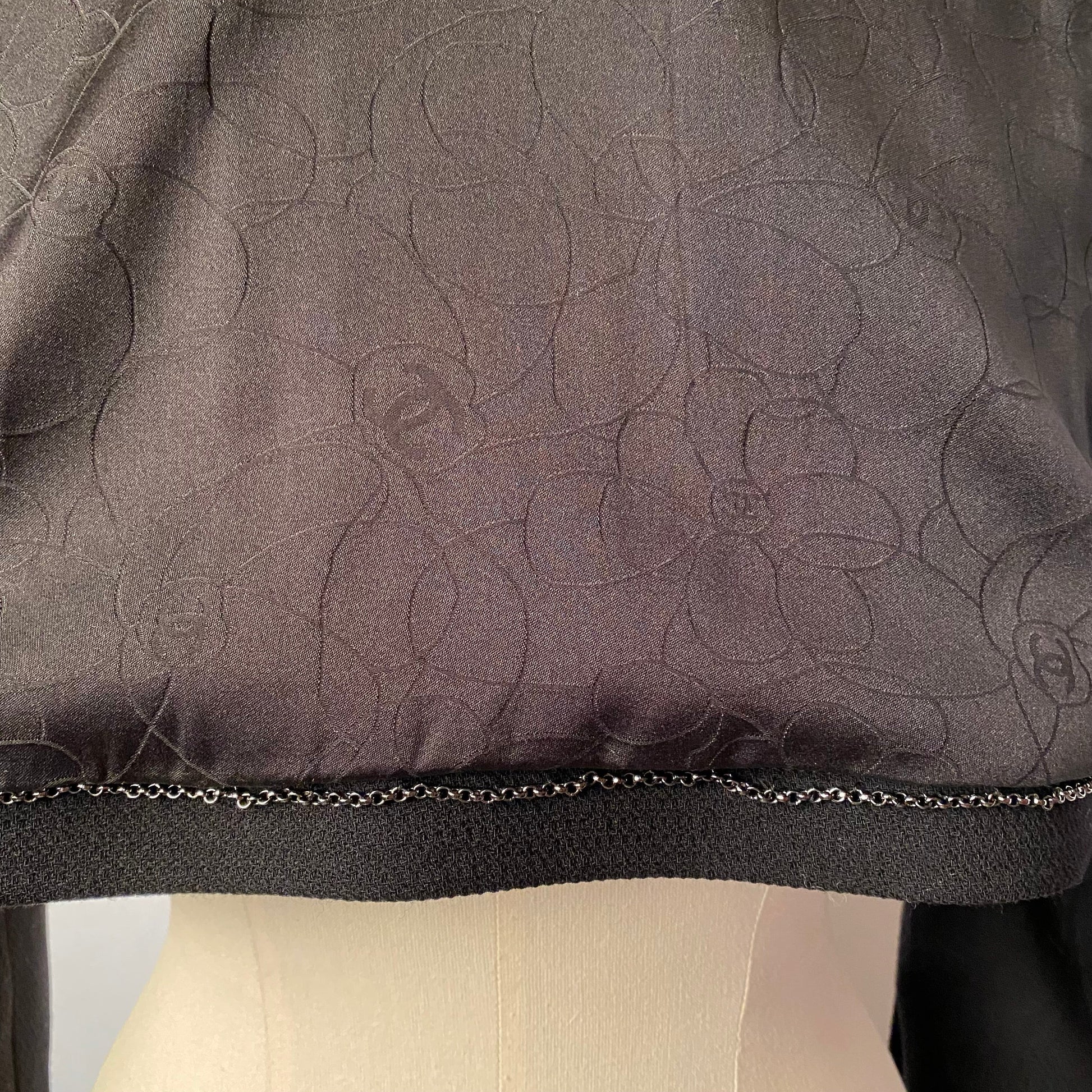 DESCRIPTION: Chanel black wool and silk jacket with two pockets and a silk ribbon. Silk trim on the sleeves and collar. Signature silver-toned chain trim along the interior hem and silk lining featuring camellia pattern. Buttons signed Chanel Paris