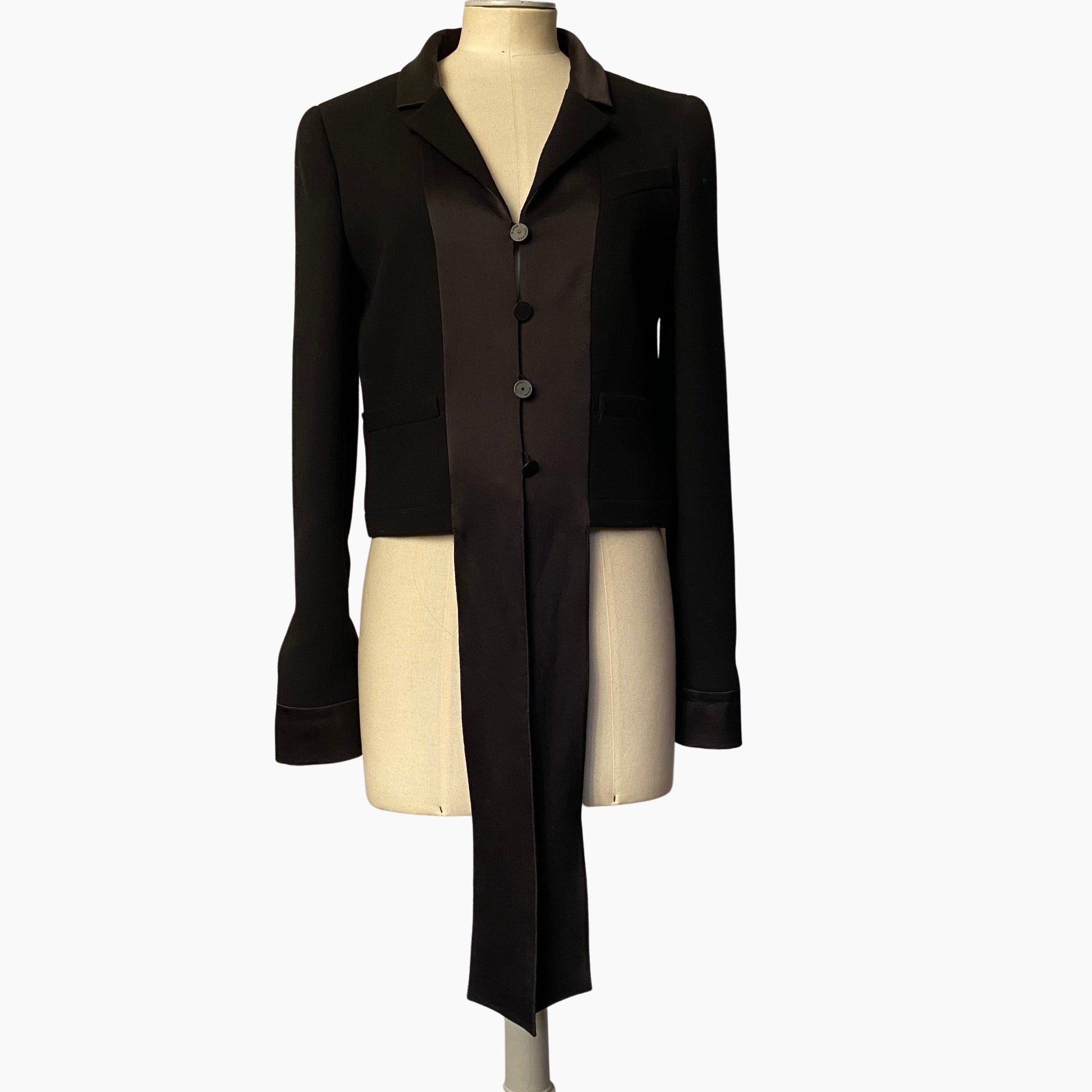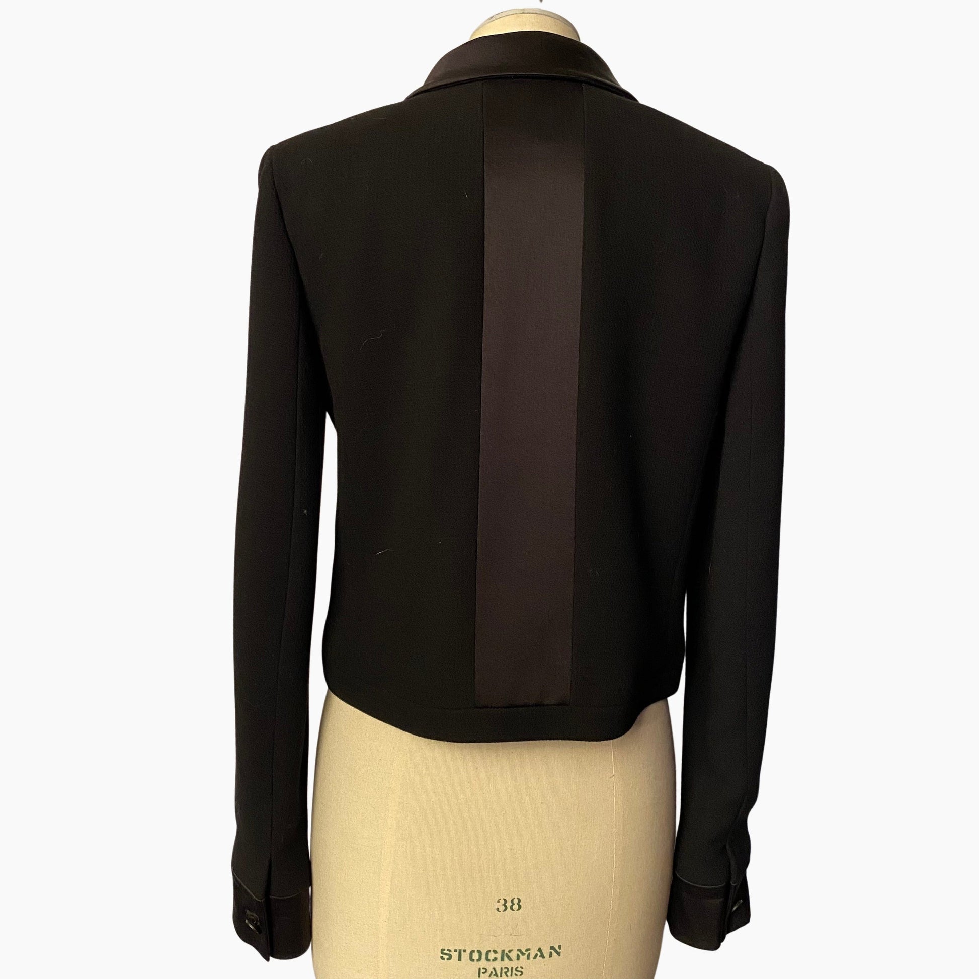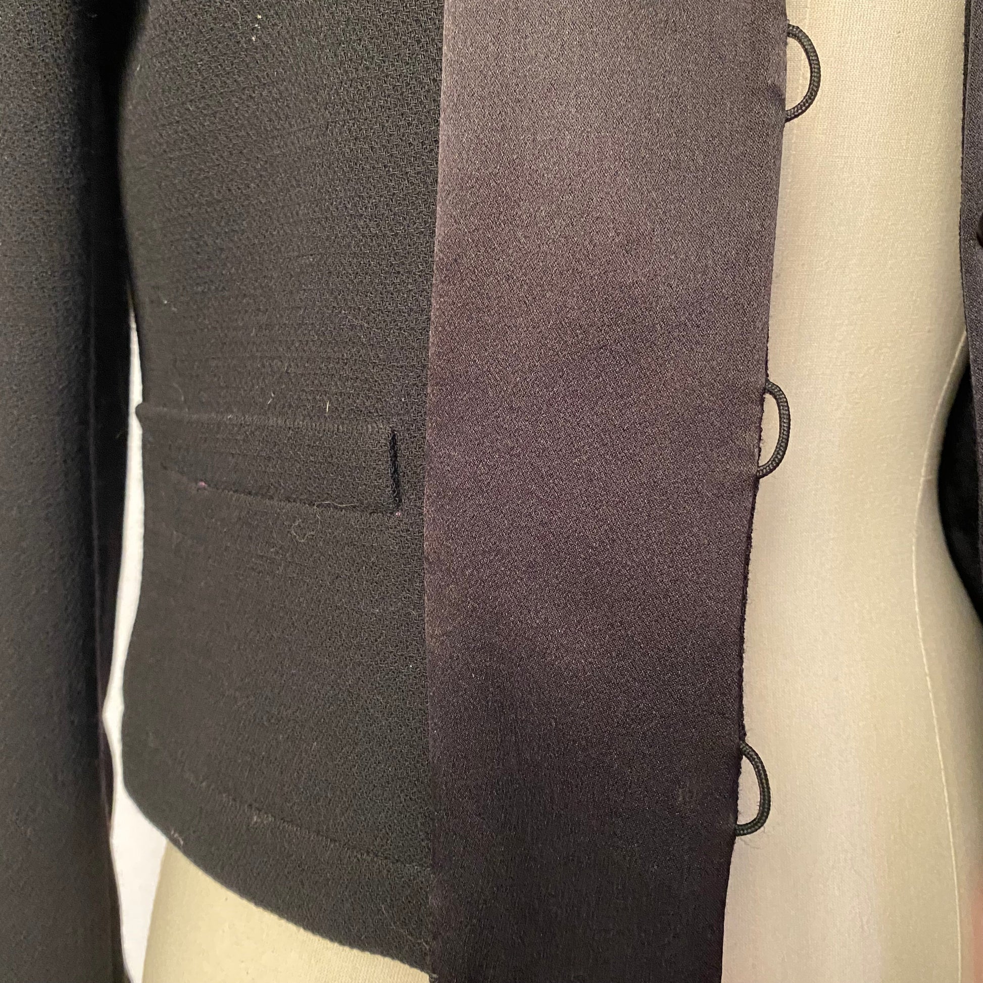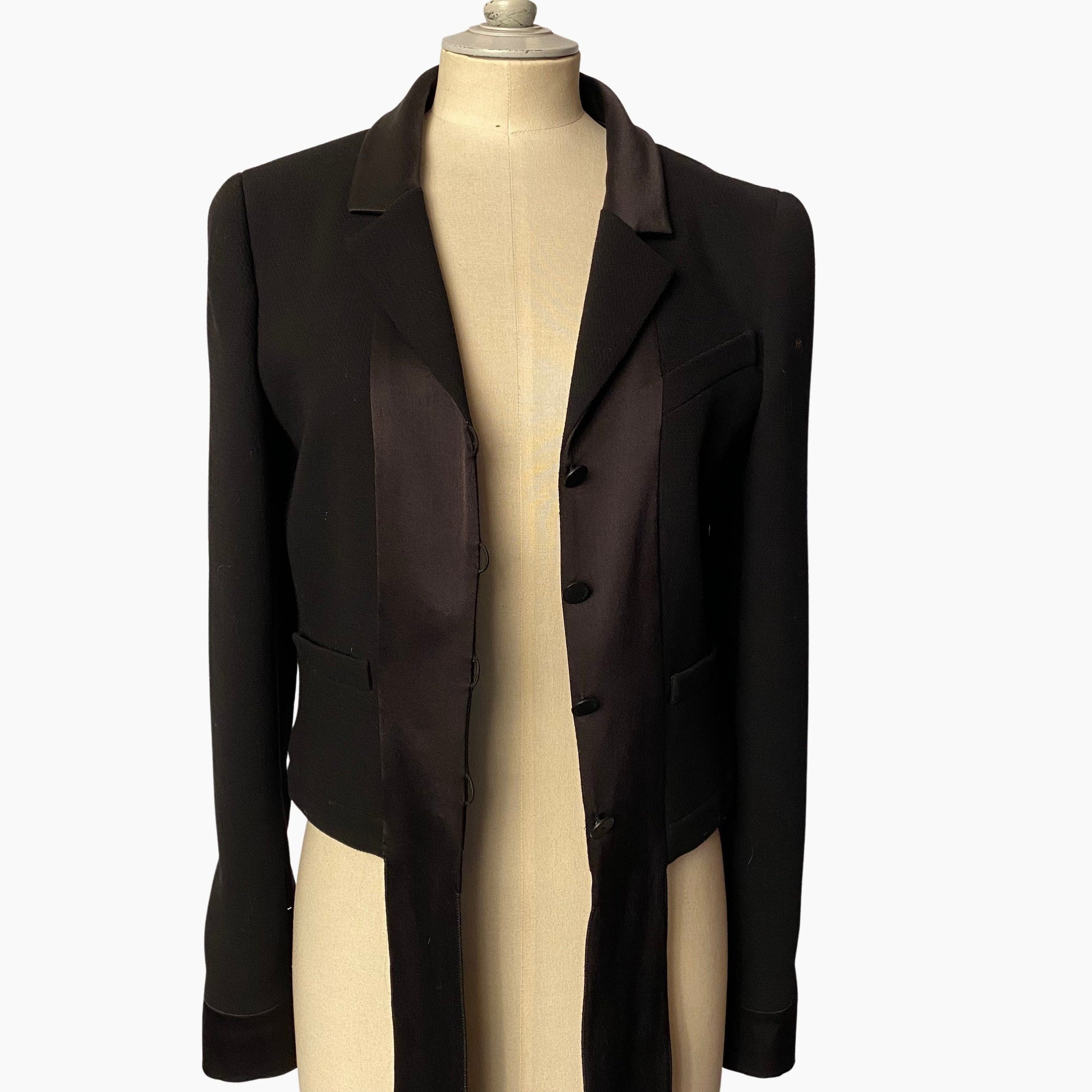 DESCRIPTION: Chanel black wool and silk jacket with two pockets and a silk ribbon. Silk trim on the sleeves and collar. Signature silver-toned chain trim along the interior hem and silk lining featuring camellia pattern. Buttons signed Chanel Paris