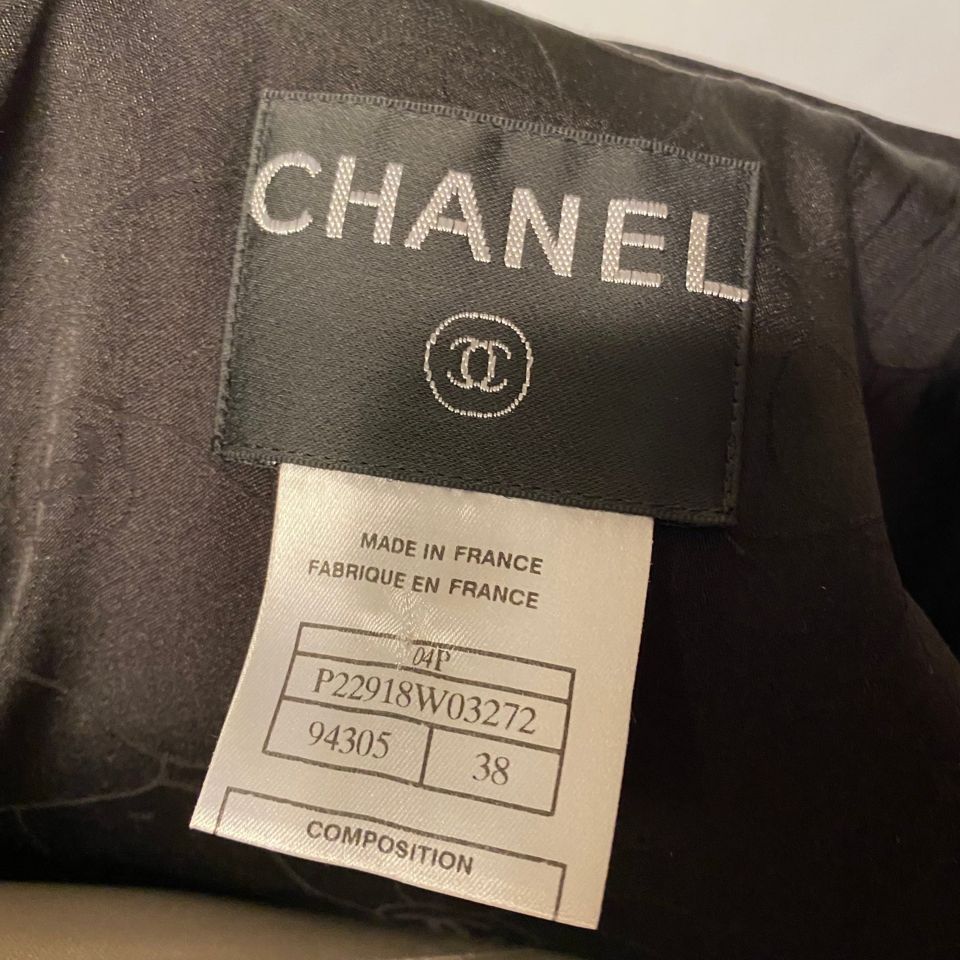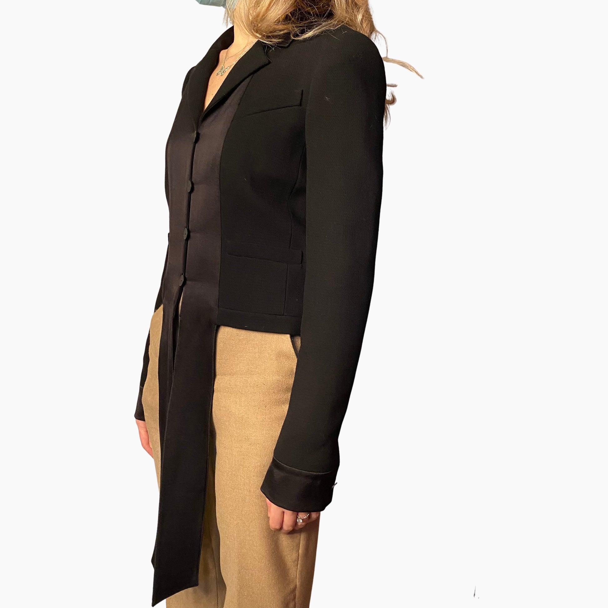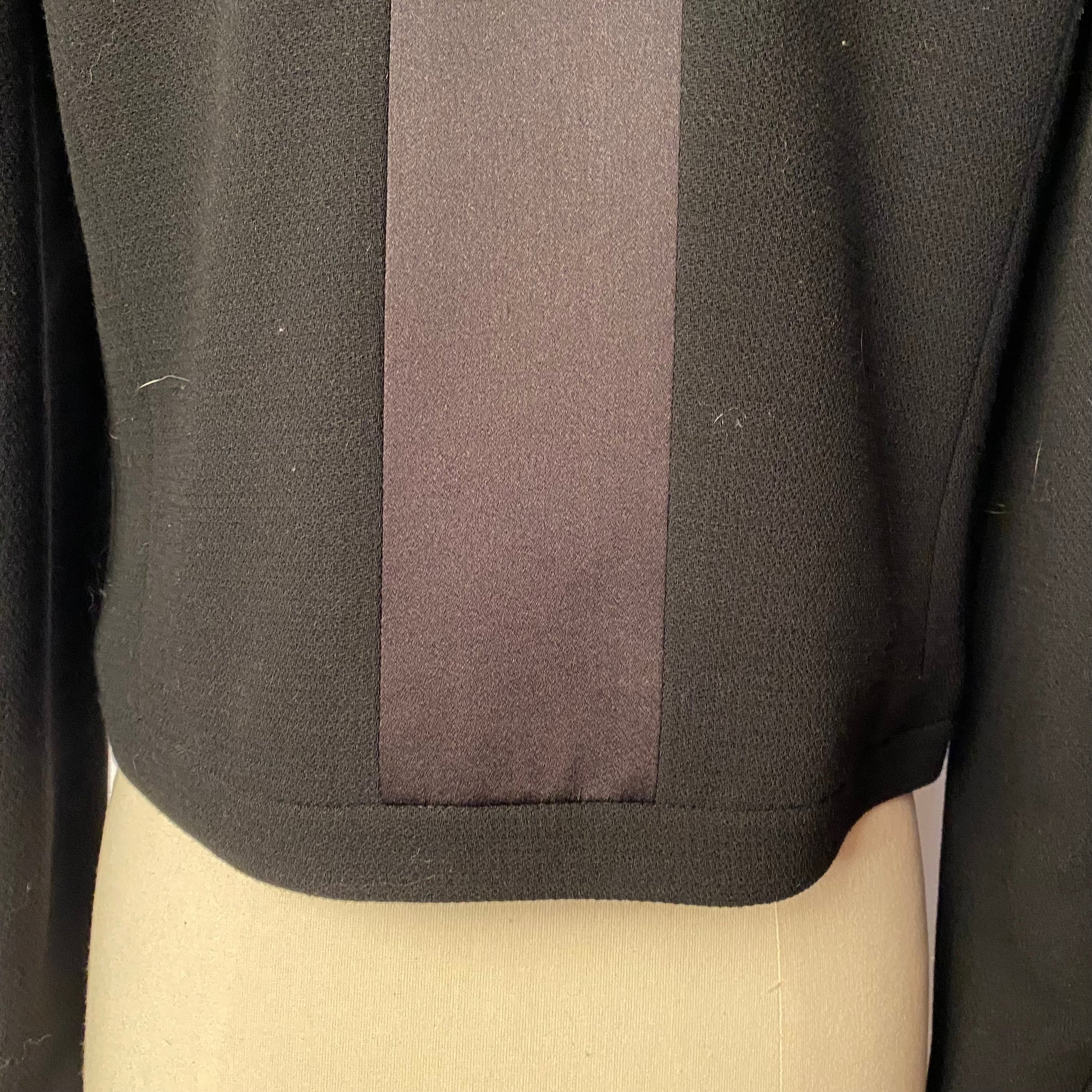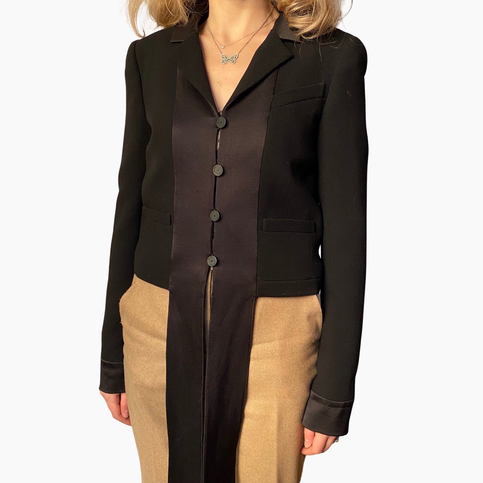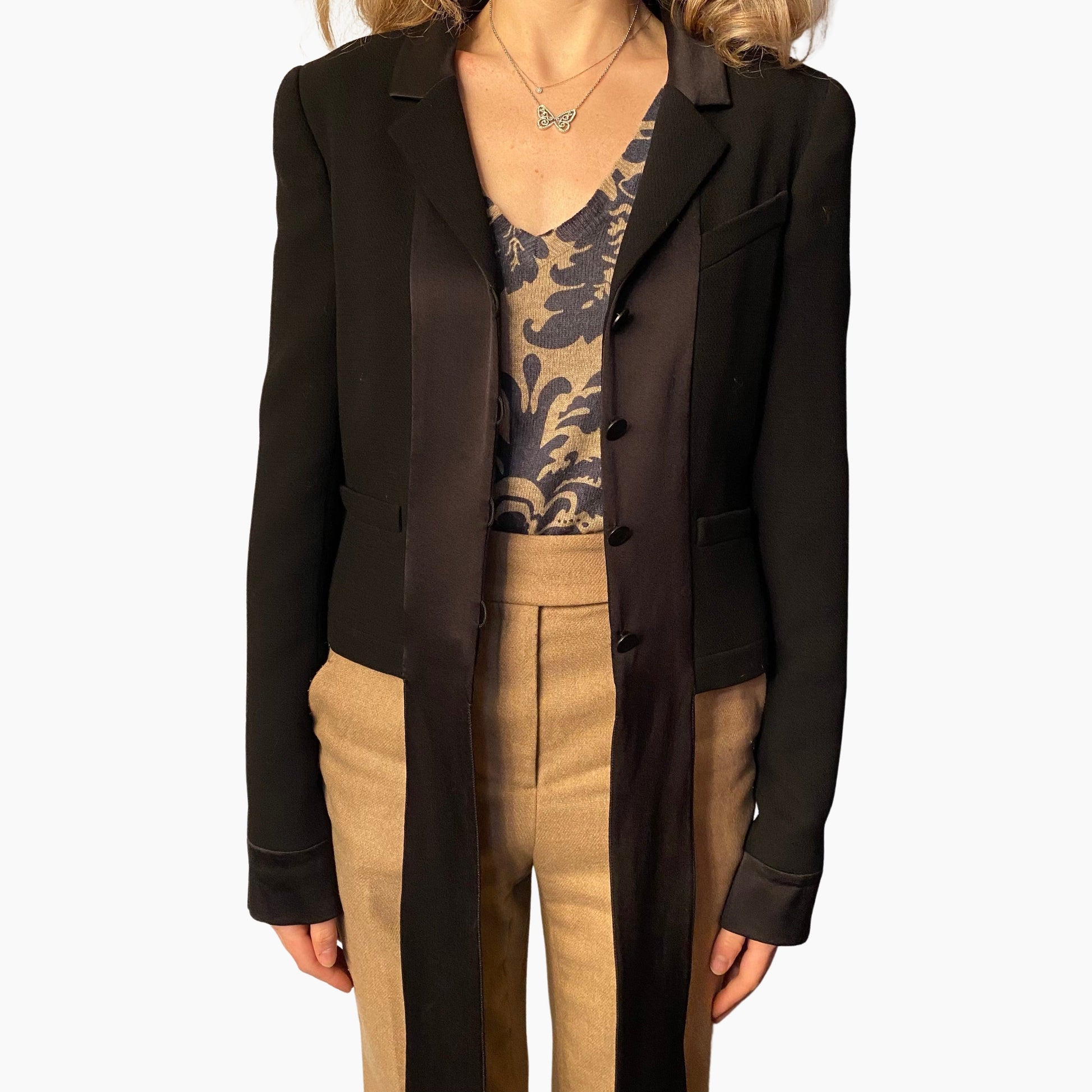 DESCRIPTION: Chanel black wool and silk jacket with two pockets and a silk ribbon. Silk trim on the sleeves and collar. Signature silver-toned chain trim along the interior hem and silk lining featuring camellia pattern. Buttons signed Chanel Paris