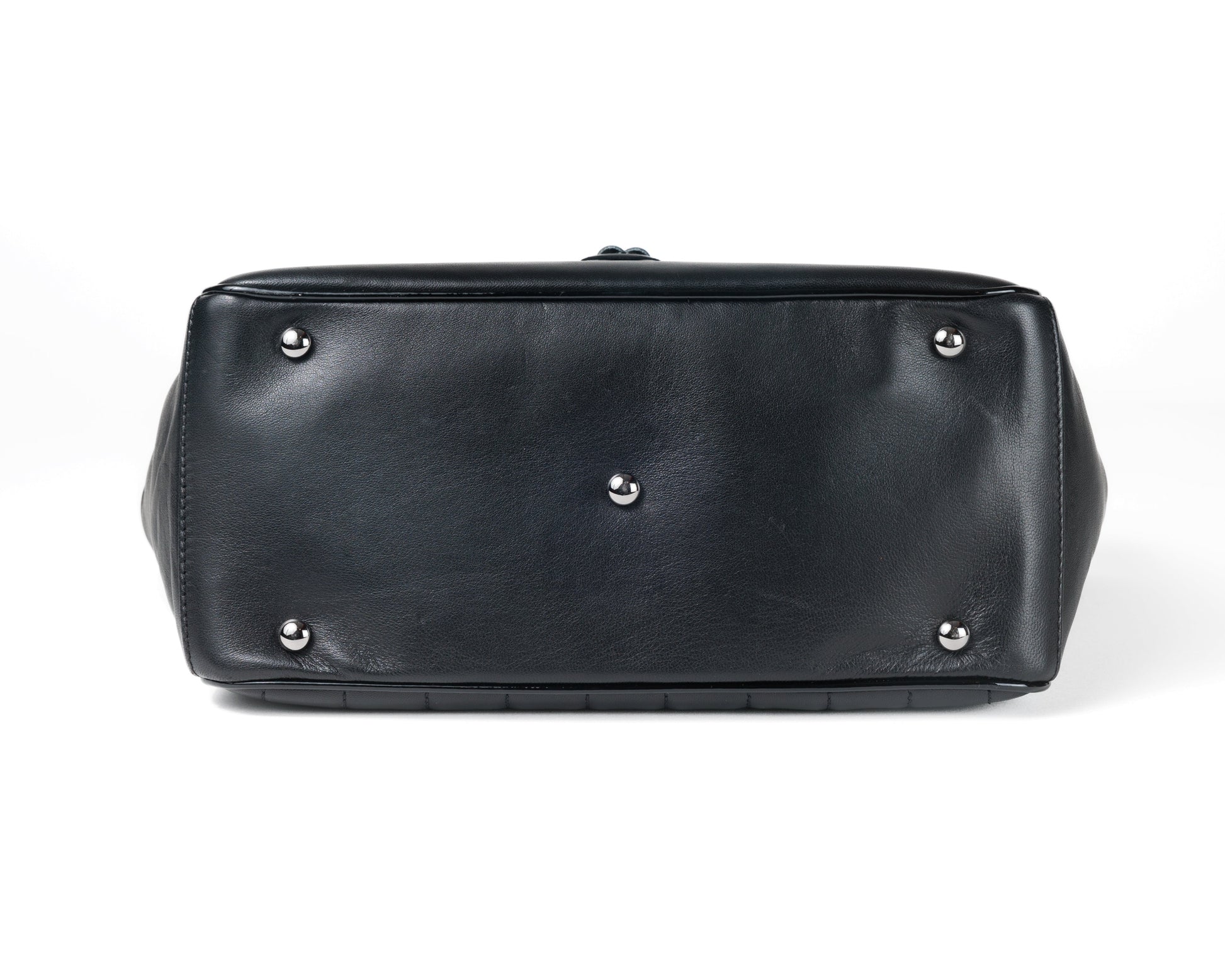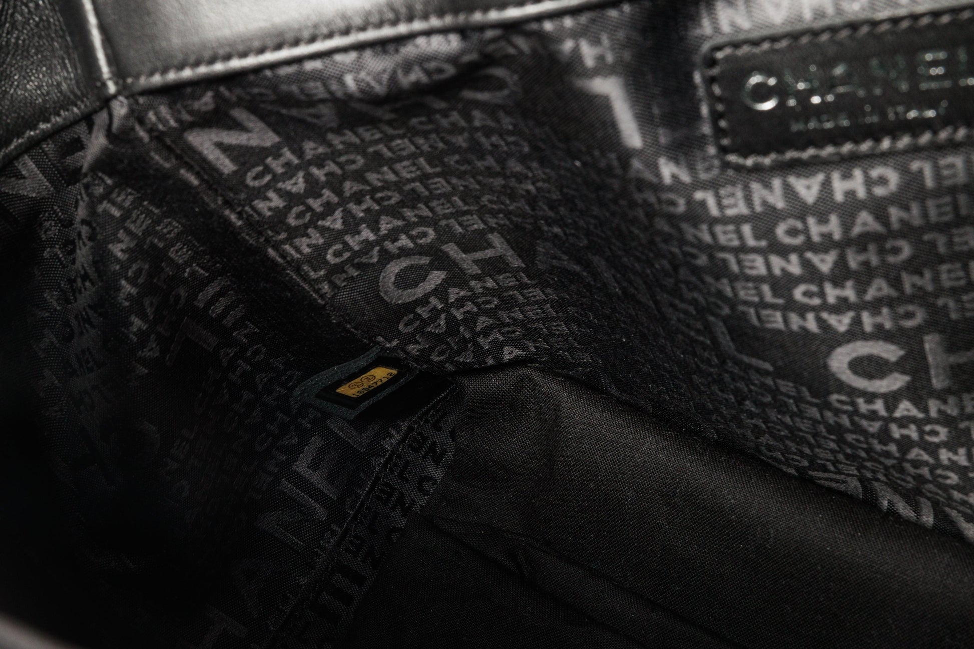 This Chanel Black Lambskin Camellia Mini Shopper is in excellent condition. Featuring chocolate bar stitching and iconic Chanel symbols, this elegant tote is a classic collectible. Black camellia flower, interlocking CC and numeral 5 are stitched on the front in black patent leather. Silver tone hardware, protective footed bottom and double straps that may be carried on the shoulder. Black monogram fabric lining. Made in Italy. Dust bag included.