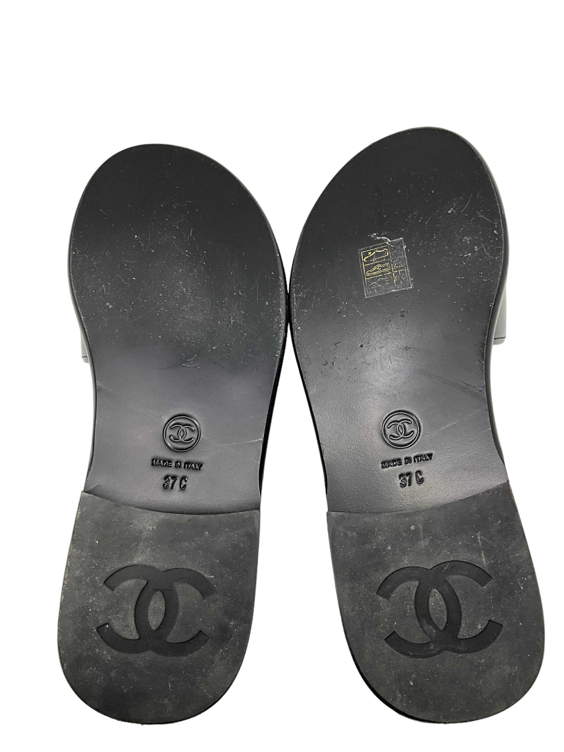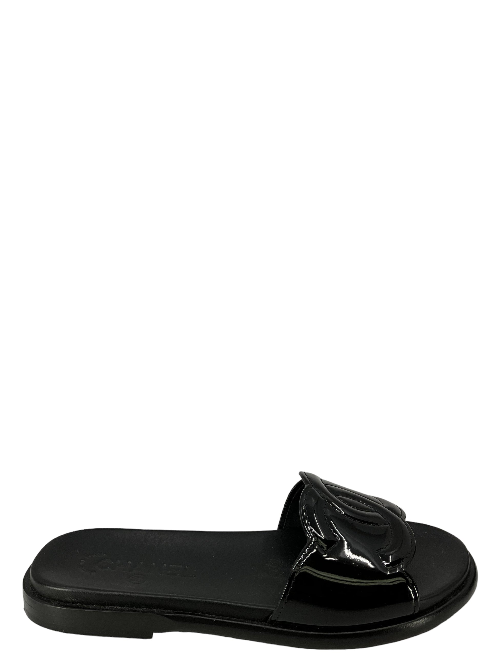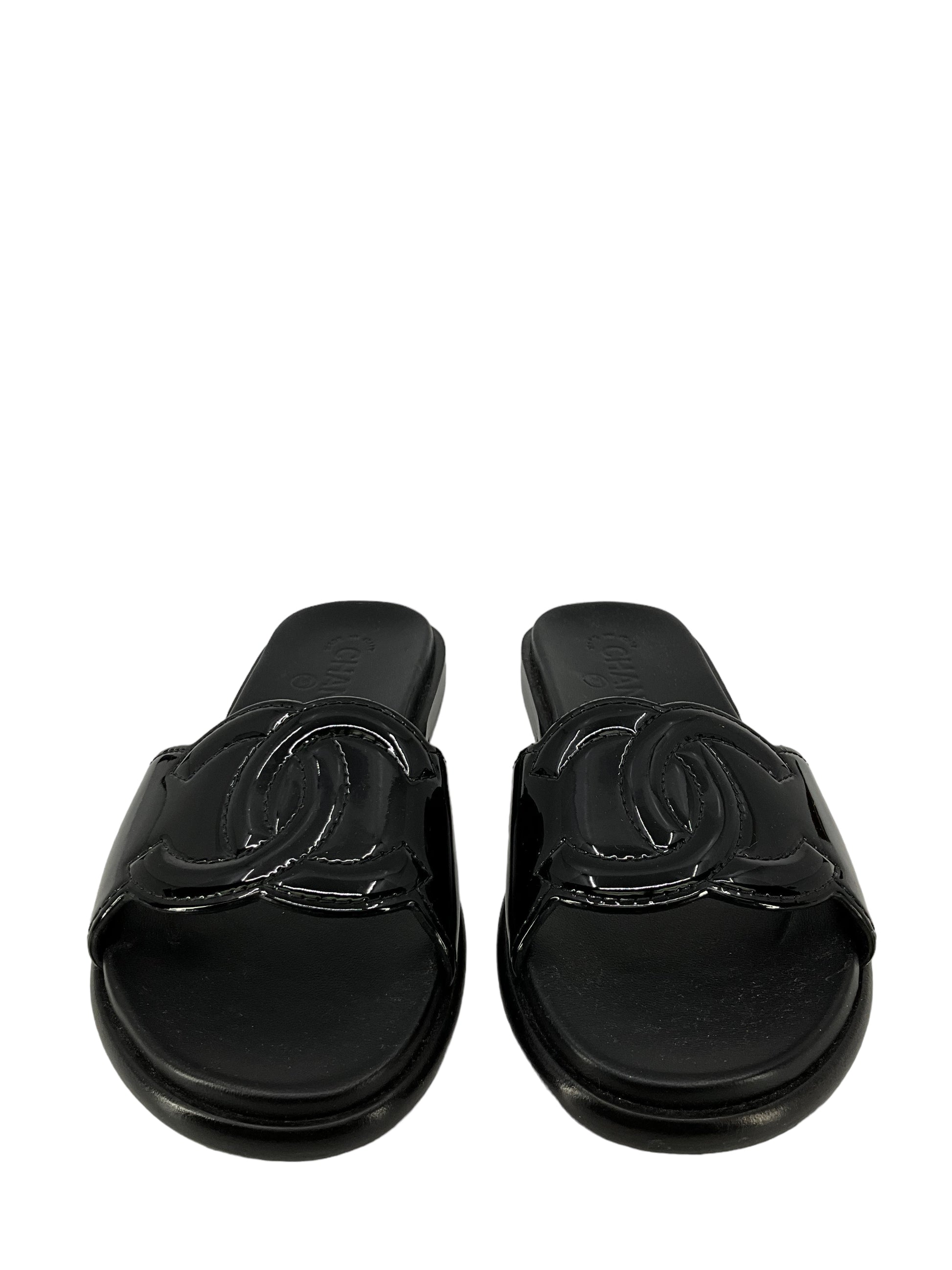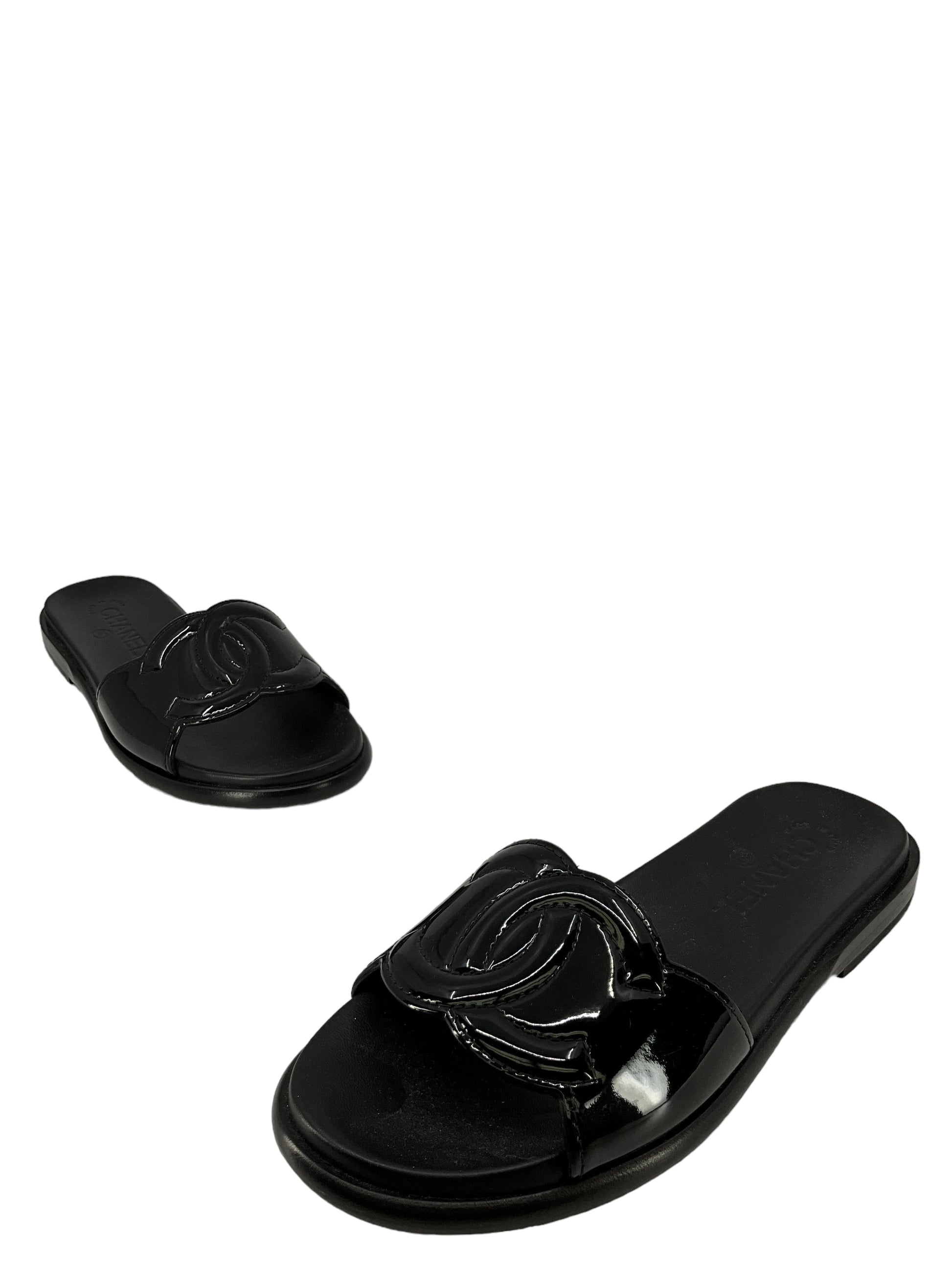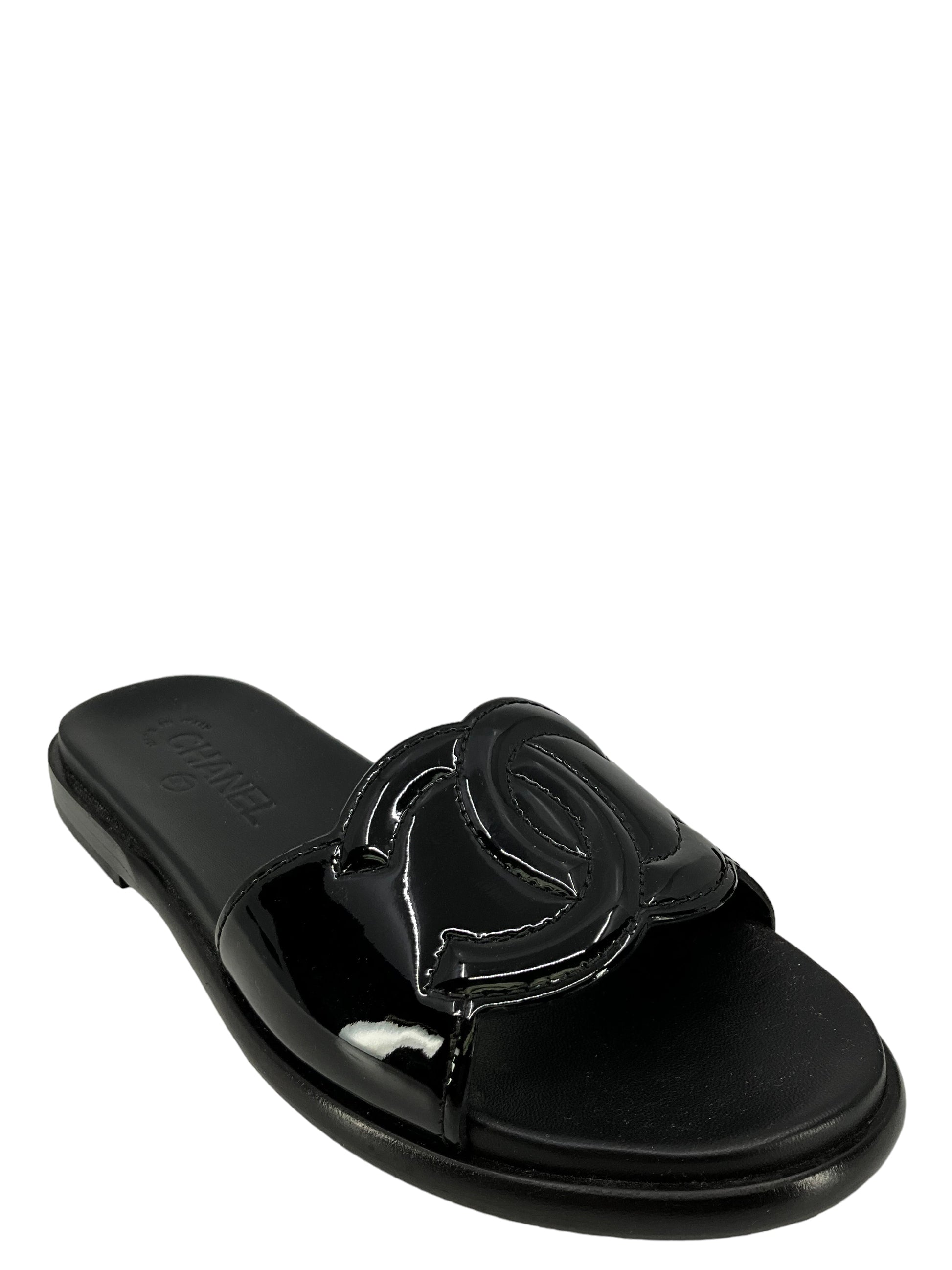 We ity of these Chanel sandals, size?7 I EU 37, Crafted from black leather and patent leather. These sandals feature the classic "CC" logo, a low heel, leather insoles and leather soles.?