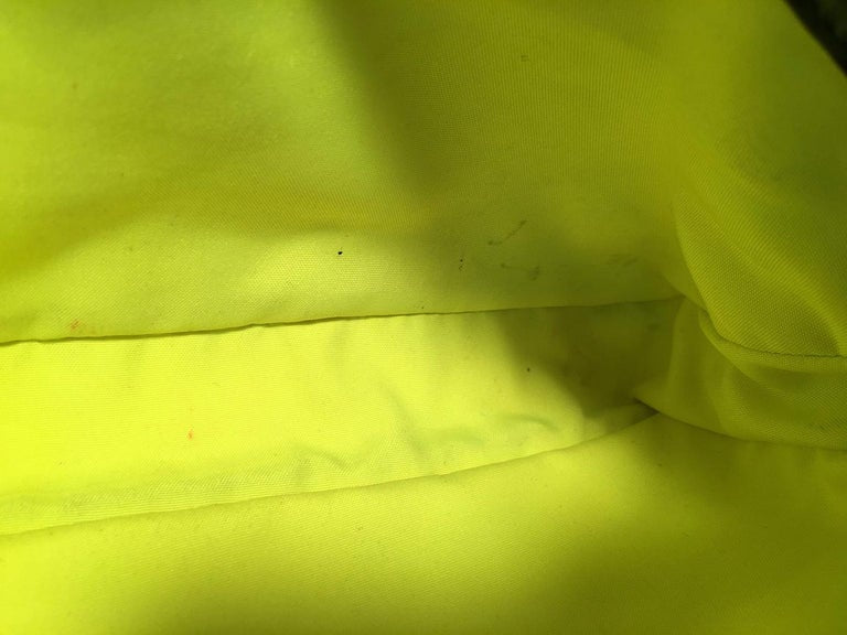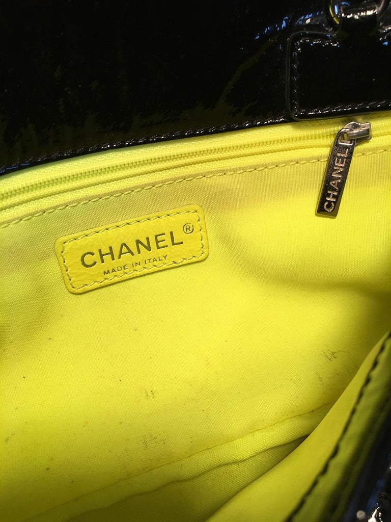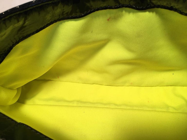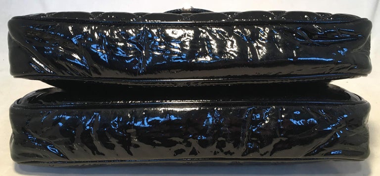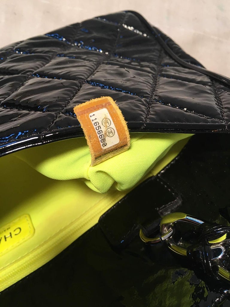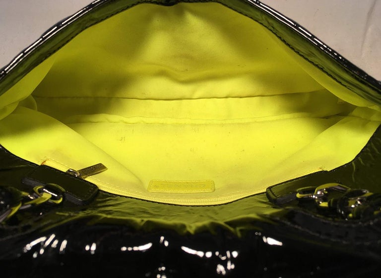 Chanel Black Patent Leather 2 way Classic Flap Shoulder Bag in very New condition. Black quilted patent leather exterior trimmed with silver hardware. 2 separate compartments each with their own top flap closure. Front compartment features signature CC twisting logo closure. Both compartments are lined in neon yellow nylon. Front compartment holds one side zipped pocket and hologram. Clean corners and edges. Light wear inside consistent with age and gentle use, see photos for details. Delicate spots and makeup marks throughout interiors. Unique design no longer made or available in stores. Purchase includes a dust cover. Measurements: 12.5"x8"x5" 8.5" strap drop