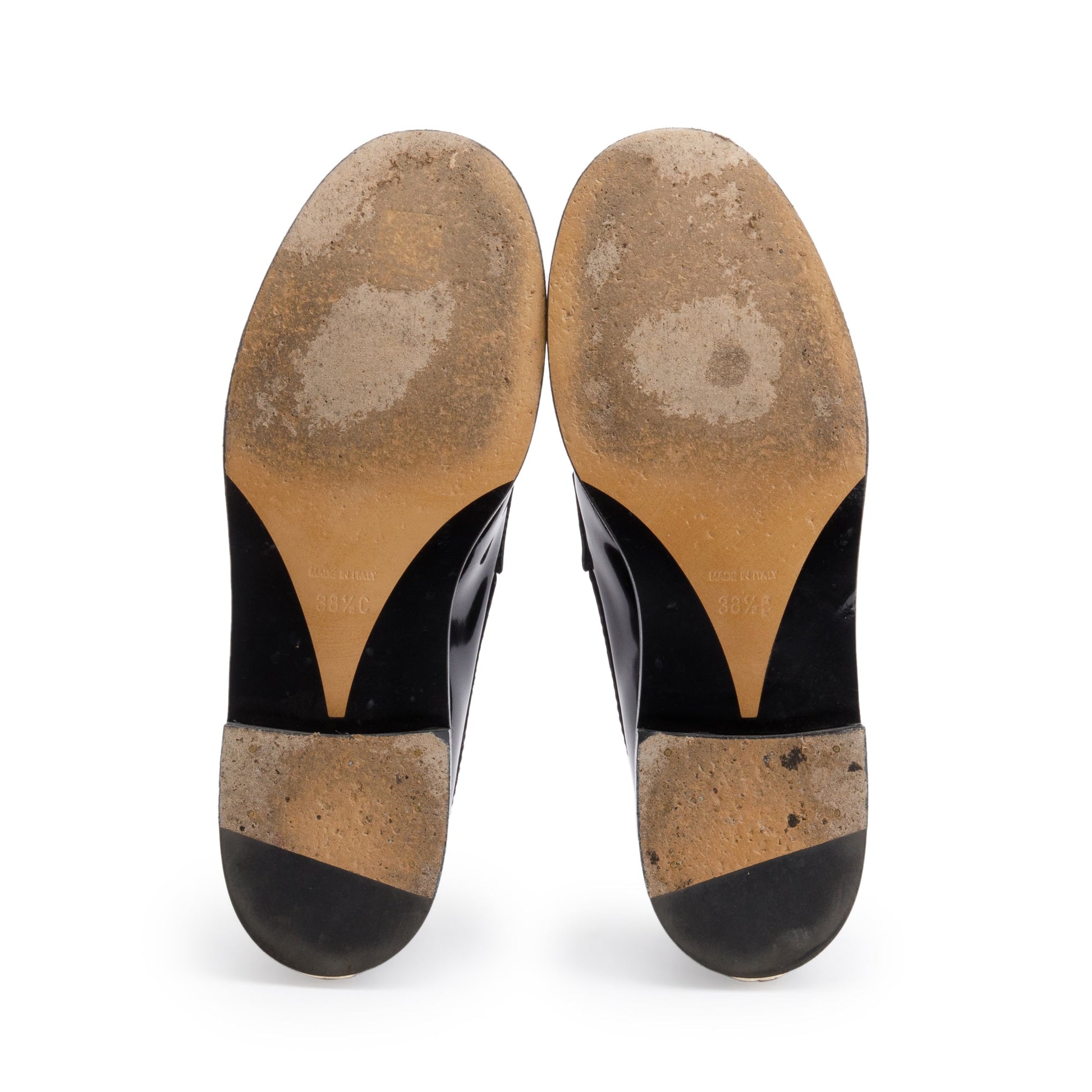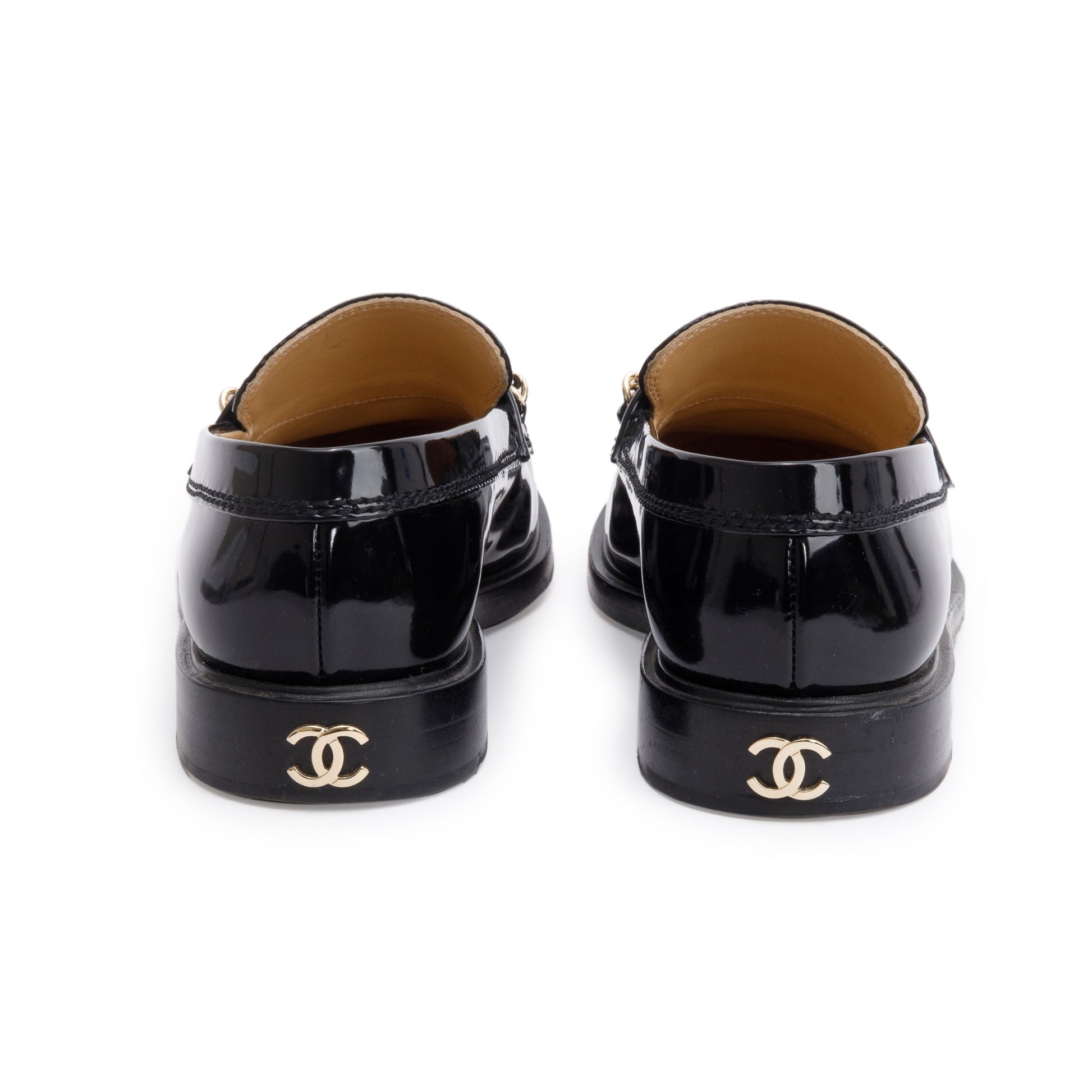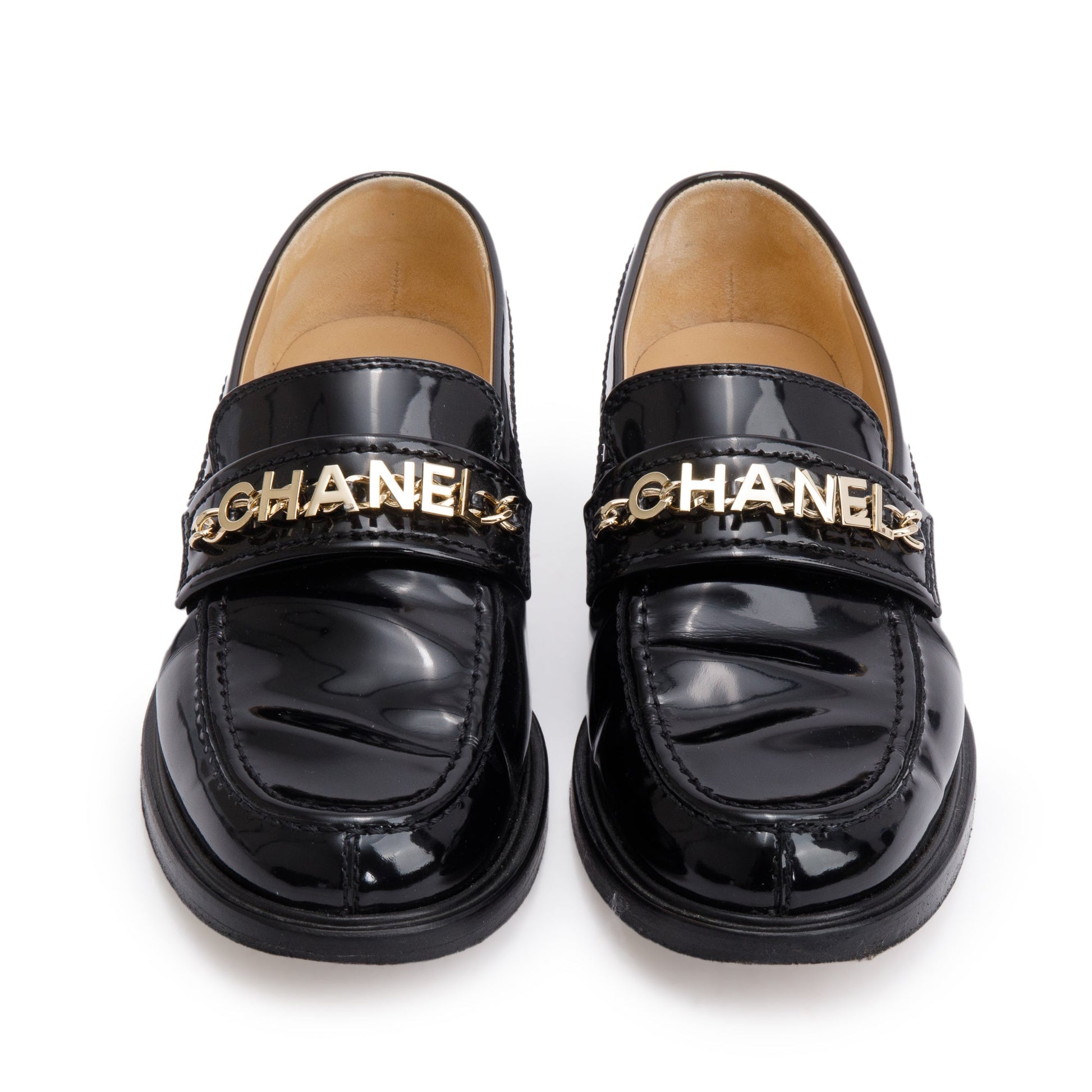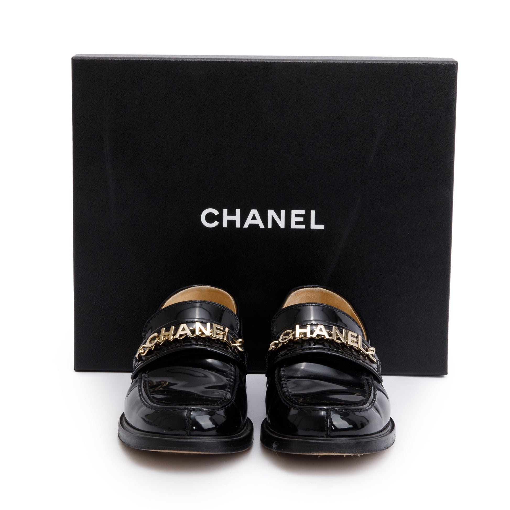 Chanel Black Patent Leather Chain Logo Loafer, Size 38.5 w/ Box