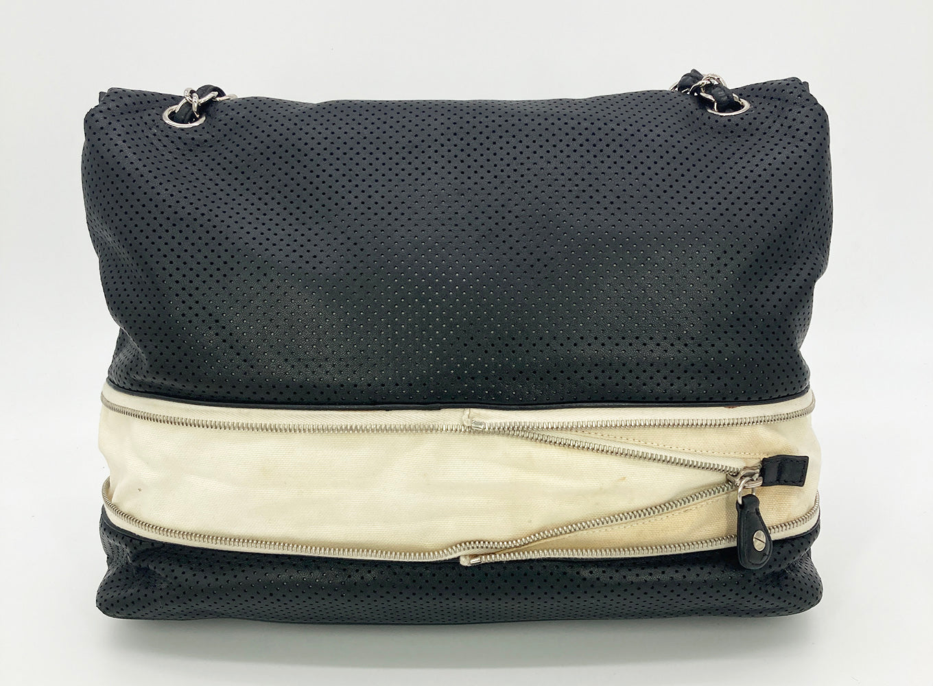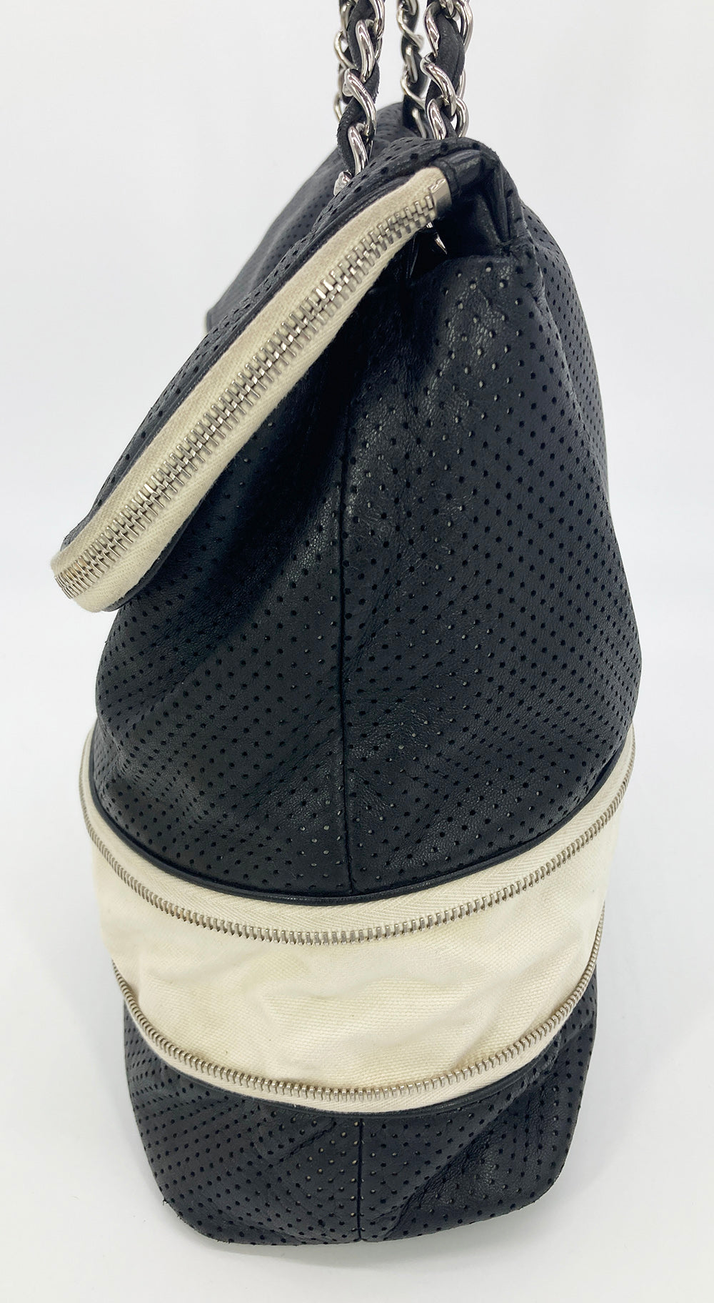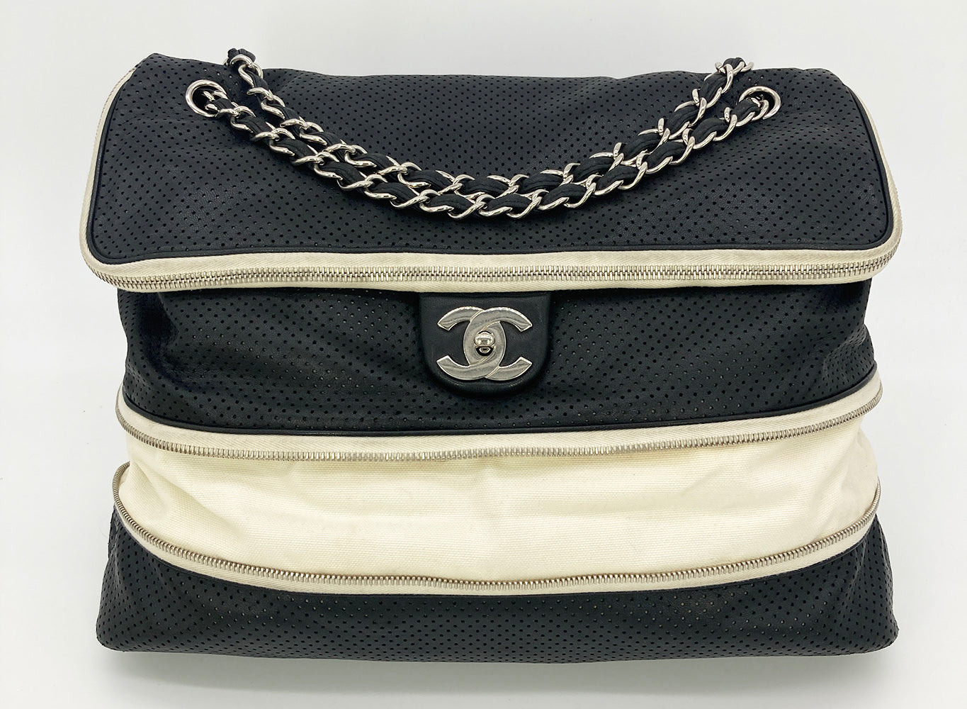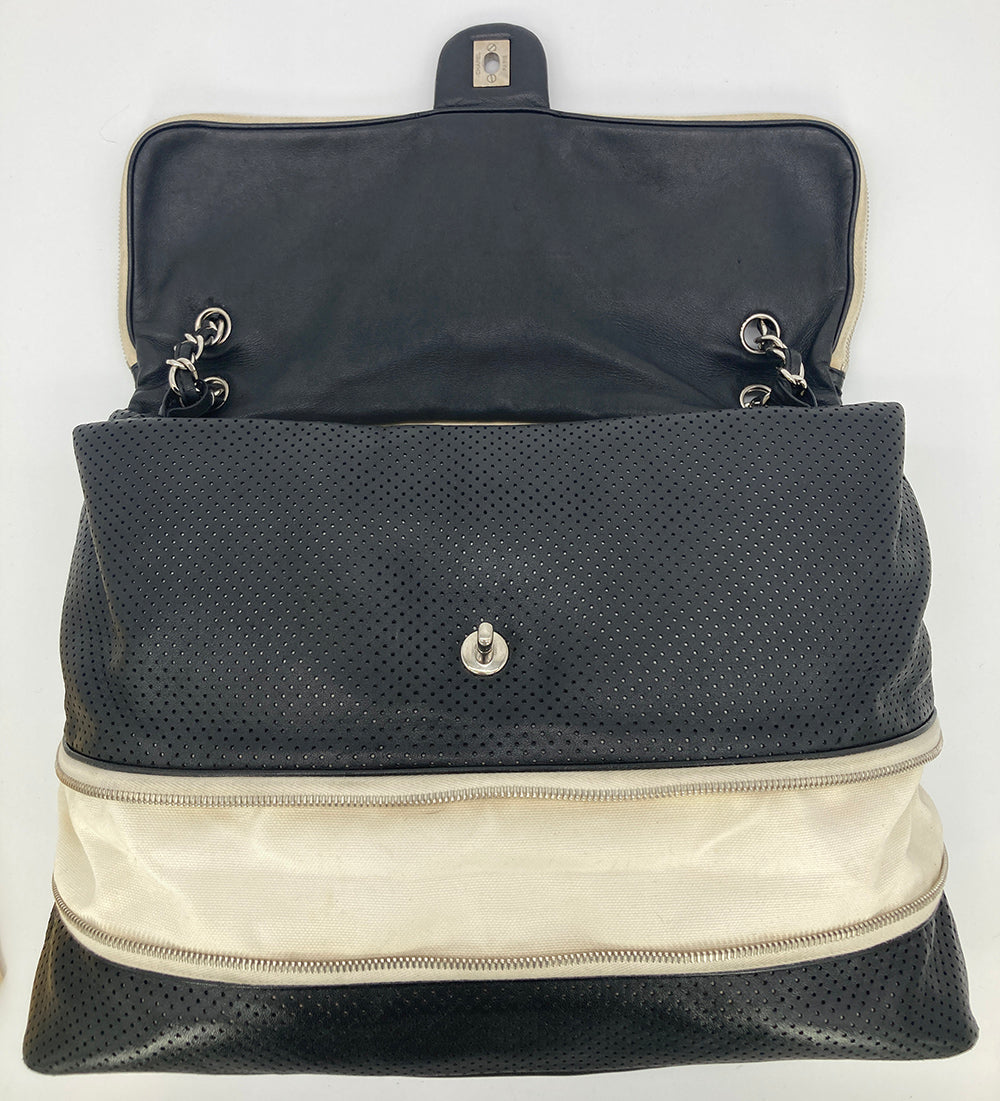 Chanel Black Perforated Leather Expandable Classic Flap Shoulder Bag in fair condition. Black perforated leather trimmed with cream canvas and silver hardware. Unique expandable zipper feature opens the body about 2 inches around with a full zipper surrounding. Twist CC lock closure opens via top flap to a cream canvas lined interior with one zipped and 2 side slit pockets. Overall fair condition. clean corners and edges. stains and discolorations around zipper trim, canvas expandable portion and interior lining. see photos for details. purchase includes a dust cover. measurements: 14"x11-13"x4.5" 7.5-13" strap drop