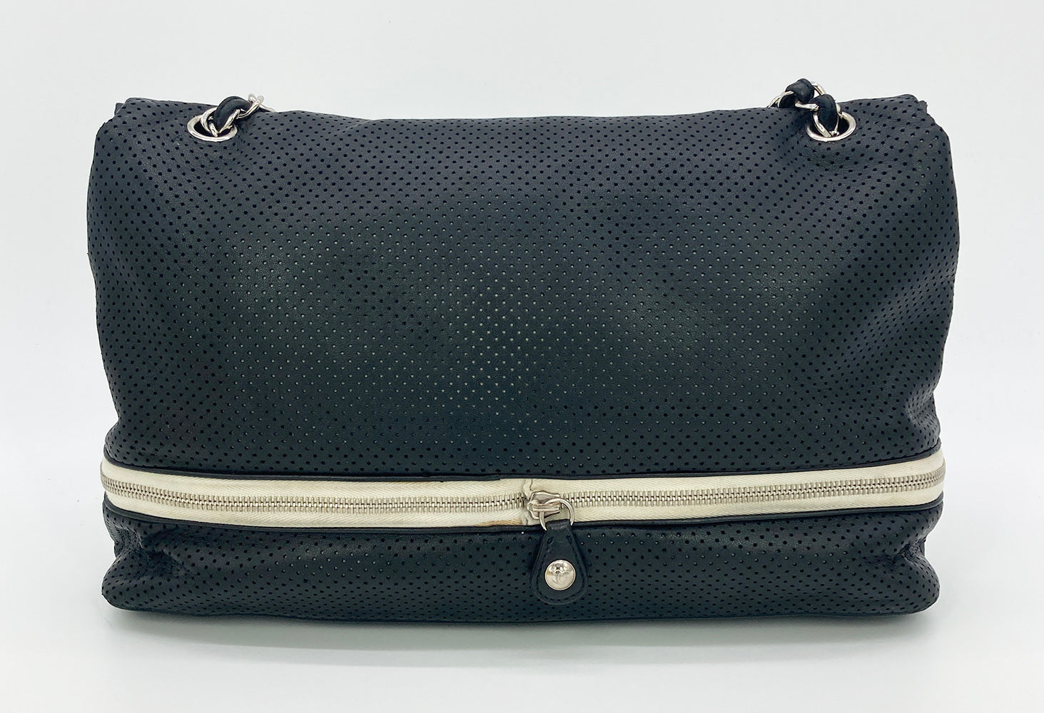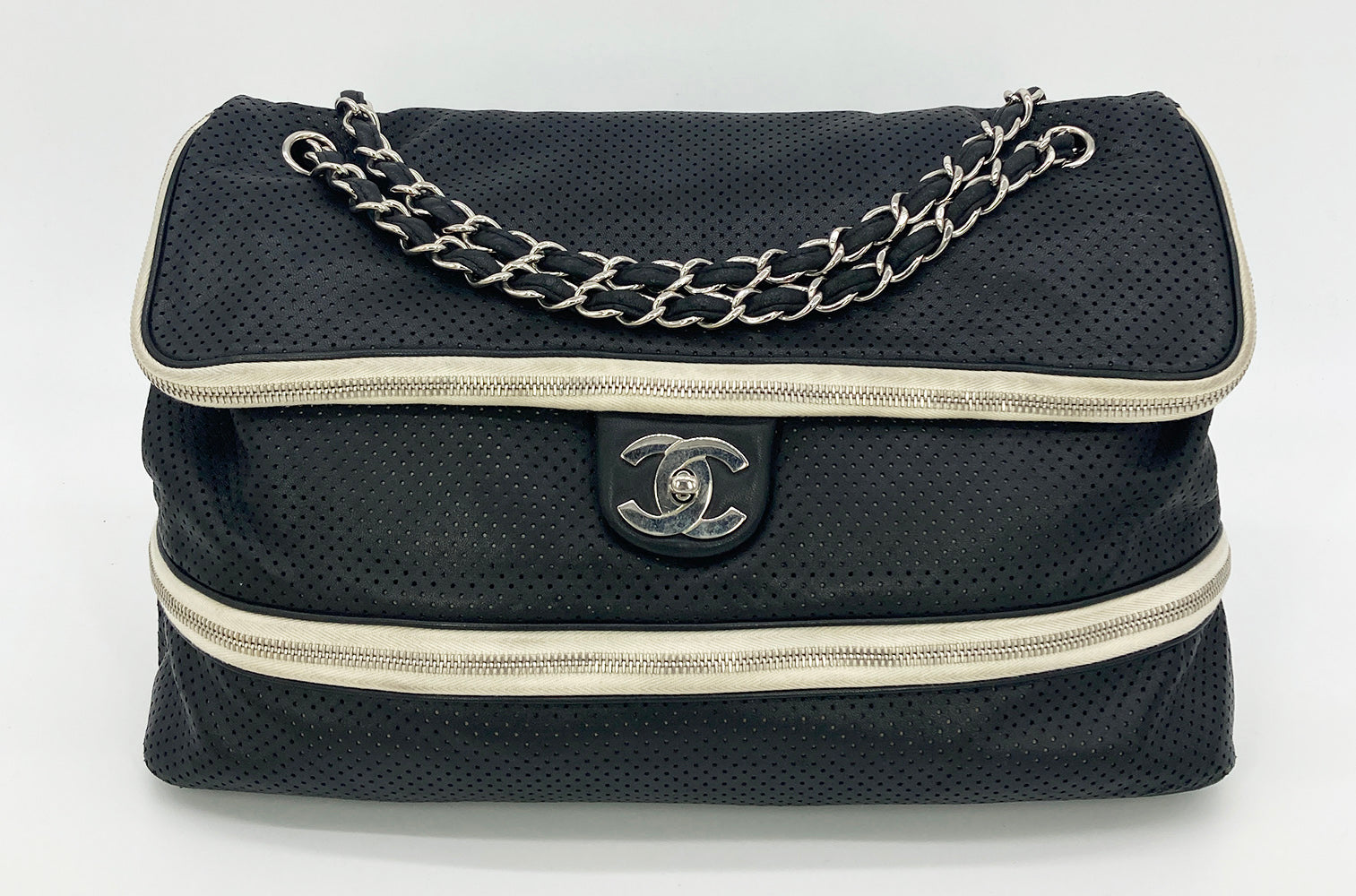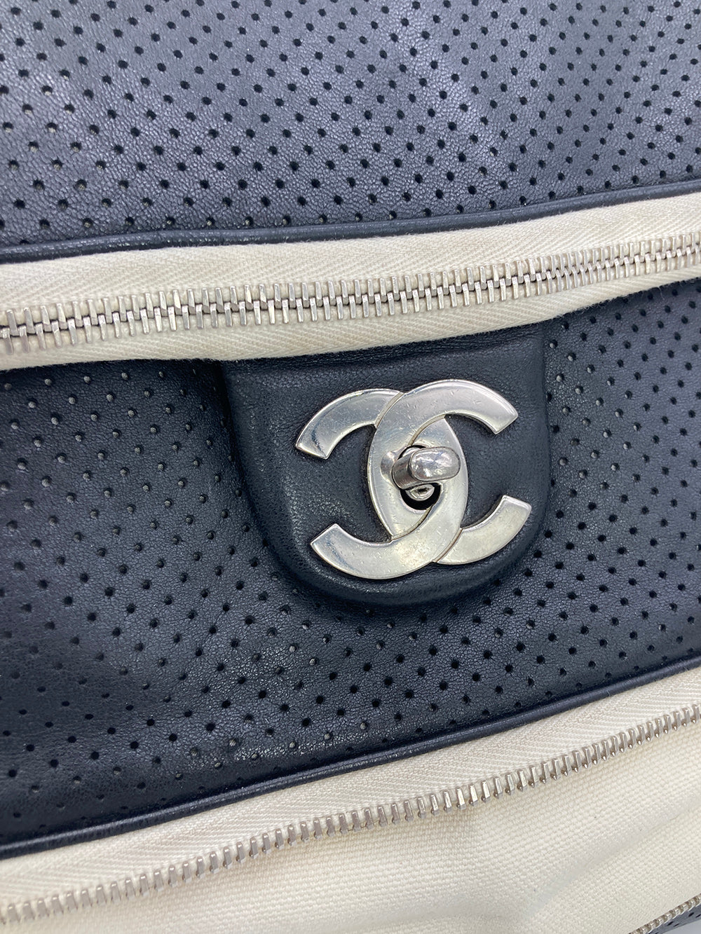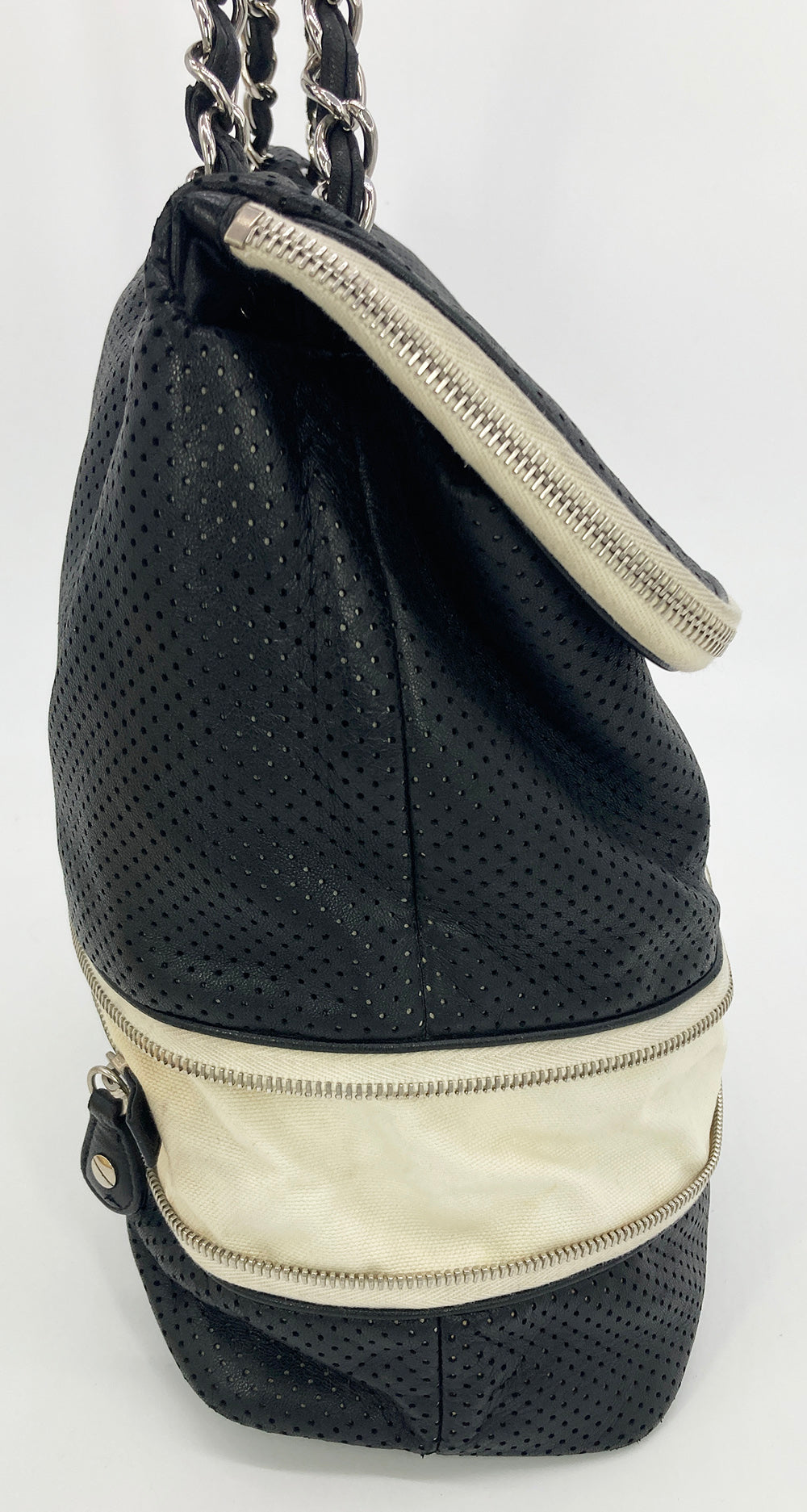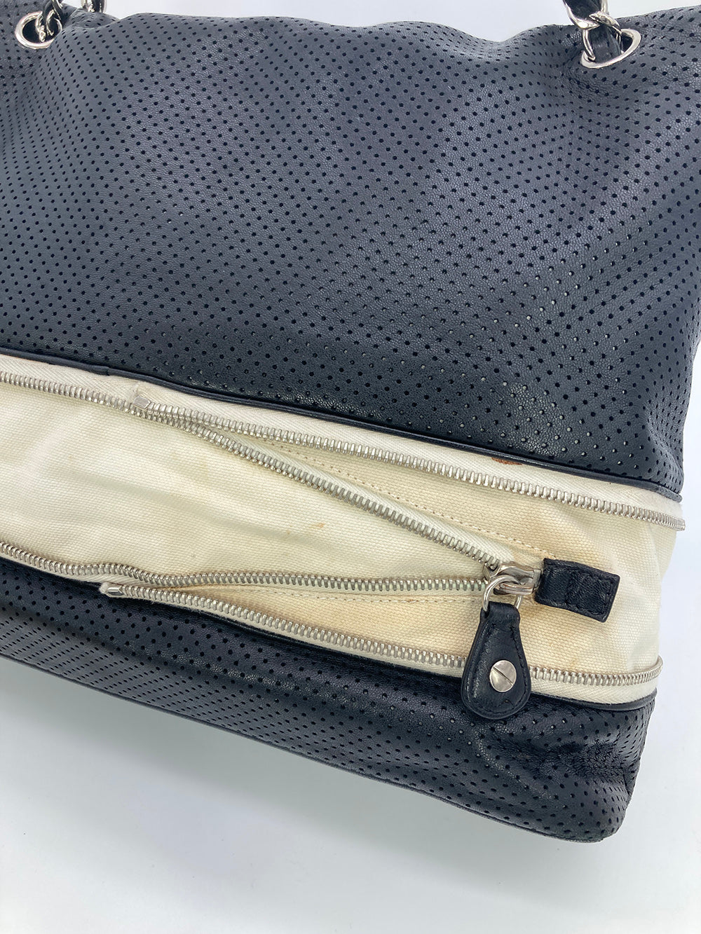 Chanel Black Perforated Leather Expandable Classic Flap Shoulder Bag in fair condition. Black perforated leather trimmed with cream canvas and silver hardware. Unique expandable zipper feature opens the body about 2 inches around with a full zipper surrounding. Twist CC lock closure opens via top flap to a cream canvas lined interior with one zipped and 2 side slit pockets. Overall fair condition. clean corners and edges. stains and discolorations around zipper trim, canvas expandable portion and interior lining. see photos for details. purchase includes a dust cover. measurements: 14"x11-13"x4.5" 7.5-13" strap drop