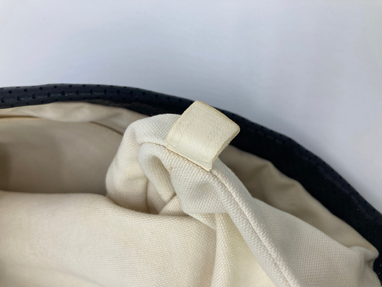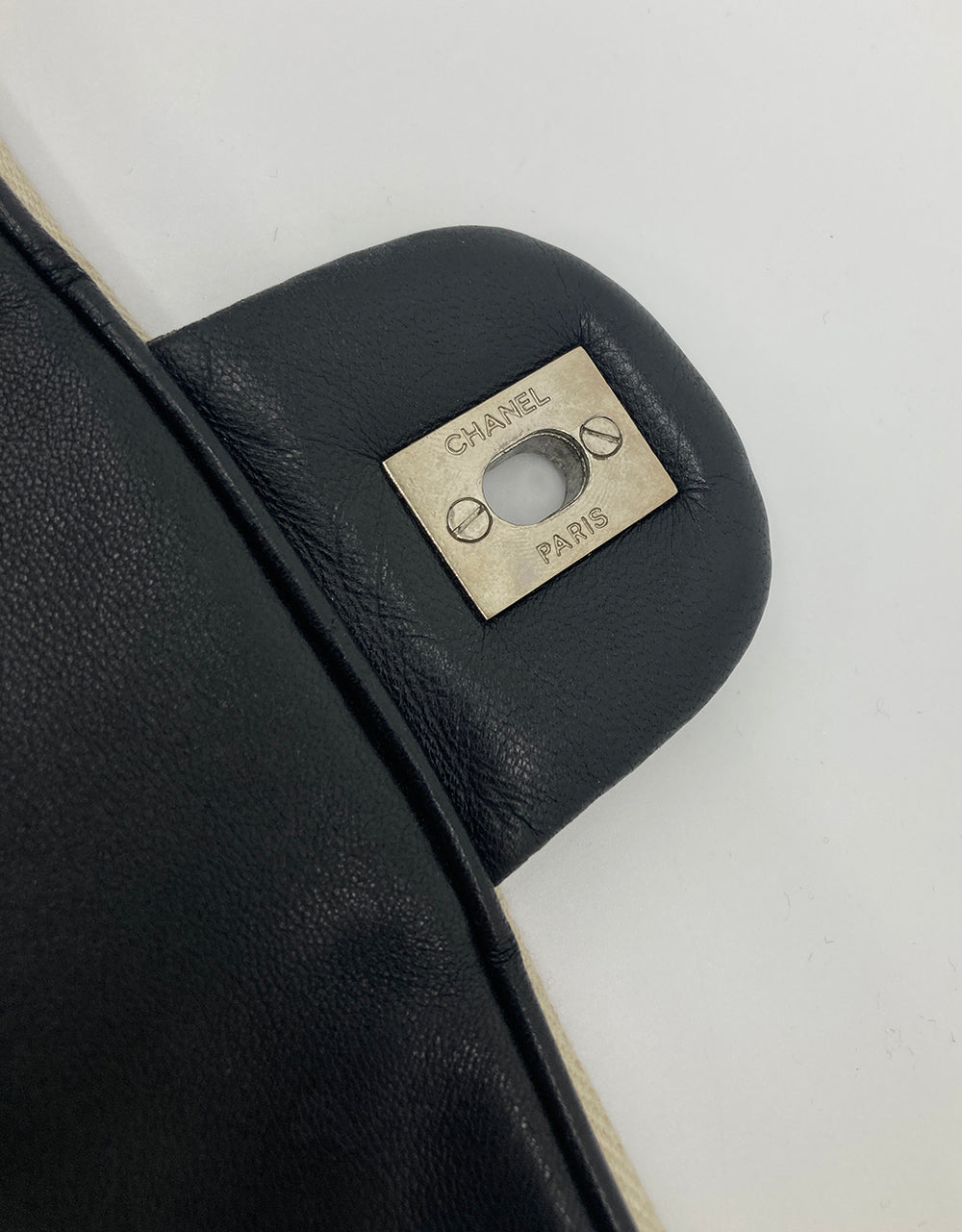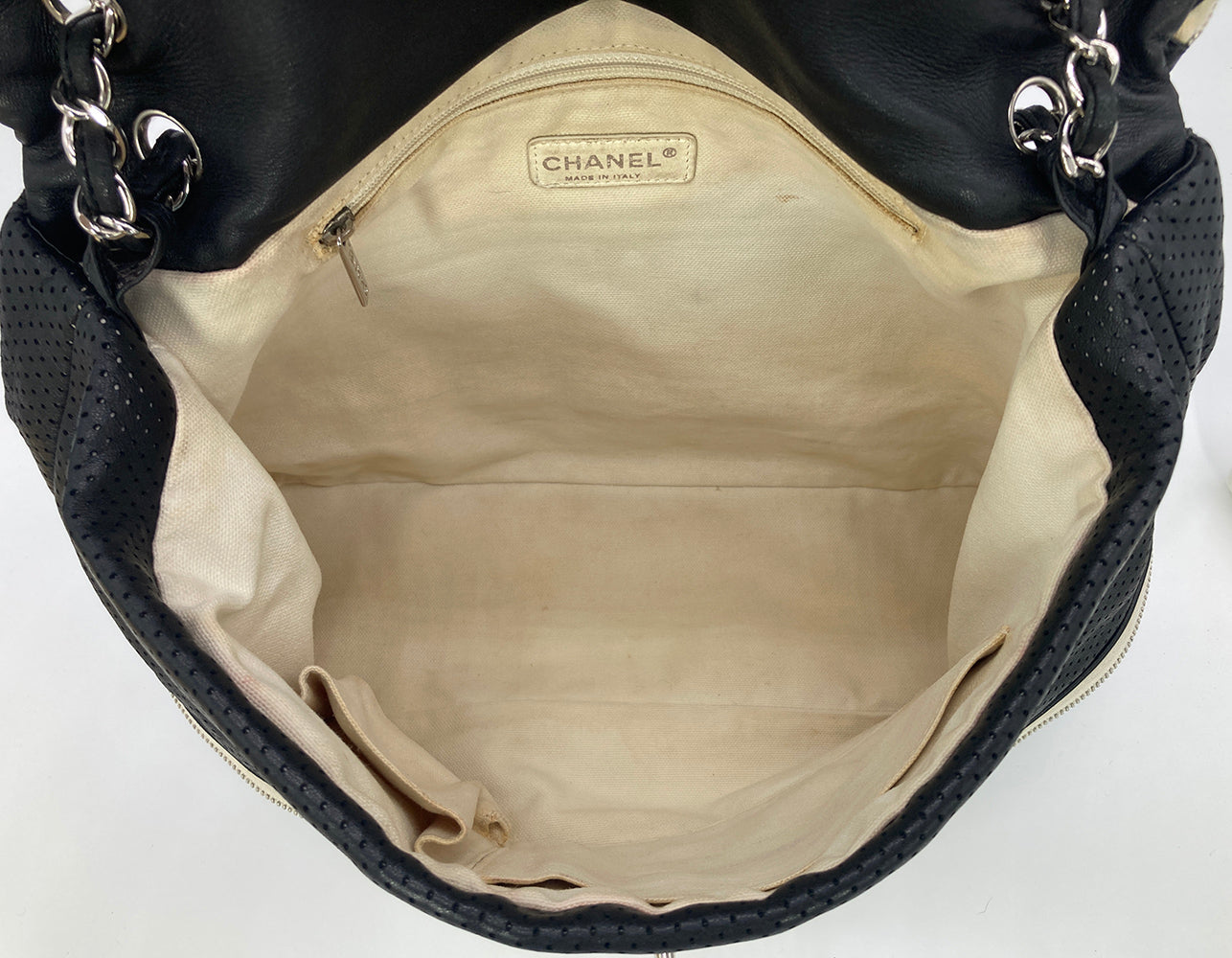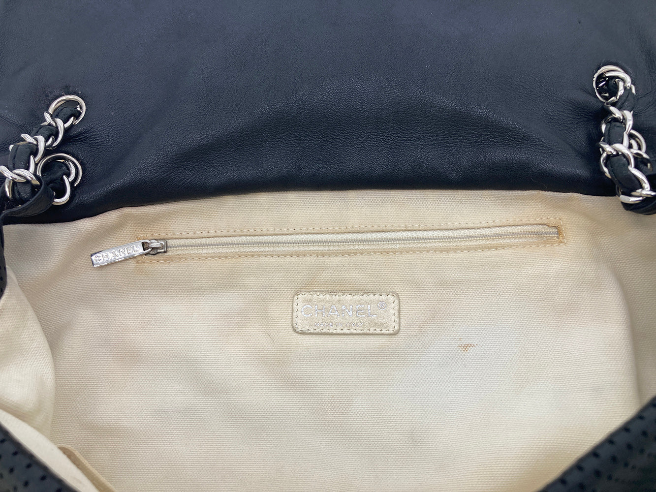 Chanel Black Perforated Leather Expandable Classic Flap Shoulder Bag in fair condition. Black perforated leather trimmed with cream canvas and silver hardware. Unique expandable zipper feature opens the body about 2 inches around with a full zipper surrounding. Twist CC lock closure opens via top flap to a cream canvas lined interior with one zipped and 2 side slit pockets. Overall fair condition. clean corners and edges. stains and discolorations around zipper trim, canvas expandable portion and interior lining. see photos for details. purchase includes a dust cover. measurements: 14"x11-13"x4.5" 7.5-13" strap drop