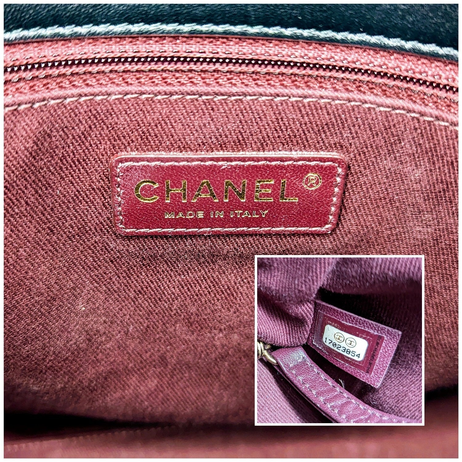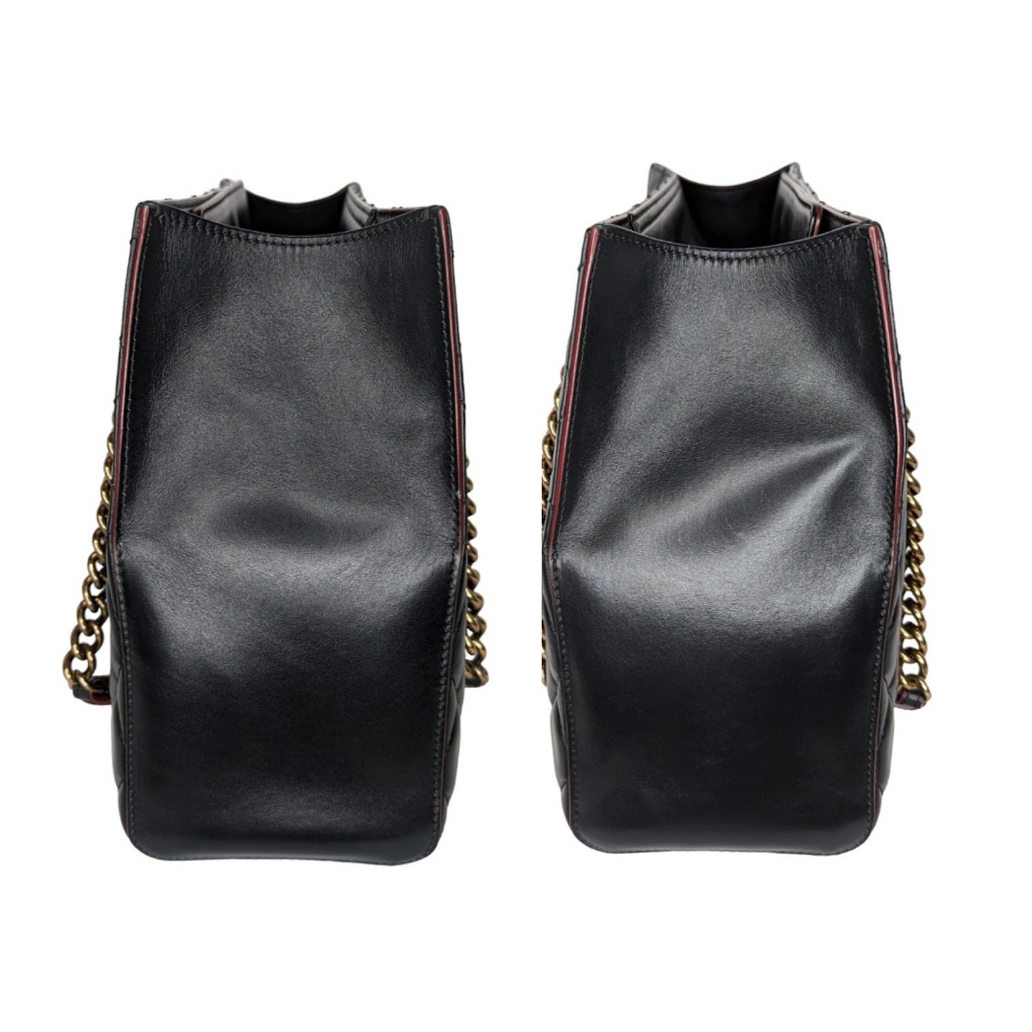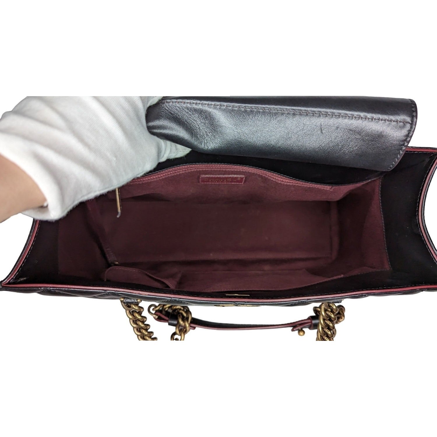 From the Pre-Fall 2012 Collection by Karl Lagerfeld. This edgy newer style features luxurious calfskin leather in signature diamond shaped quilting with a burgundy trim. The shoulder straps are crafted of a prominent aged brass chain strap with a leather shoulder pad. The top features an interior closure fold secured by a CC turn-lock. This opens to a burgundy fabric interior with zipper and patch pockets. 3,800.