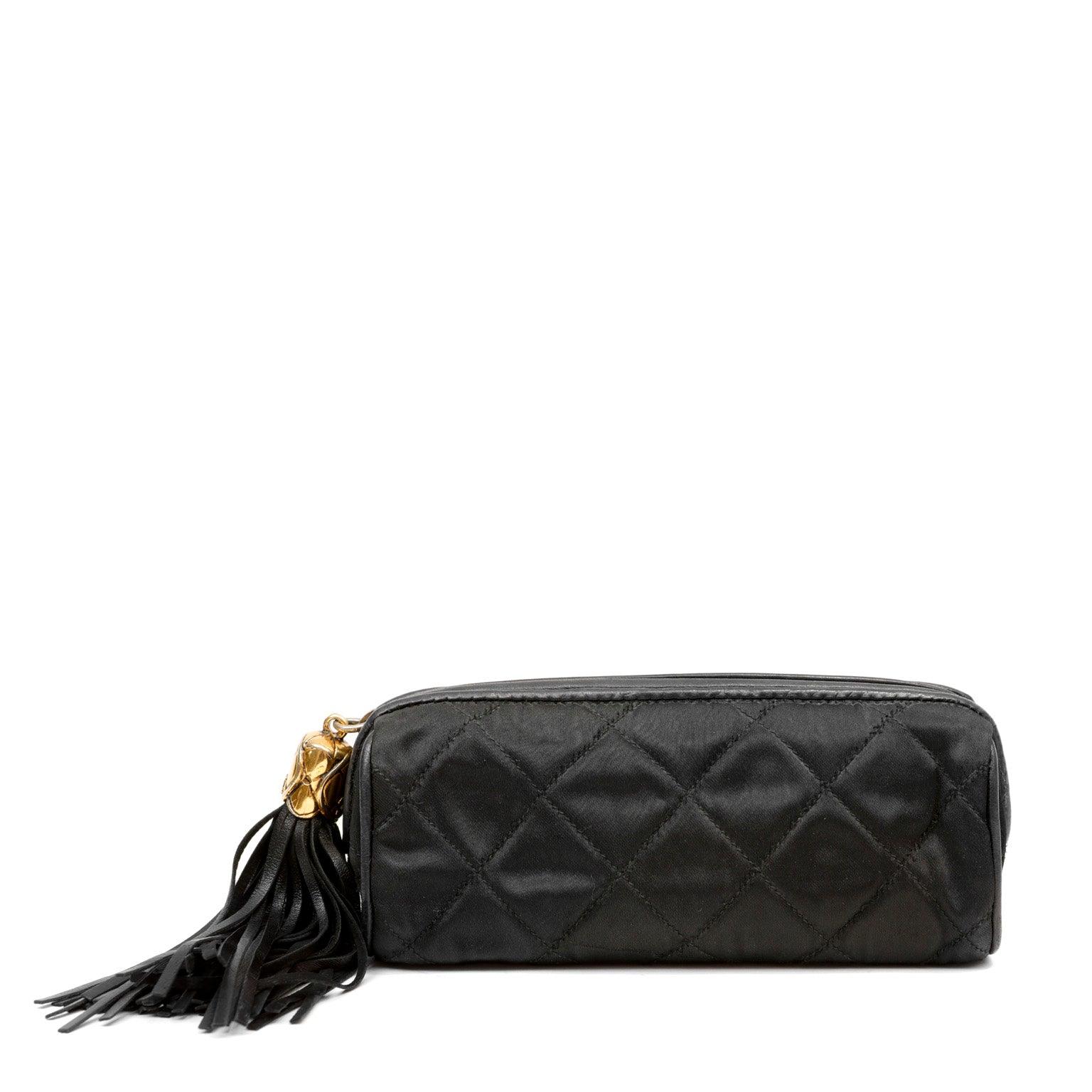 This Chanel Black Satin Tasseled Pouch is in excellent vintage condition. Beautiful and classic 80s style cosmetic pouch in quilted black satin with oversized black leather tassel zipper pull.