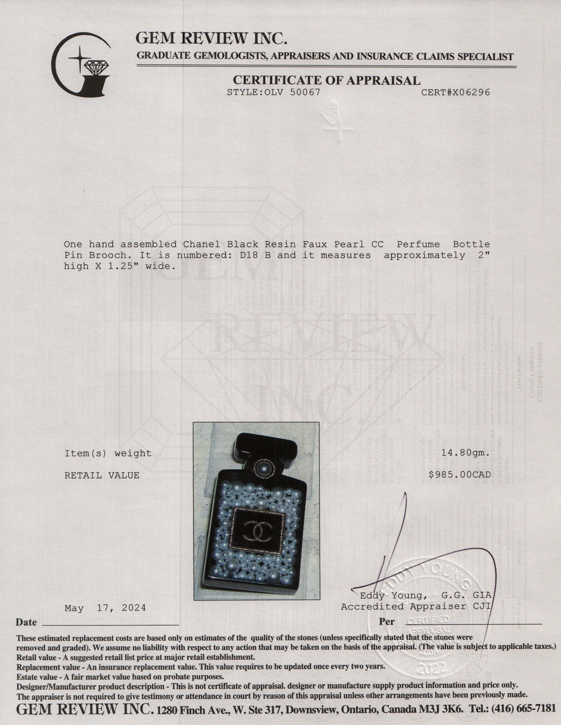 Chanel Black Resin Faux Pearl CC Perfume Bottle Pin Brooch