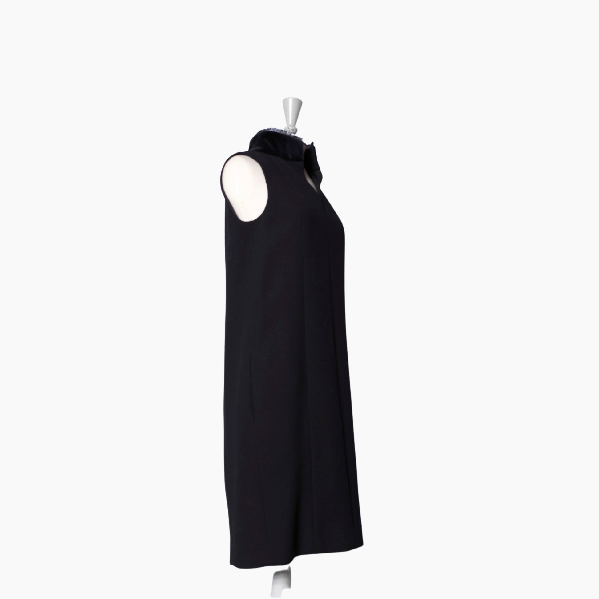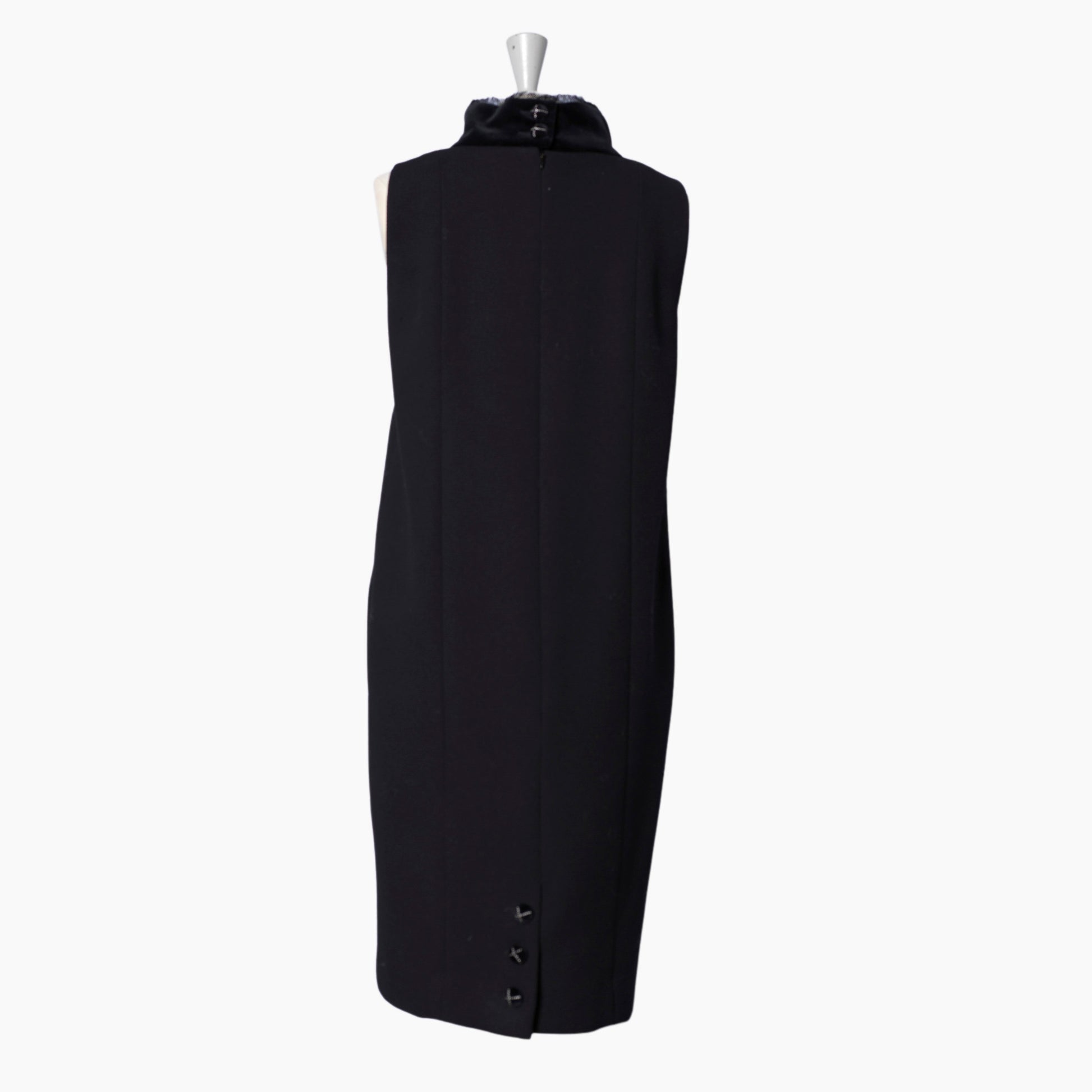DESCRIPTION: Chanel black sleeveless dress with velvet collar. Split neckline and zipper in the back. Two pockets. 3 buttons with chain detail in the back