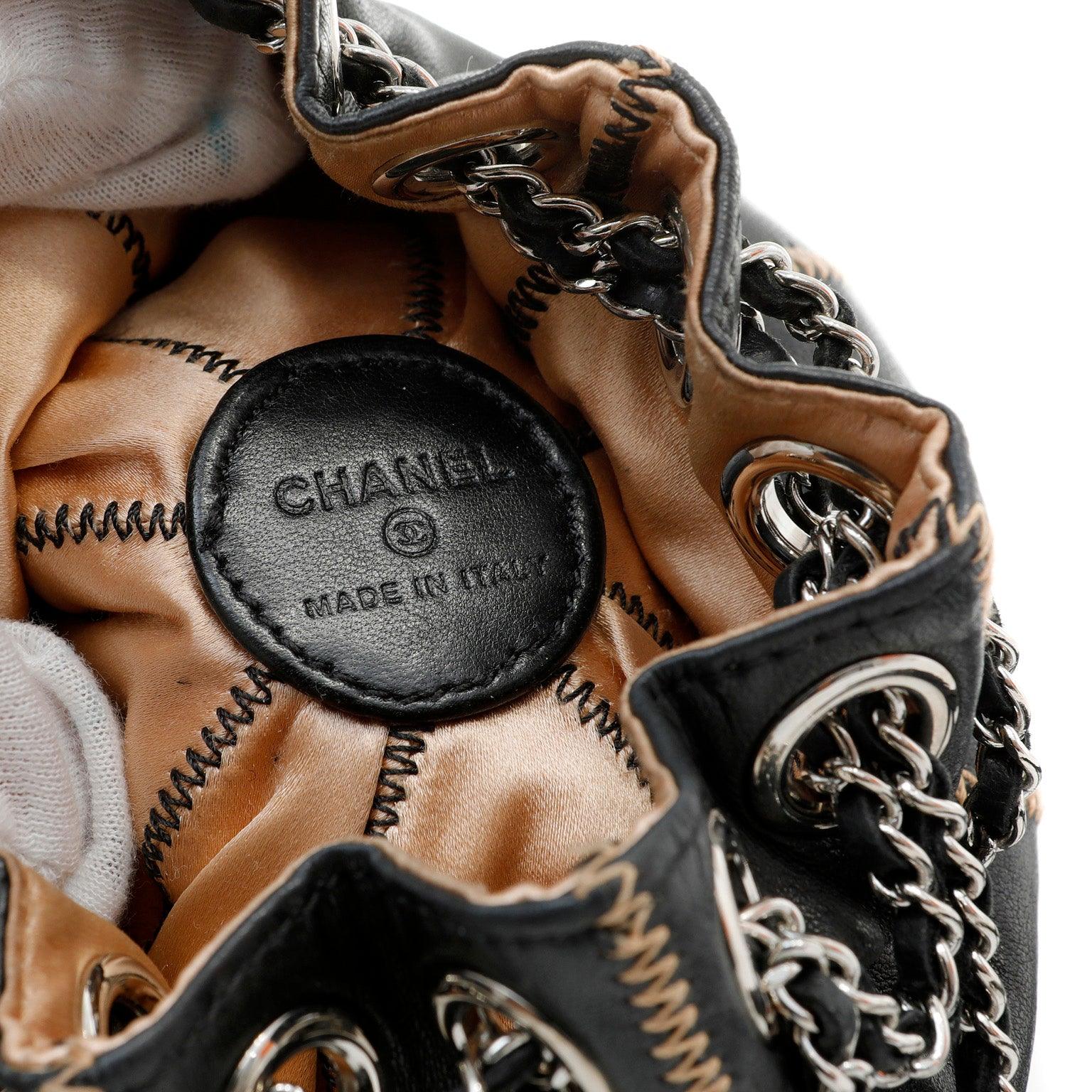 This Chanel Black Leather Reversible Pouchette is in beautiful condition. A feminine petite bag for evening, this versatile reticule may be reversed to the satin beige side. Black leather drawstring style pouch has contrasting zig zag stitching. Silver and leather entwined chain is threaded through large grommets along the top edge and acts as a drawstring style closure. Oversized leather tassel dangles decoratively from the wrist strap. Made in Italy.