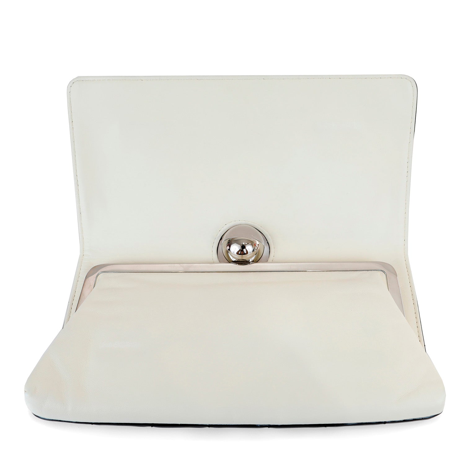 This Chanel Black and White Lambskin Square Stitched Clutch is invery New condition. A clear Lucite knob clasp adds to the architectural interest of this unique piece. Black lambskin is quilted in square chocolate bar pattern. Top opening with round Lucite ball clasp. Dust bag included.