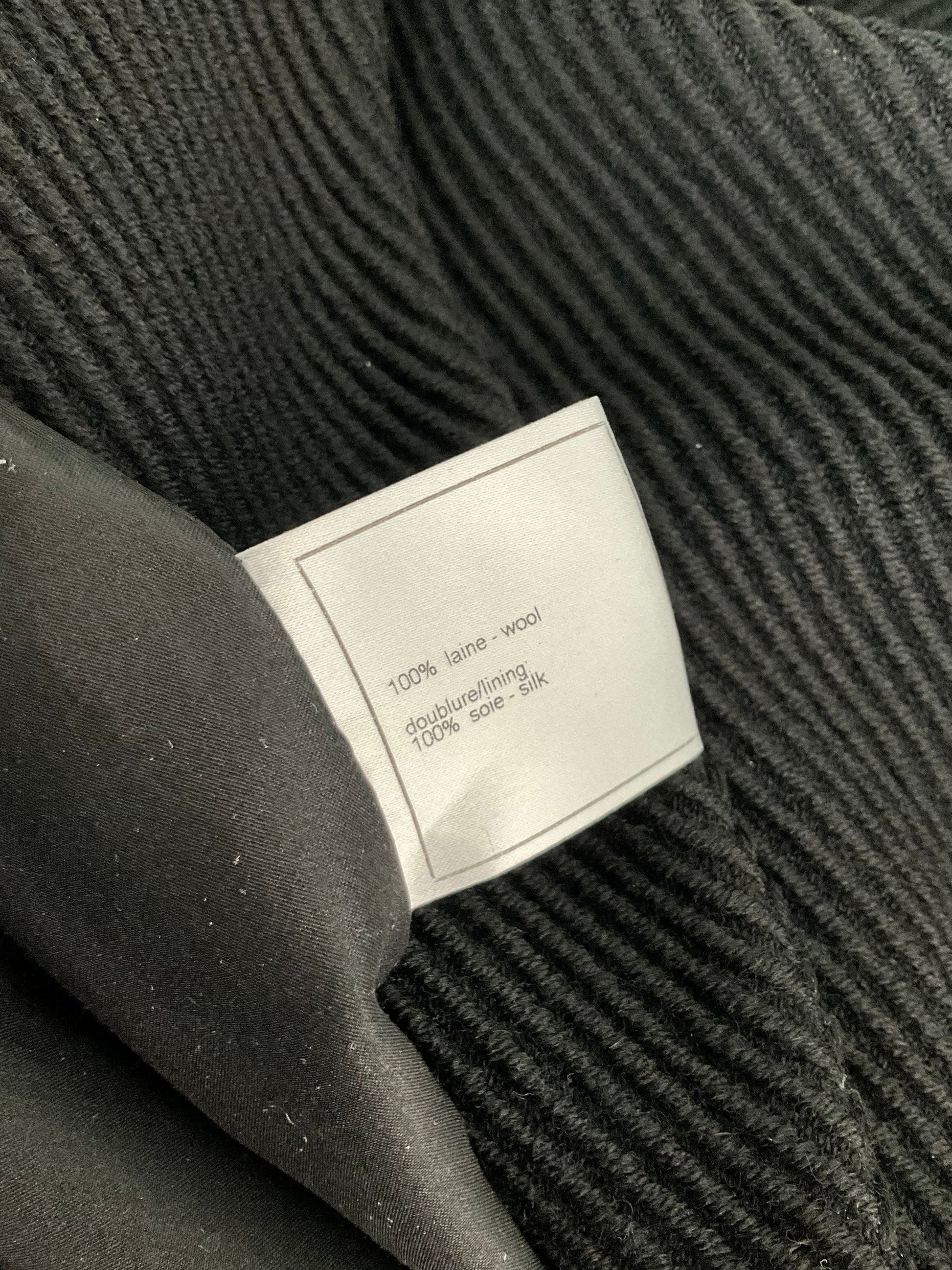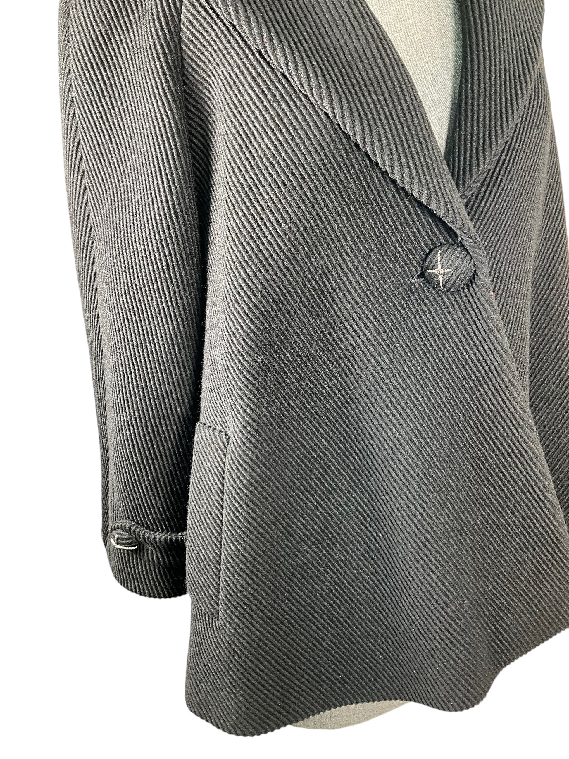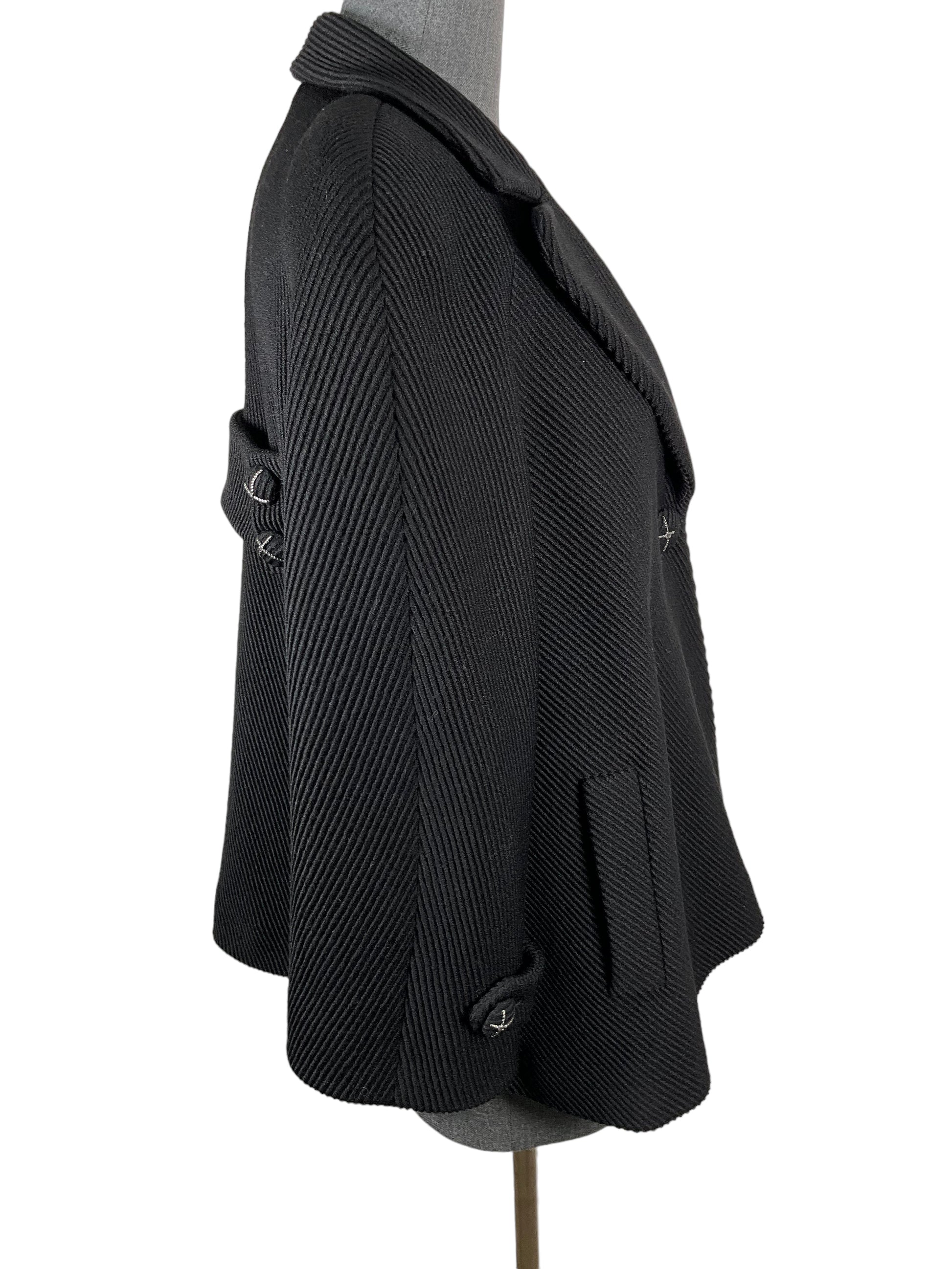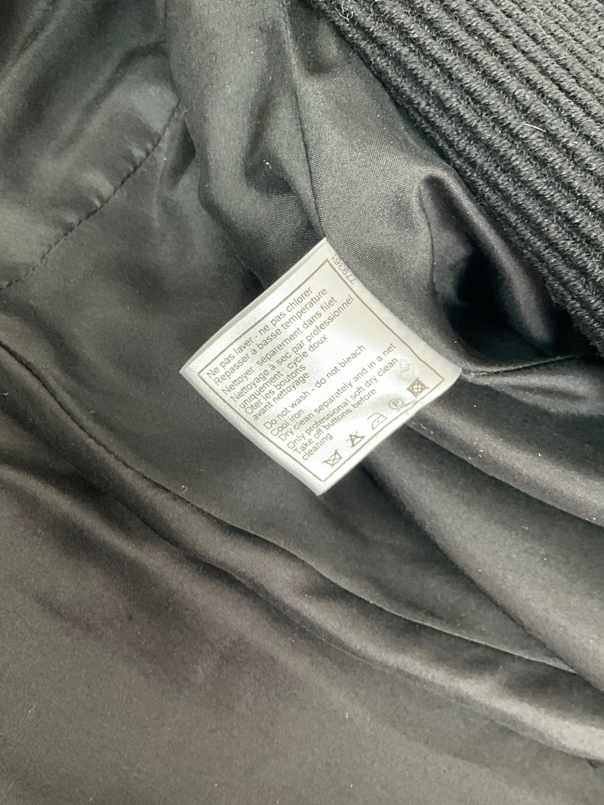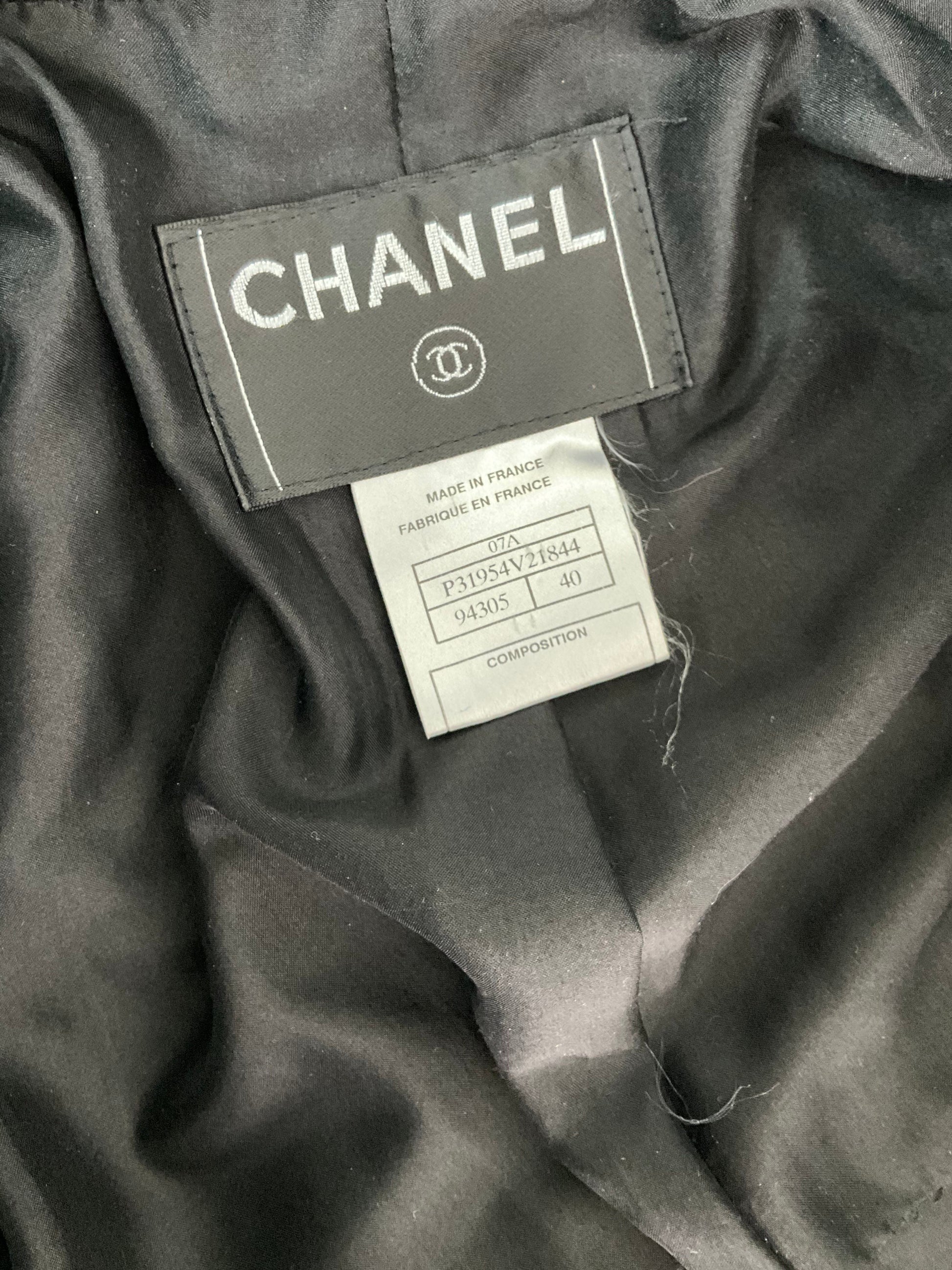 Add this gorgeous Chanel jacket to your wardrobe, size S (FR 40), crafted from black wool and silk lining. This jacket features a gorgeous Chanel tonal wool buttons with a silver chain and "CC" logo, flared hemline, peaked notched lapels, raglan sleeves, strap with buttons on the back, front pockets, and a luxurious silk lining.