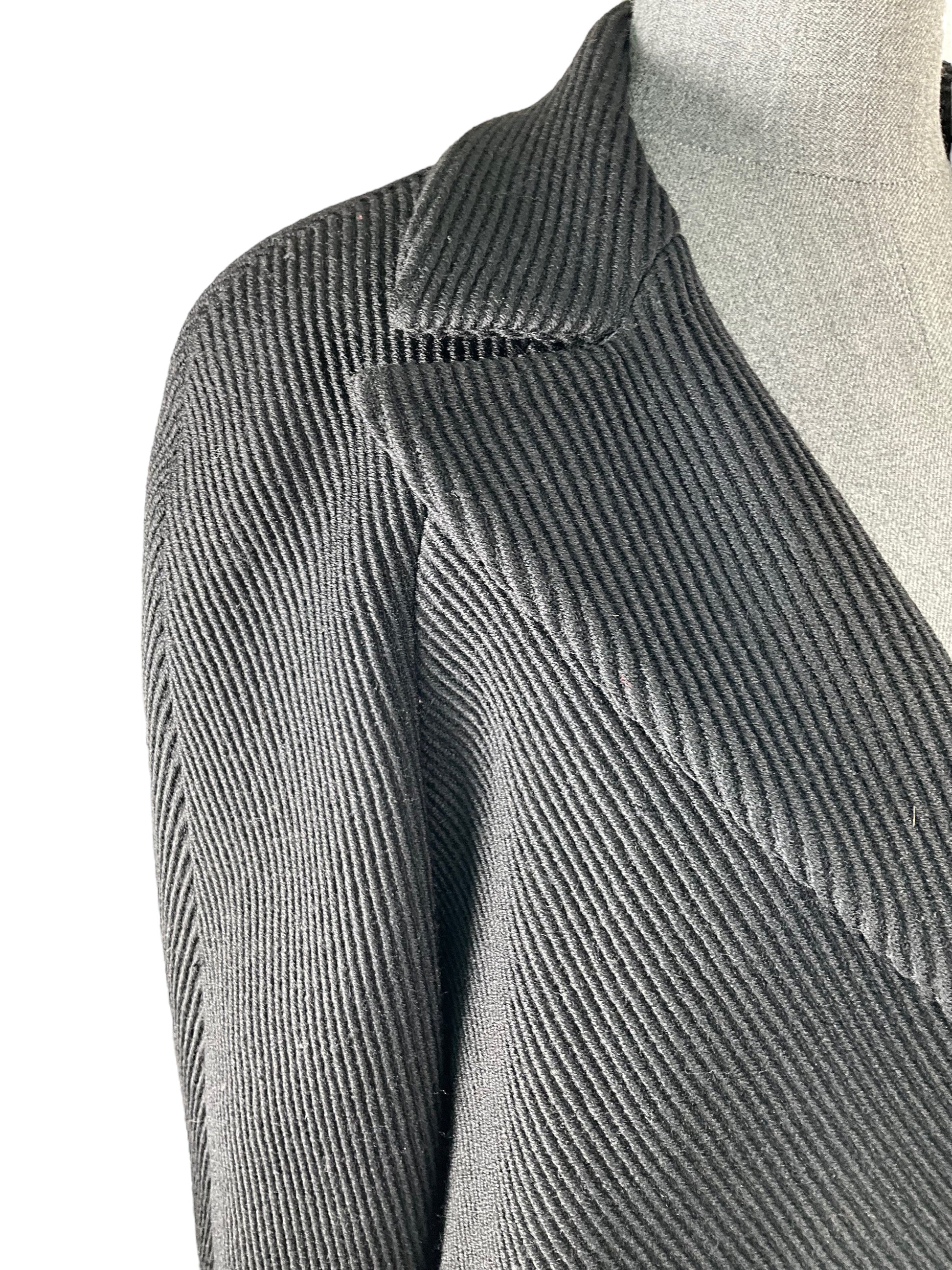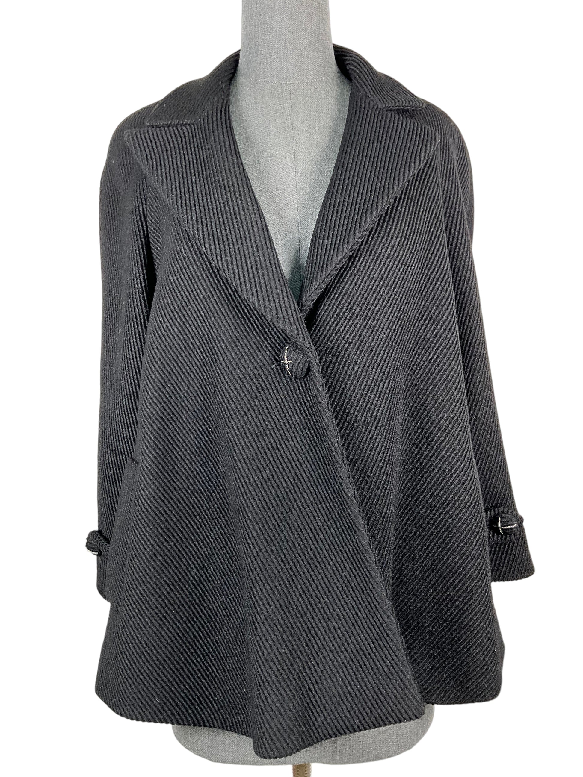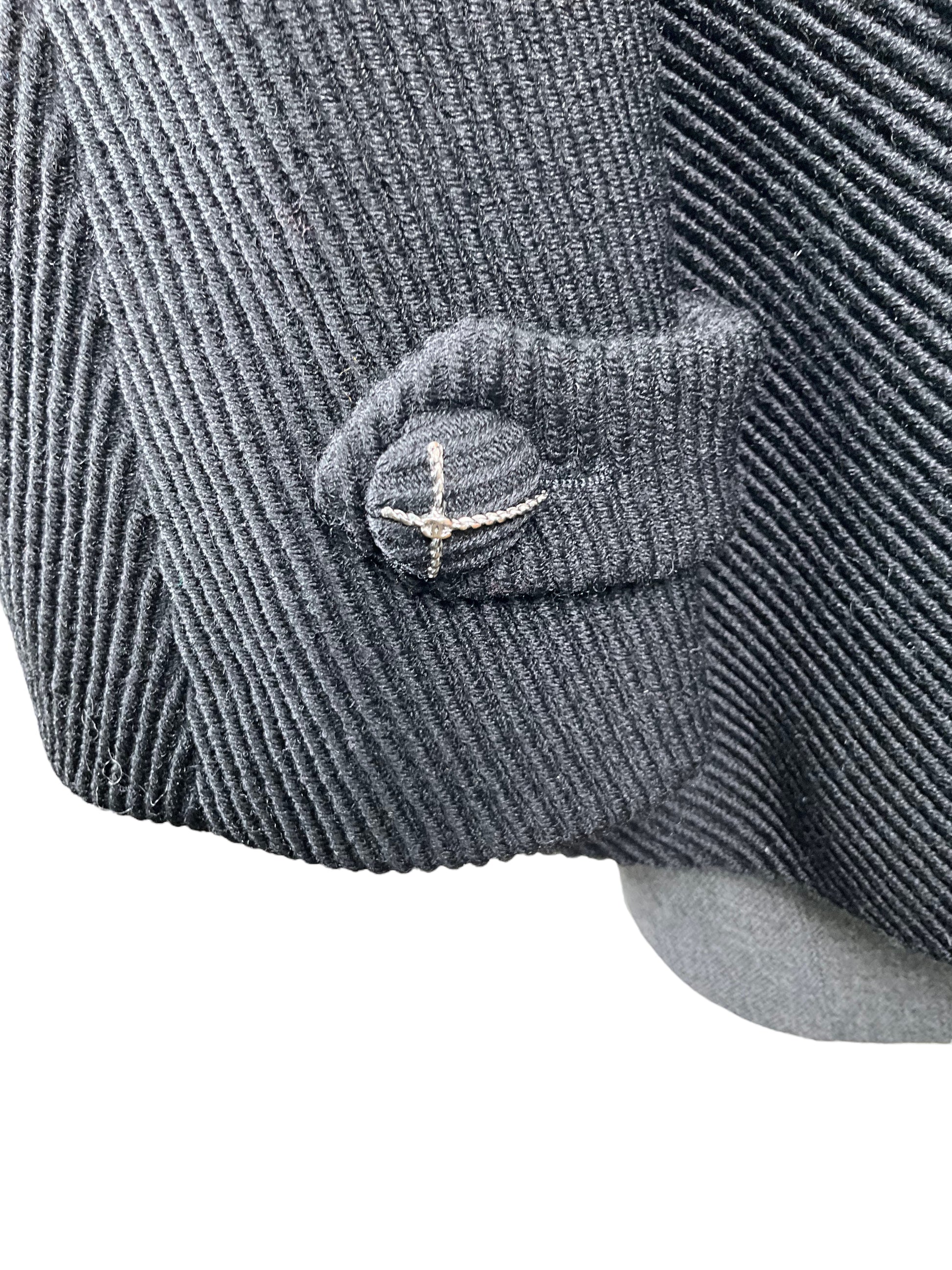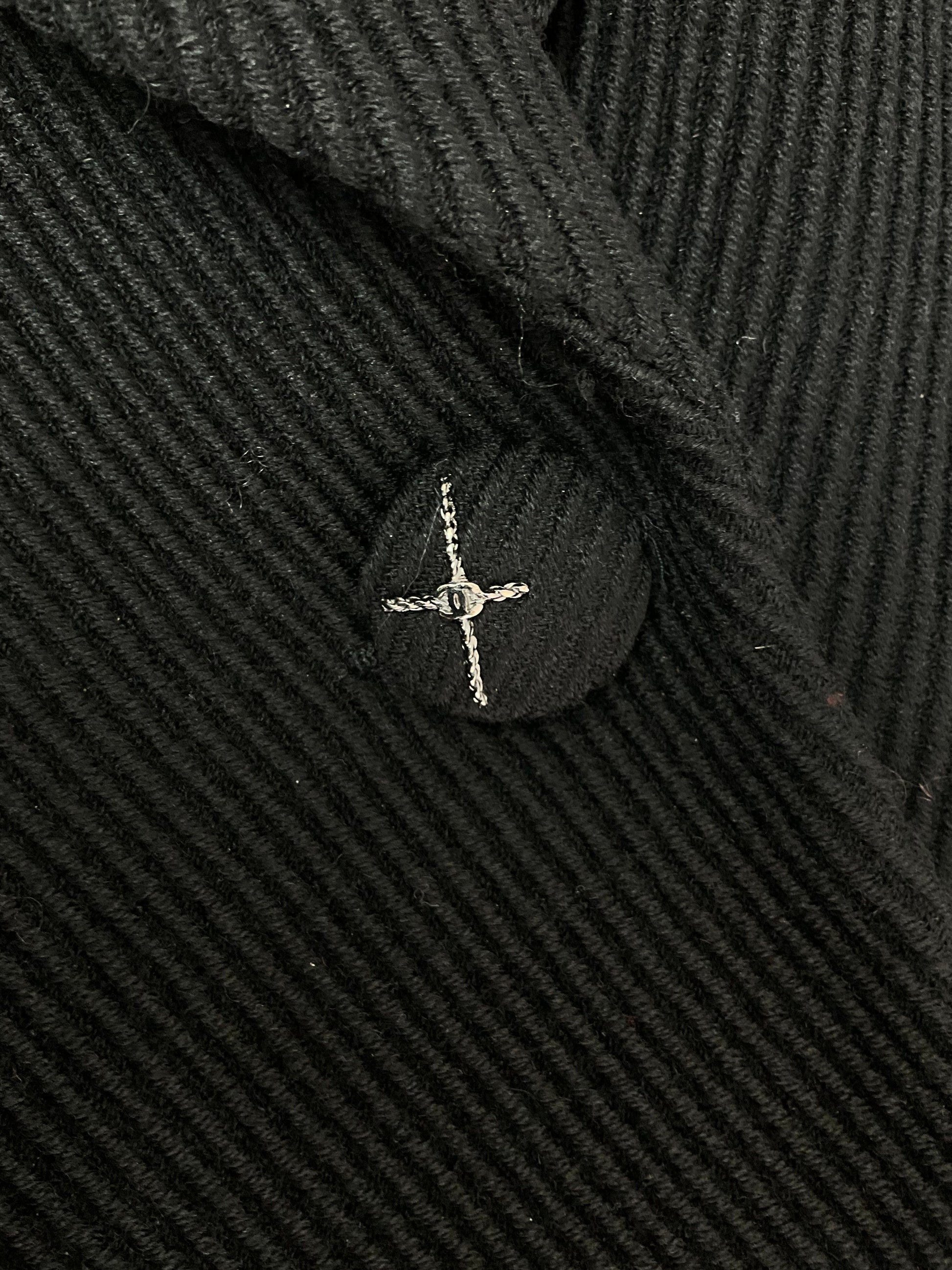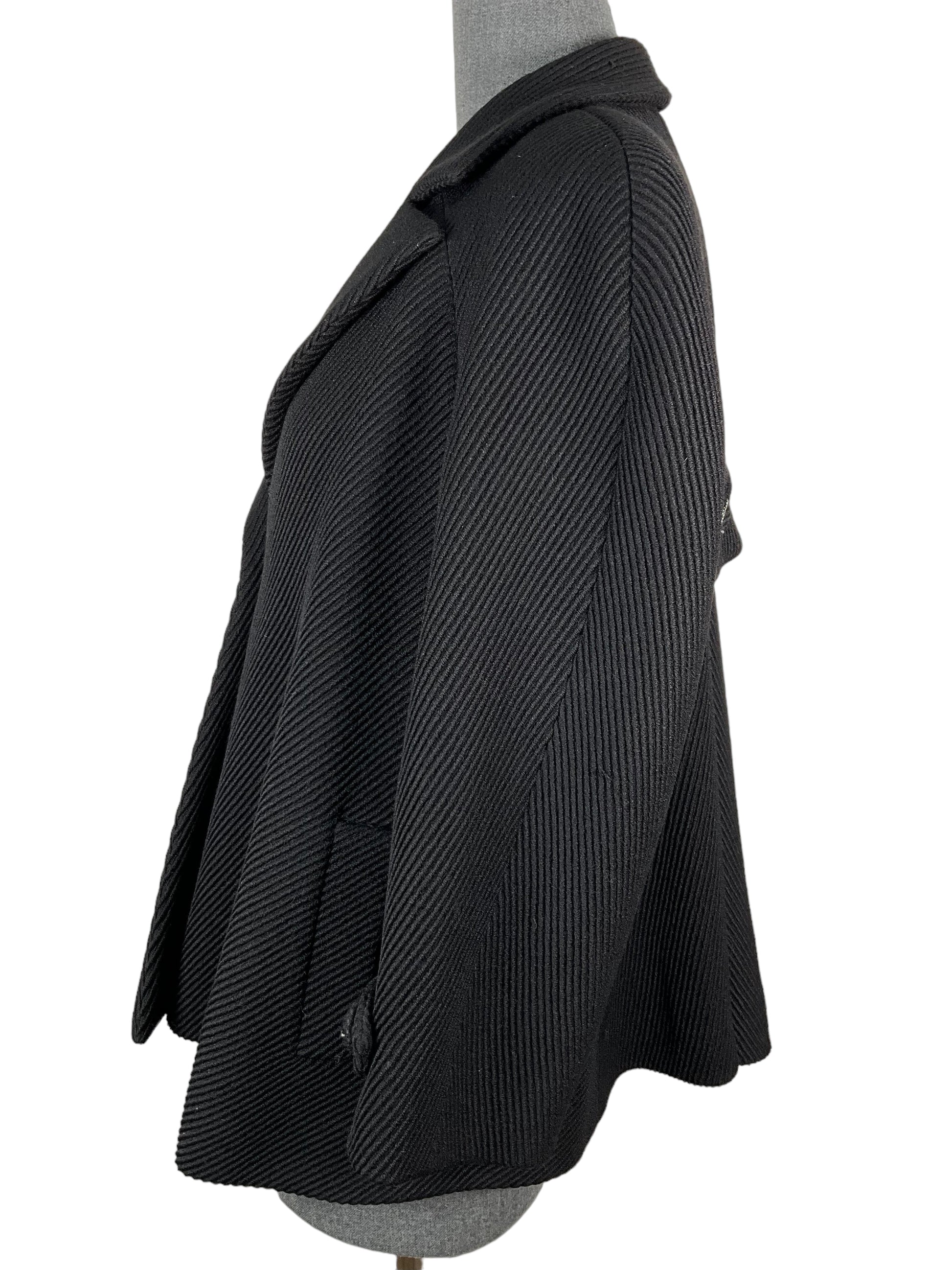 Add this gorgeous Chanel jacket to your wardrobe, size S (FR 40), crafted from black wool and silk lining. This jacket features a gorgeous Chanel tonal wool buttons with a silver chain and "CC" logo, flared hemline, peaked notched lapels, raglan sleeves, strap with buttons on the back, front pockets, and a luxurious silk lining.