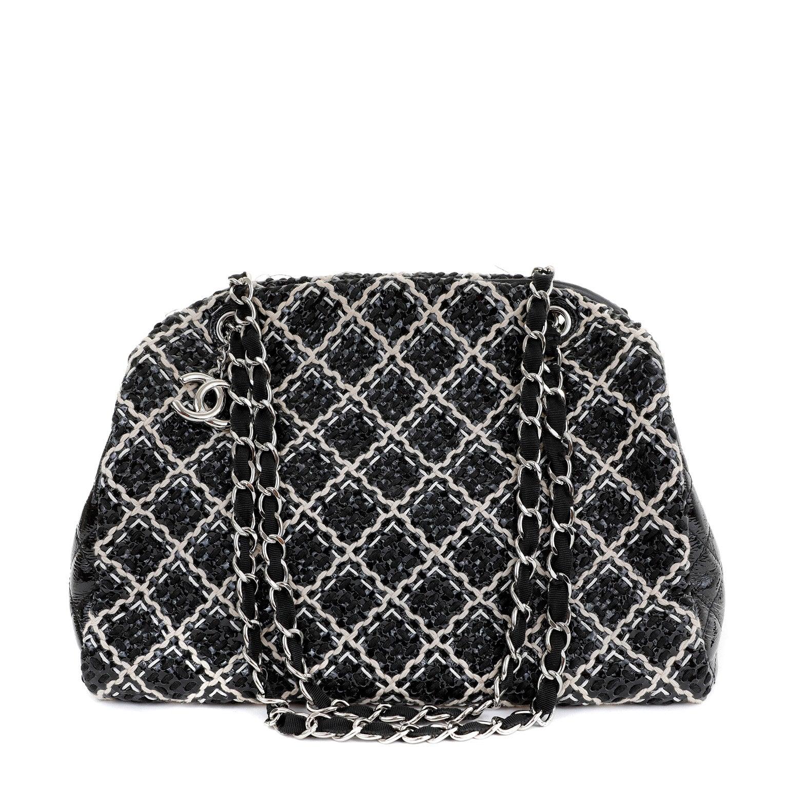 This Chanel Black and Beige Tweed Patent Leather Just Mademoiselle Bag is in pristine condition. Black patent leather is topstitched with white, black and beige tweed in signature Chanel diamond pattern. Feminine rounded silhouette with grosgrain ribbon entwined straps and silver hardware accents. Dust bag included.