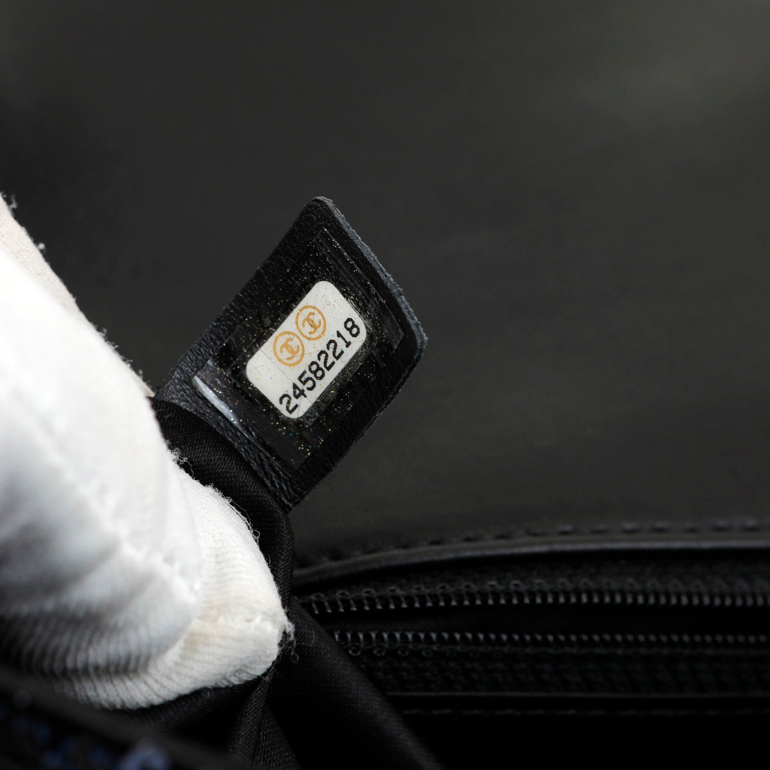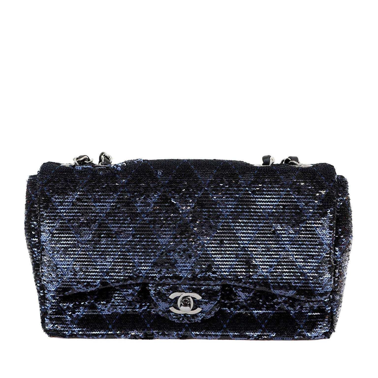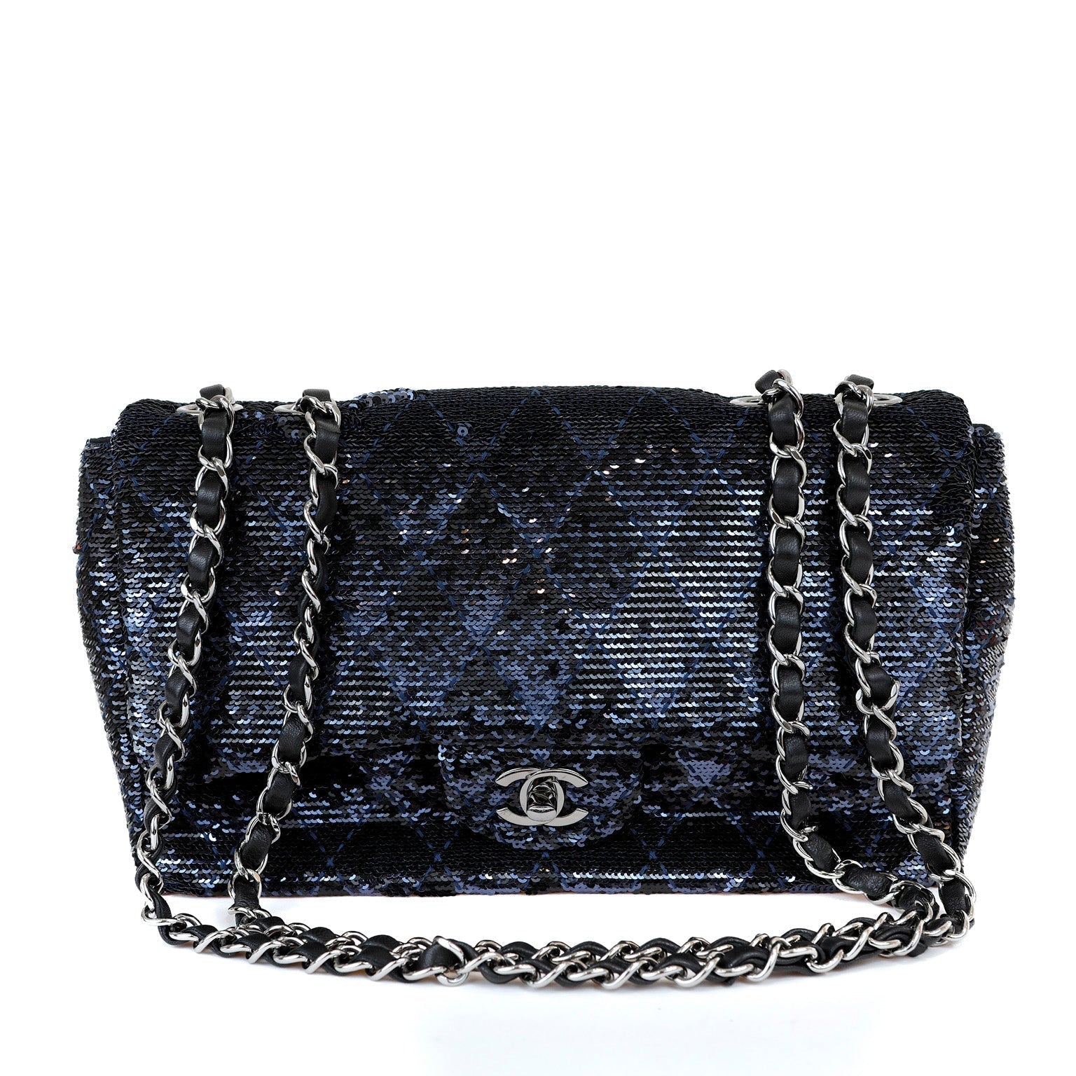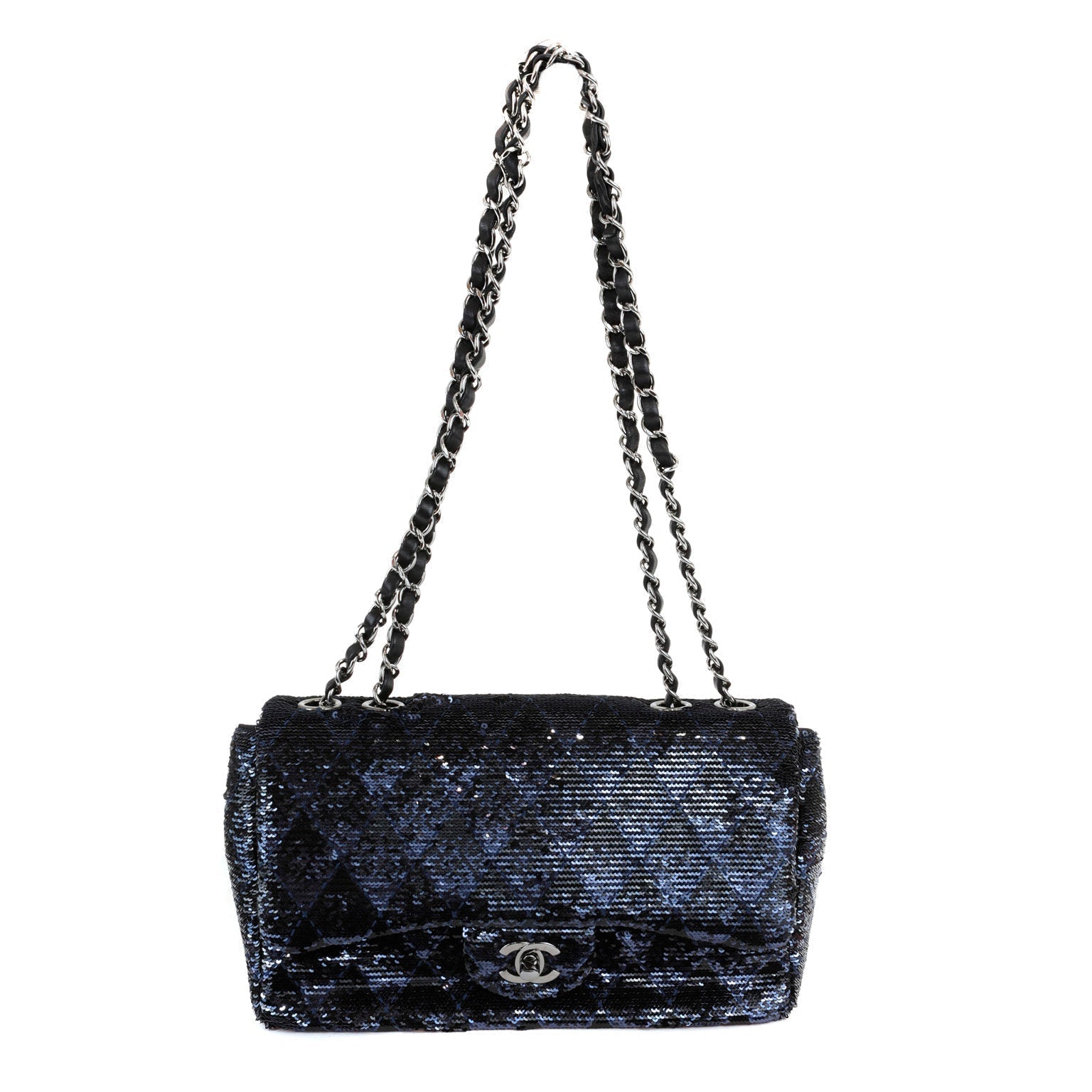 Black and navy-blue sequins are subtly stitched with signature Chanel diamond pattern. Silver interlocking CC twist lock secures the flap. Leather and chain entwined strap may be carried single or double. Dust bag included.