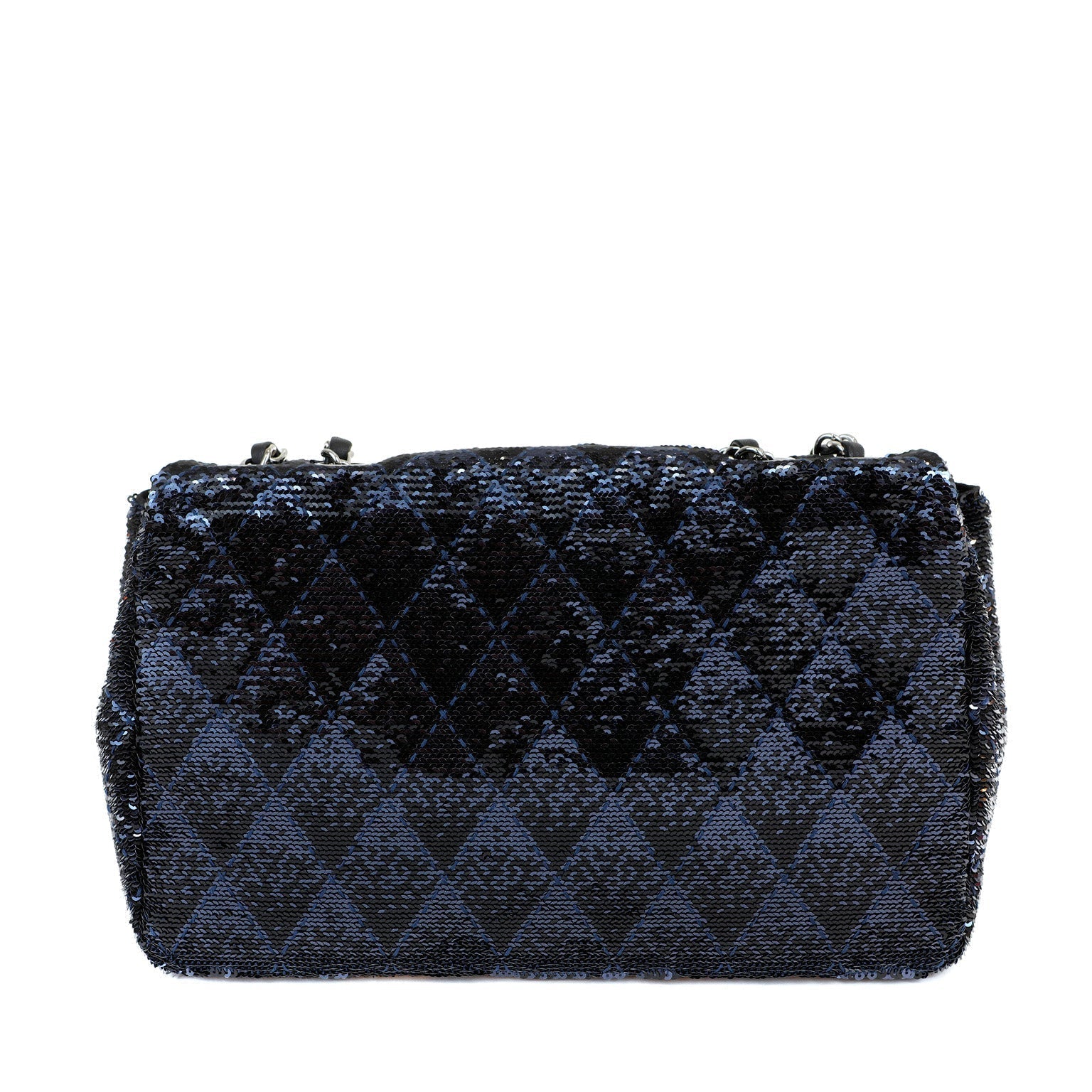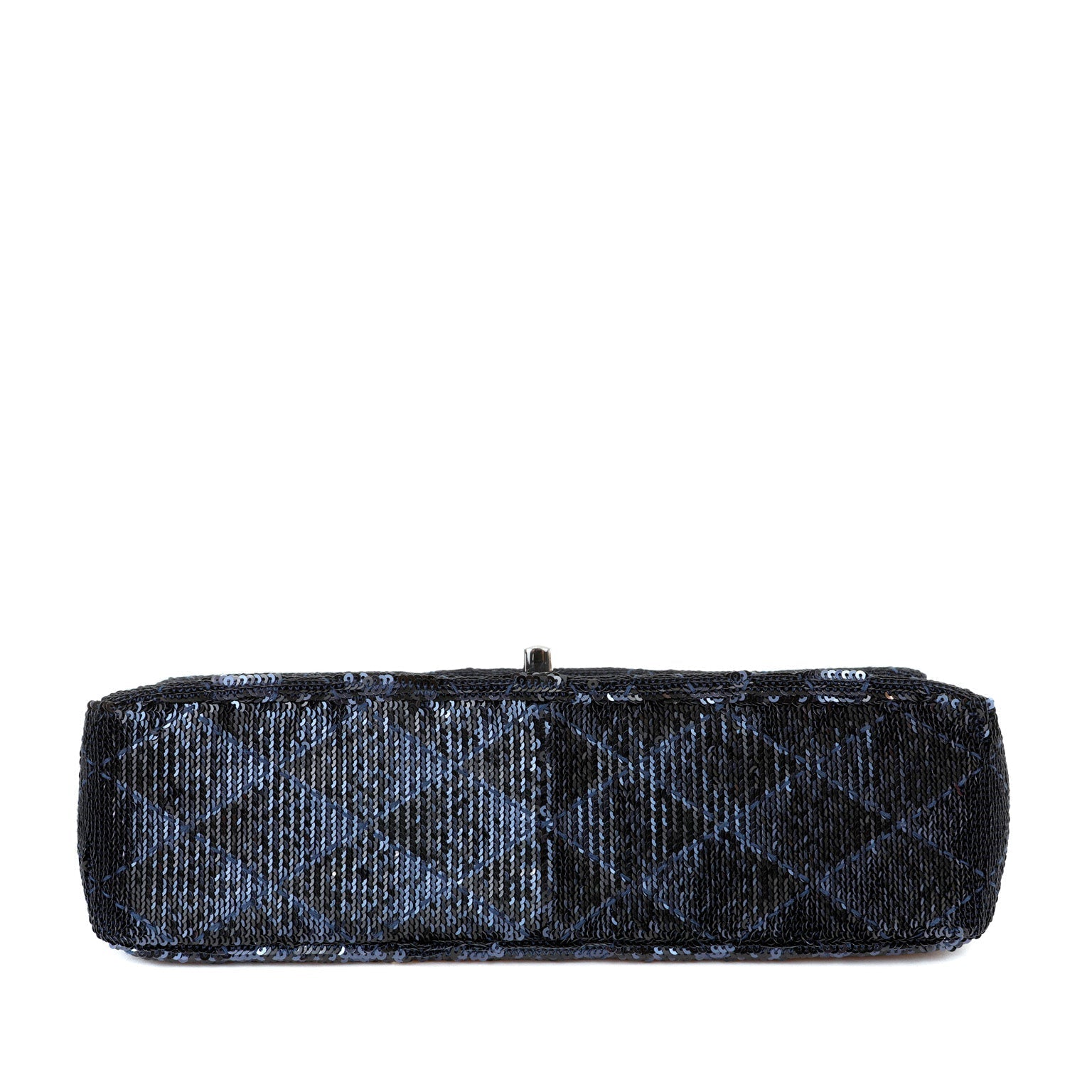 This Chanel Black and Navy Sequins Classic Flap Bag is in pristine condition. The Classic Flap is elevated to new heights in striking sequins with silver hardware accents.