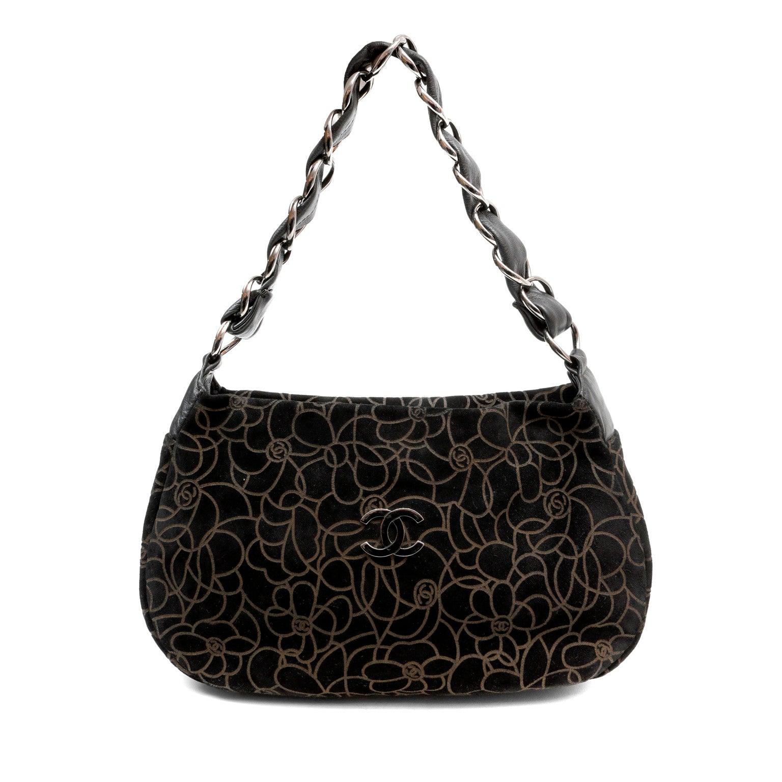 This Chanel Brown and Black Embossed Camellia Bag is in excellent plus condition. Suede zipper top shoulder bag is embossed with swirling camellia flower pattern and cc logos. Top zipper closure with clean monogram fabric interior. Single strap entwined with wide leather and silver chain. Dust bag included.