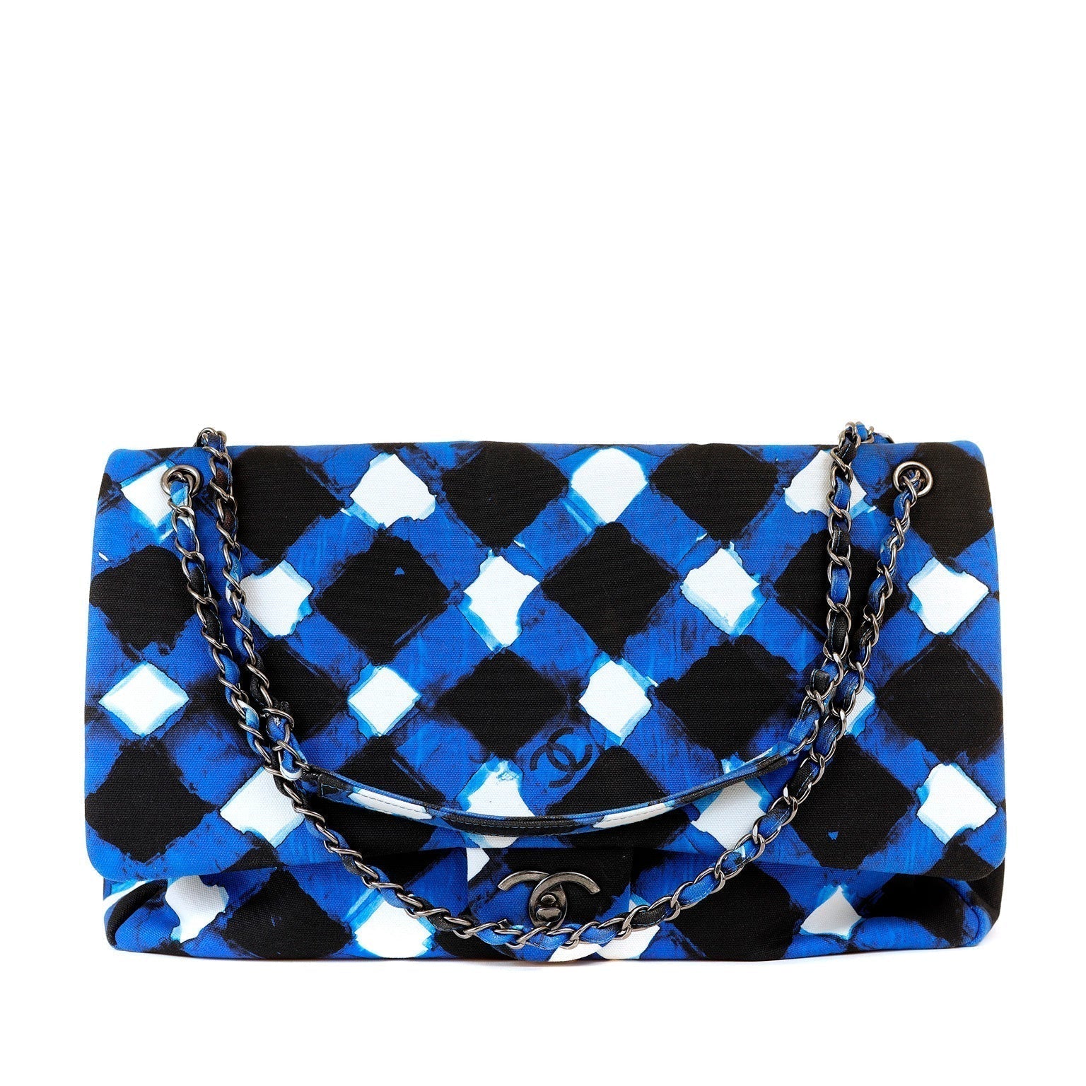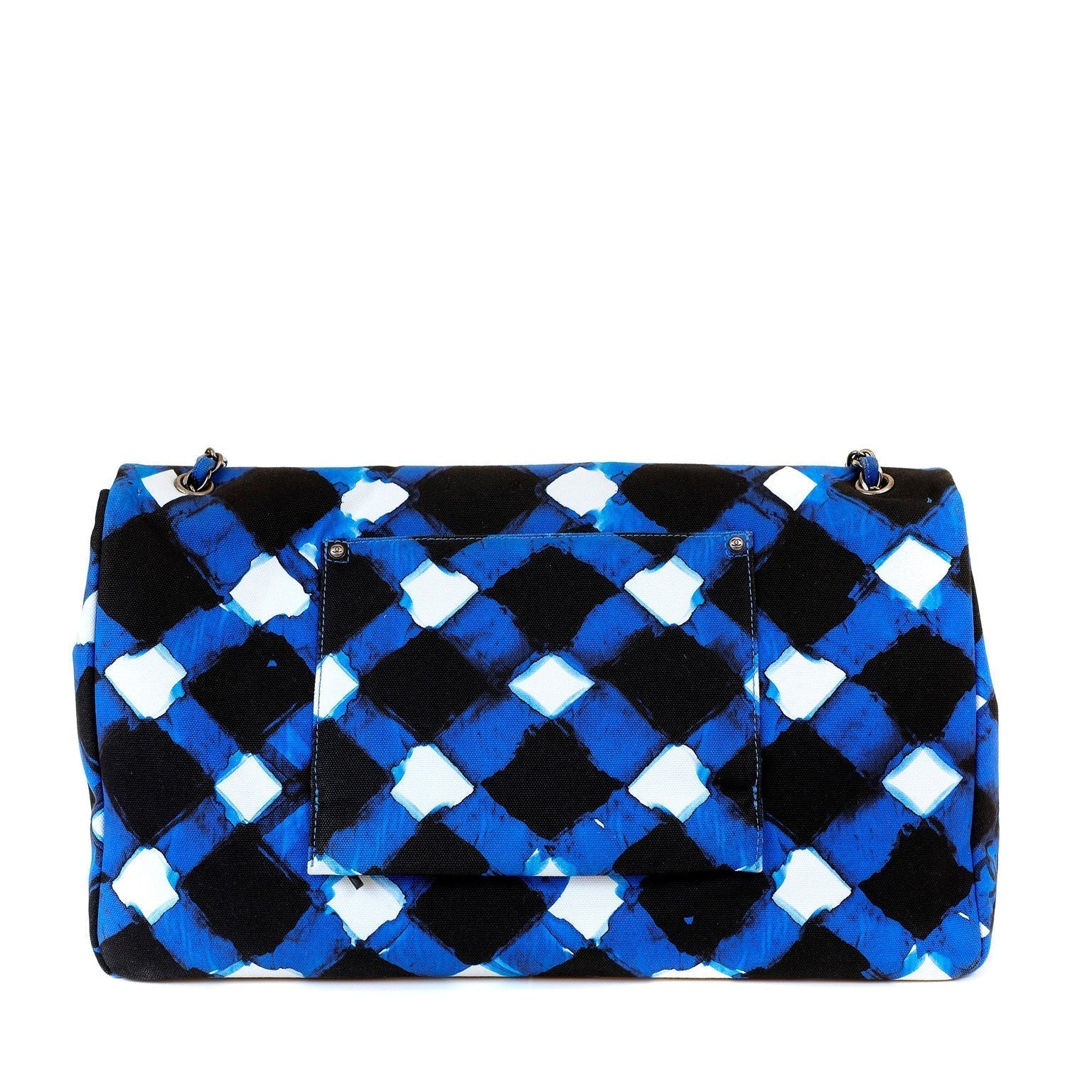 Plaid treated canvas in cobalt blue, cream and black with ruthenium interlocking CC twist lock on the single flap closure. Protective footed bottom and navy-blue fabric interior lining. Chain and fabric entwined strap may be carried single or double. Made in Italy.