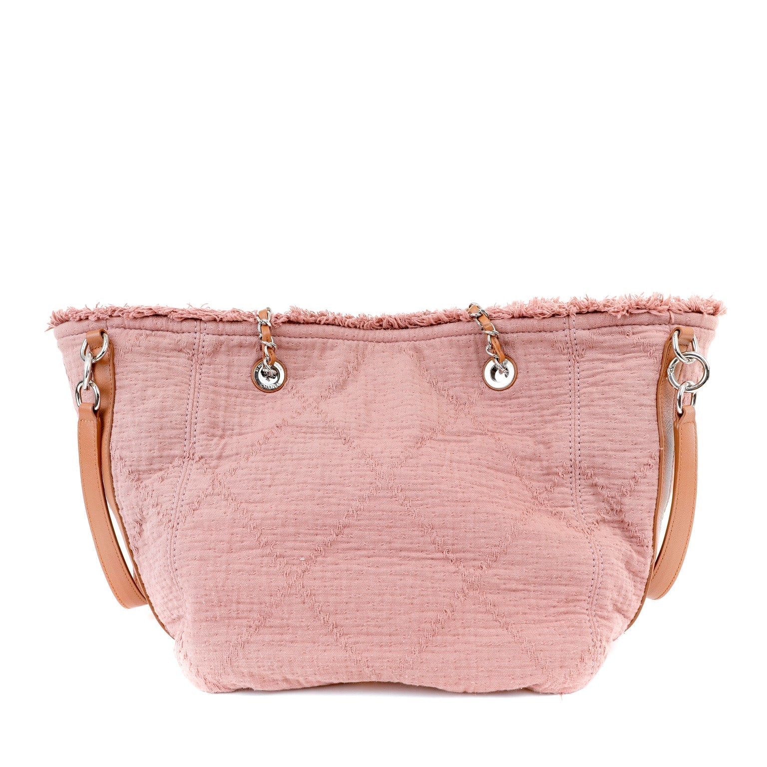 Blush pink textured fabric with silver hardware accents. Frayed edge collar and leather trimmings. Carried by the leather top handles or the chain entwined shoulder straps.Dust bag included.