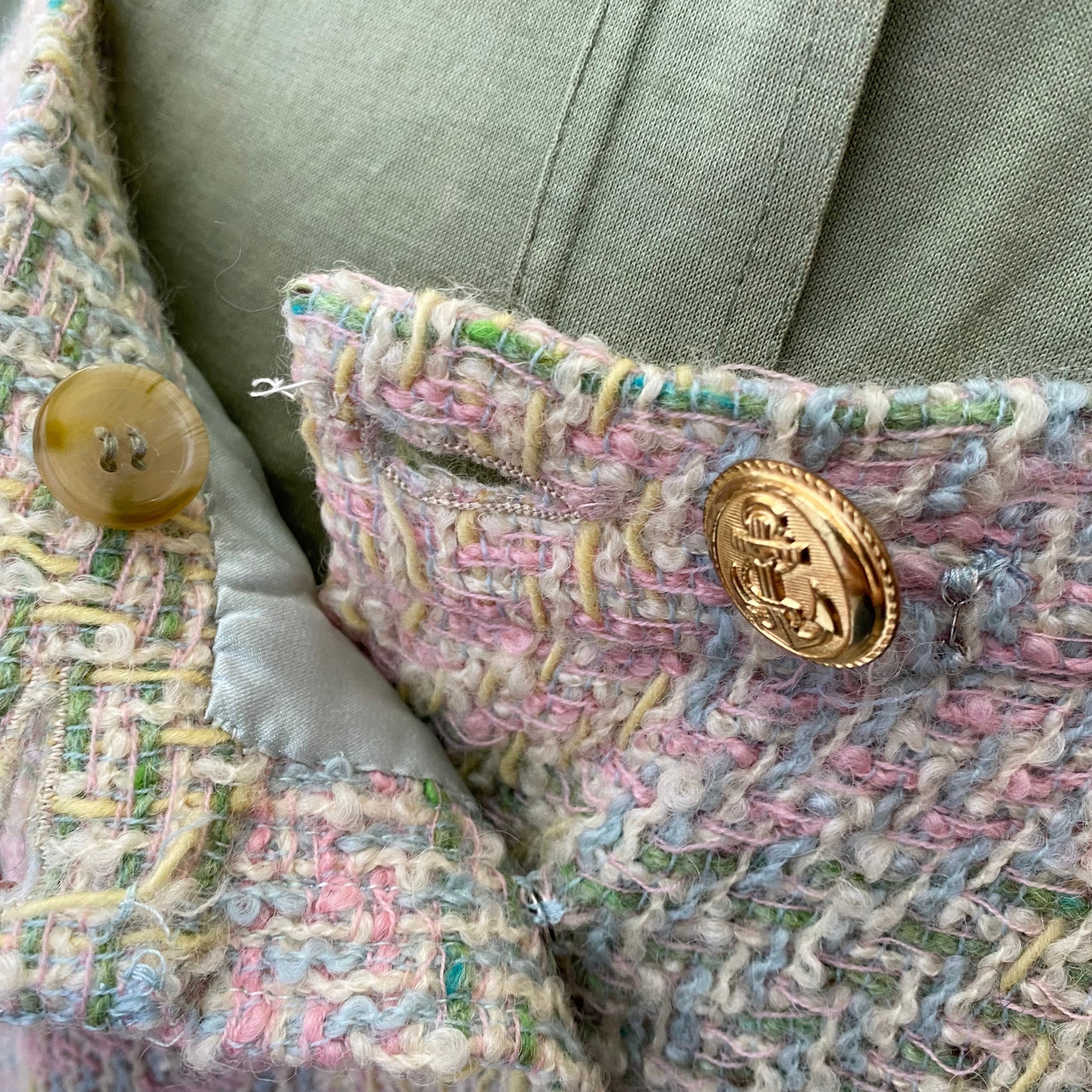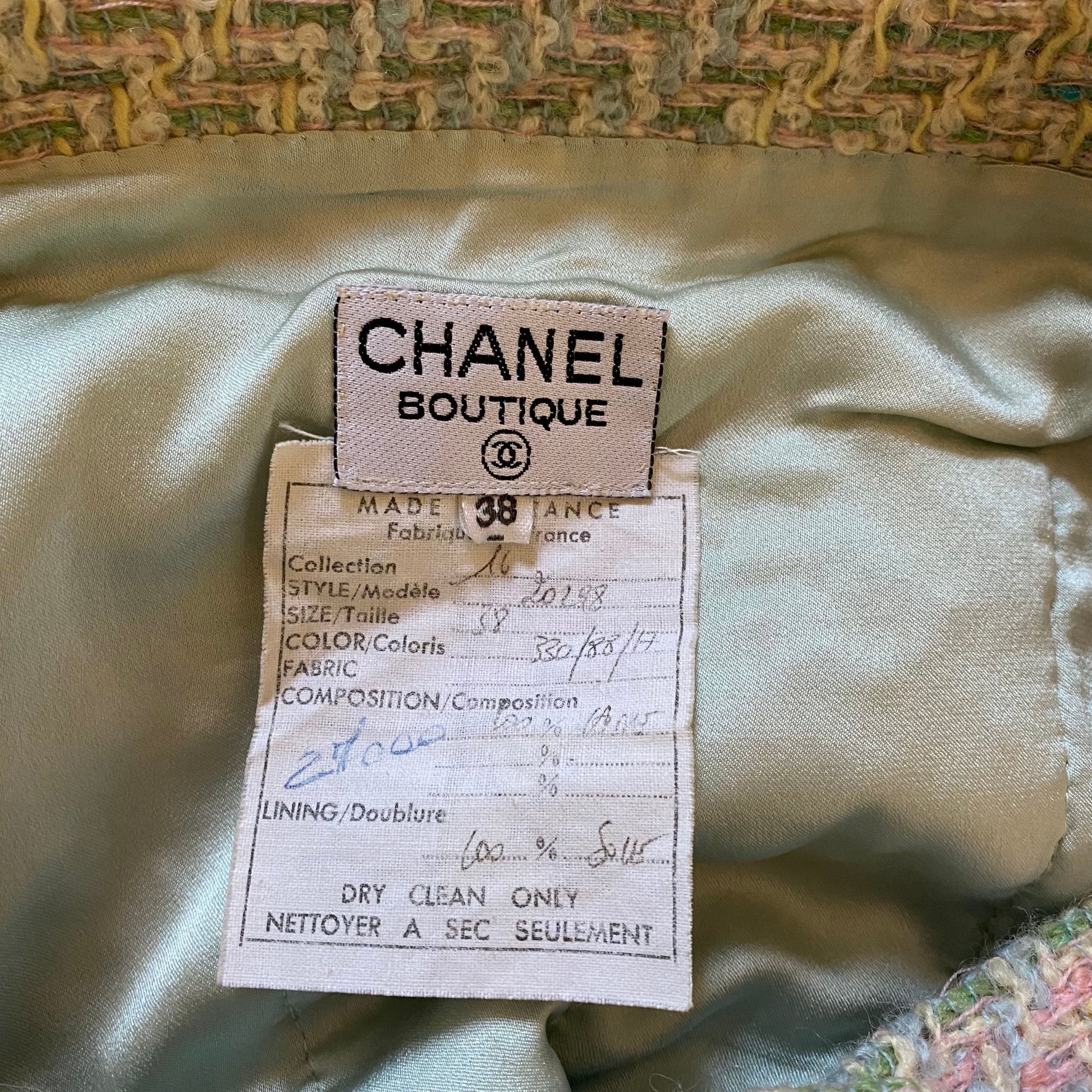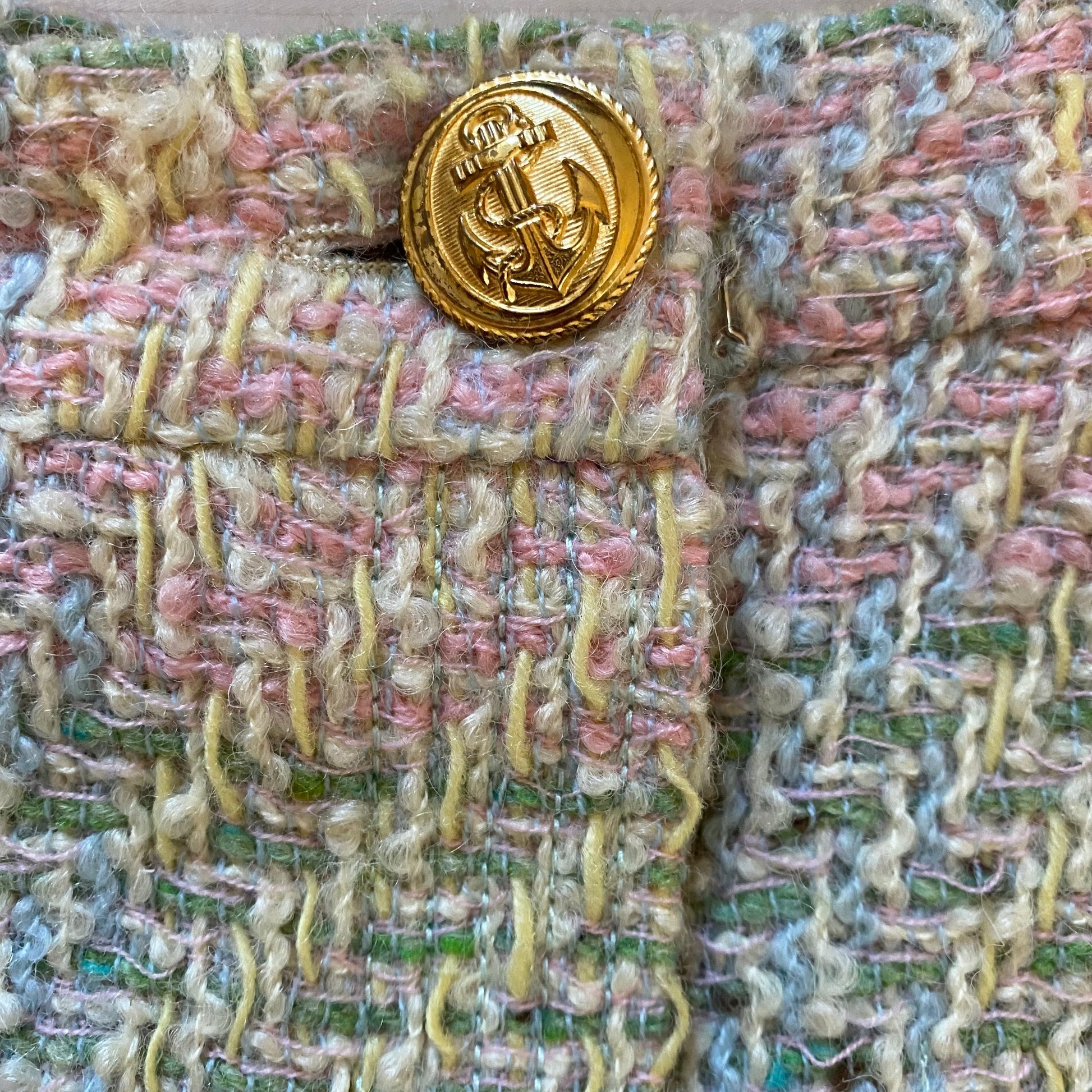 DESCRIPTION: Chanel Boutique straight knee length skirt, tweed fabric with sky & pink checks, silk lining. The button is not original