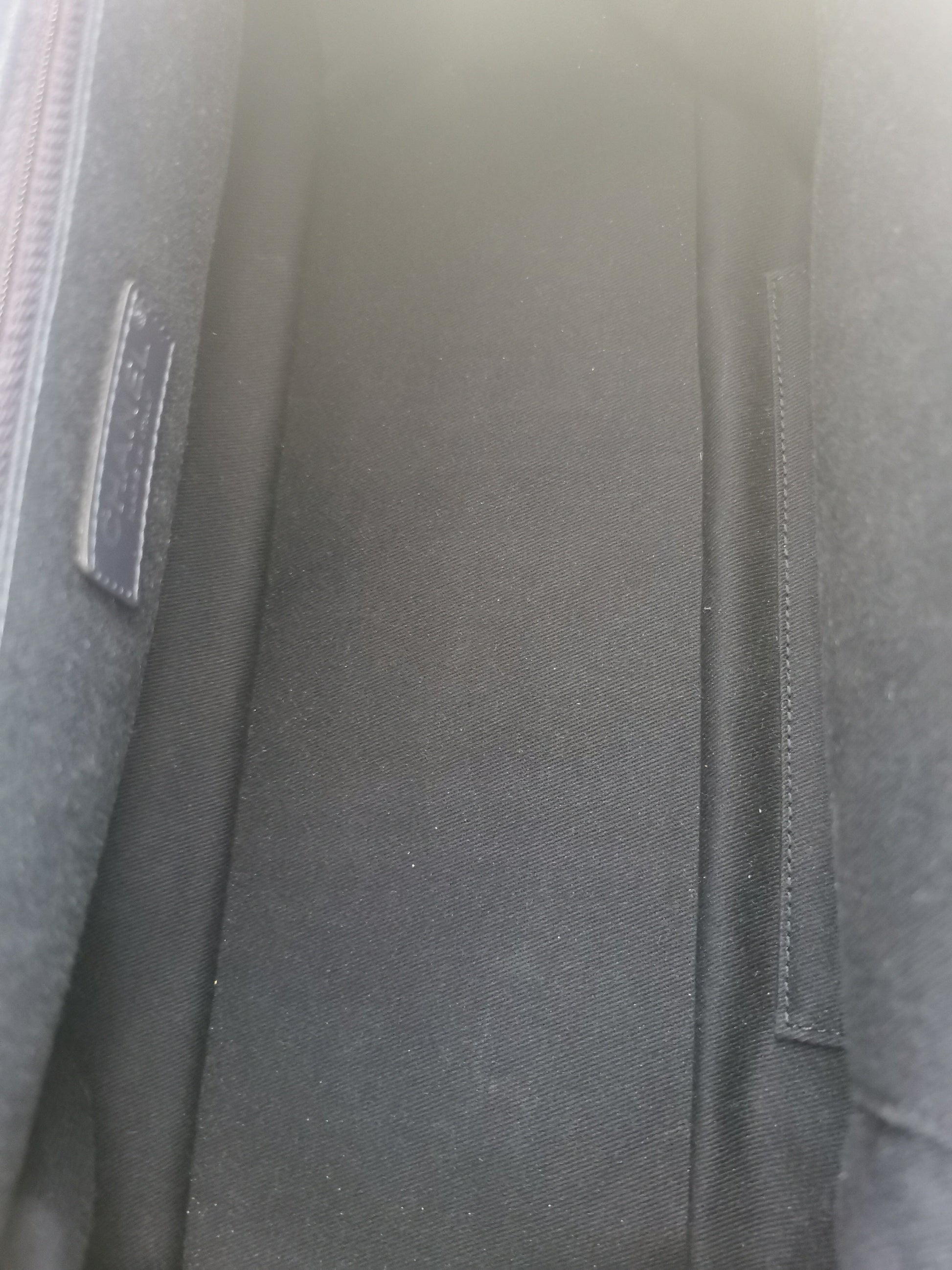 This beautiful Chanel Bowling Bag was made of light gray calfskin. On the front has the Bag a flap with the iconic CC closure, which can be New for an outer compartment on the Bag can open. The back of the Bag also has a large compartment. At the top there is an opening with a zipper, inside the Bag there are two compartments, one of which also has a zipper. the Bag has two dumbbells with which you can Bag comfortably in the hand can carry and also two longer chains on both sides of the bags, which are adjustable at will and thus can also be worn on the shoulder.