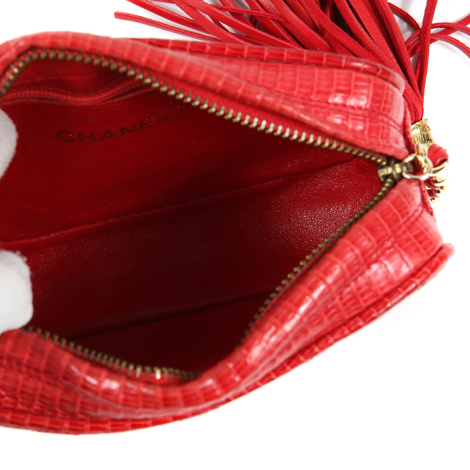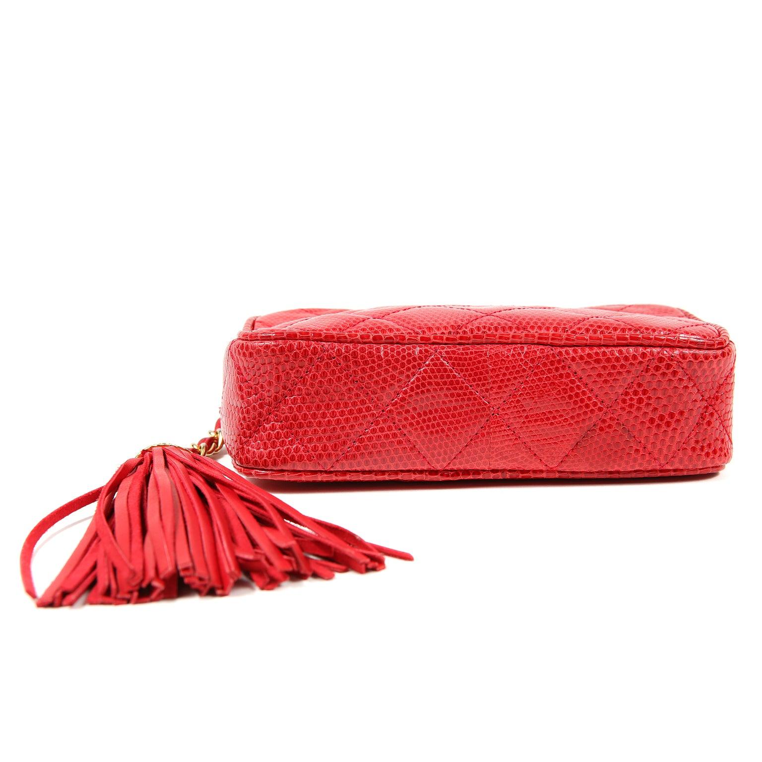 Bright red lizard skin is quilted in signature Chanel diamond pattern. Zippered top has an oversized leather tassel pull attached to a gold chain and leather entwined chain short strap. Red leather interior. Chanel , intact hologram and dust bag included.