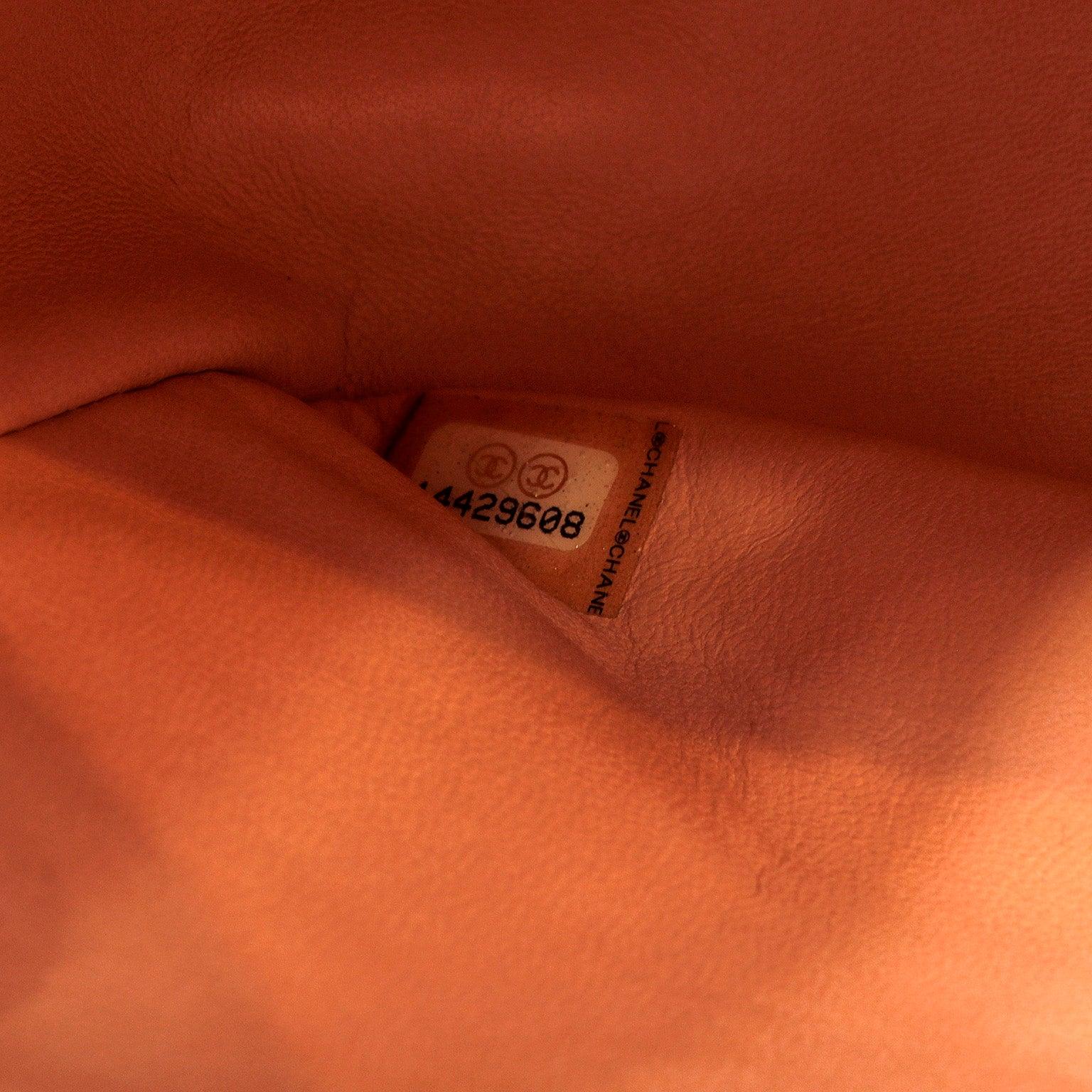 Ballerina pink python skin is accented with a silver interlocking CC twist lock on the front flap. Pink leather lining with a simple press snap closure on interior flap. Elegant leather and chain strap may be carried single or double. Made in France. Intact hologram and dust bag included.