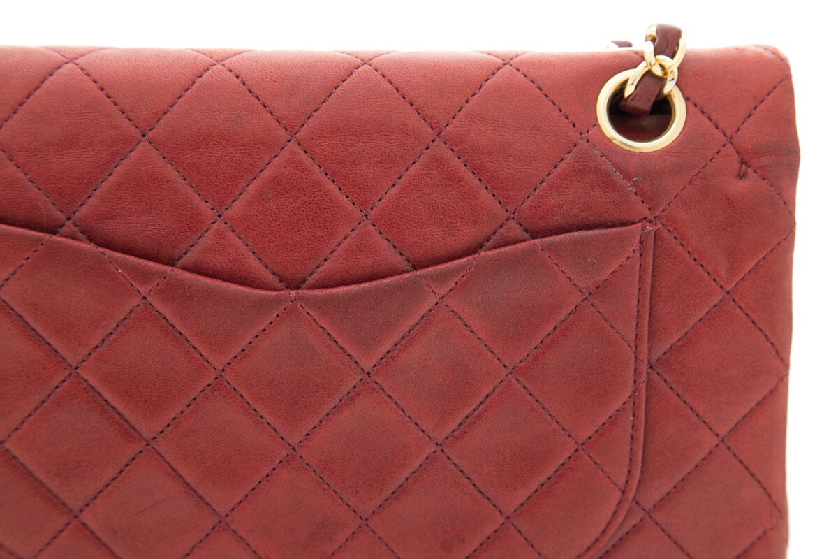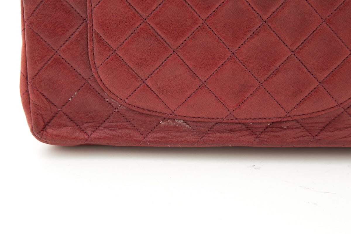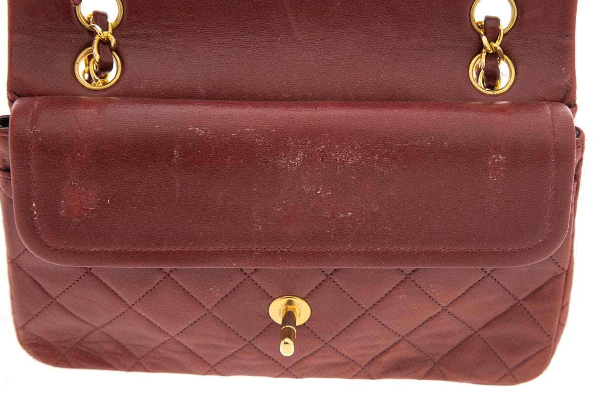 Chanel Burgundy Medium Classic Double Flap Handbag ASIS; Includes box and Dust Bag. This item shows signs of wear throughout.