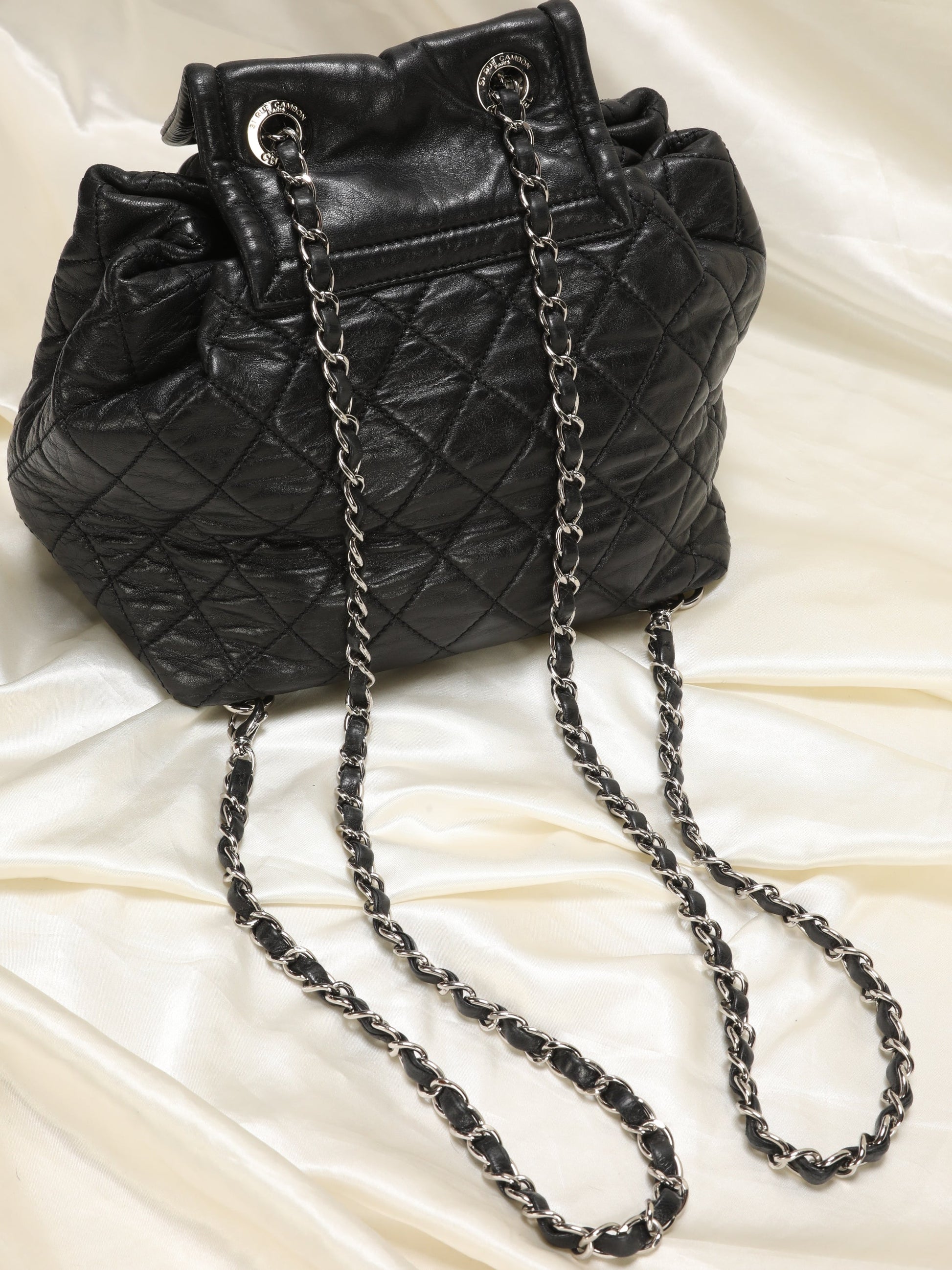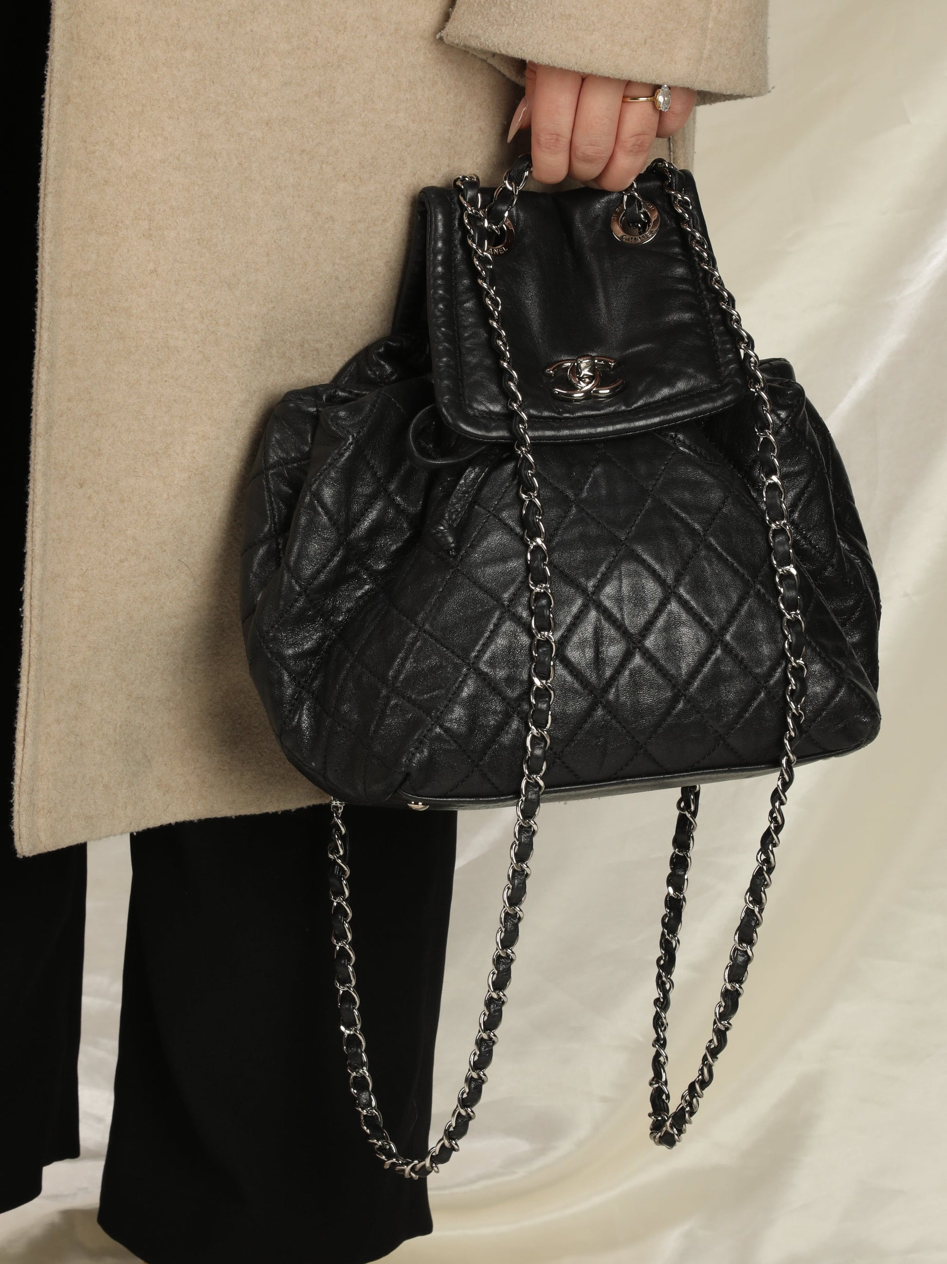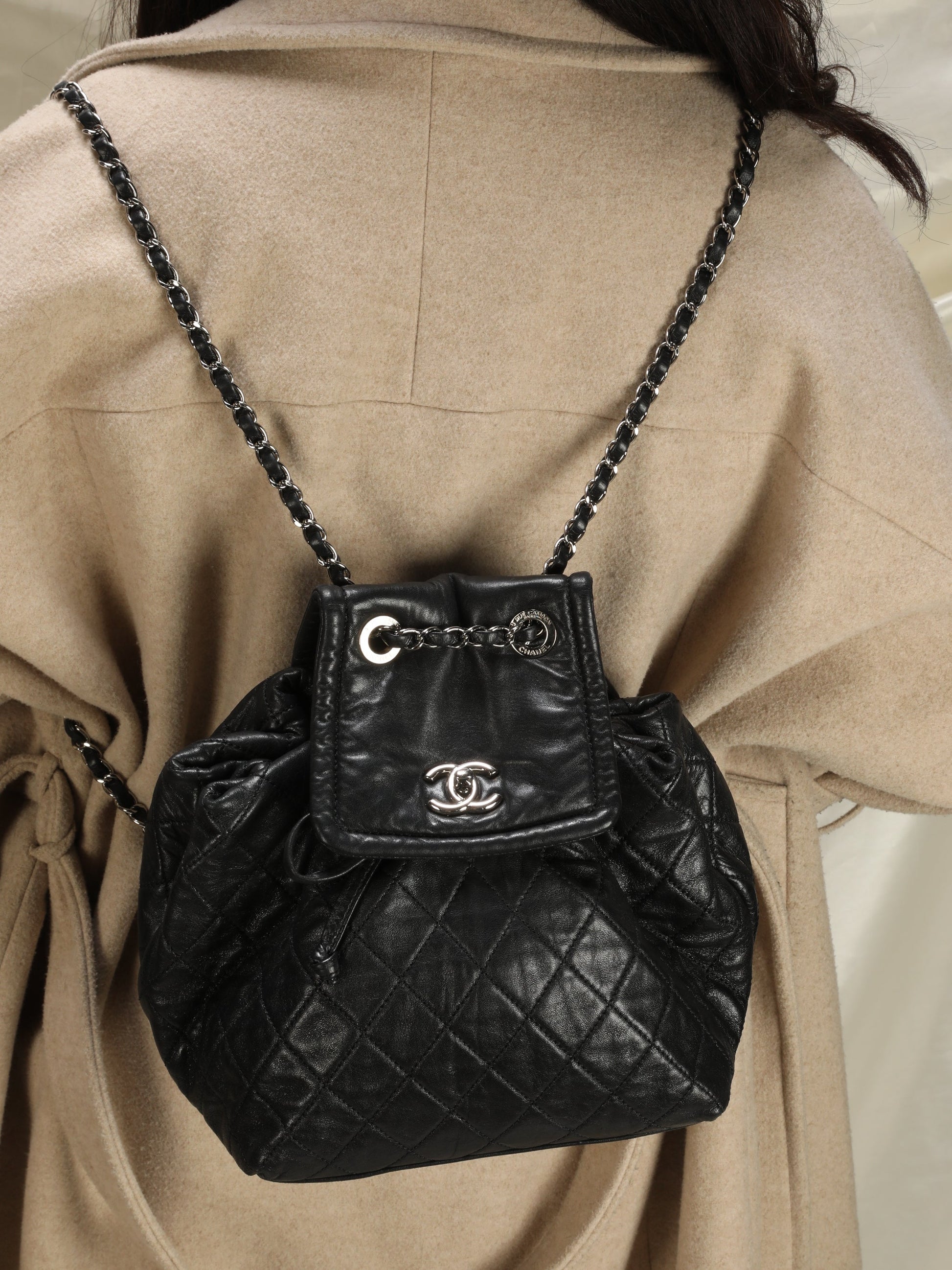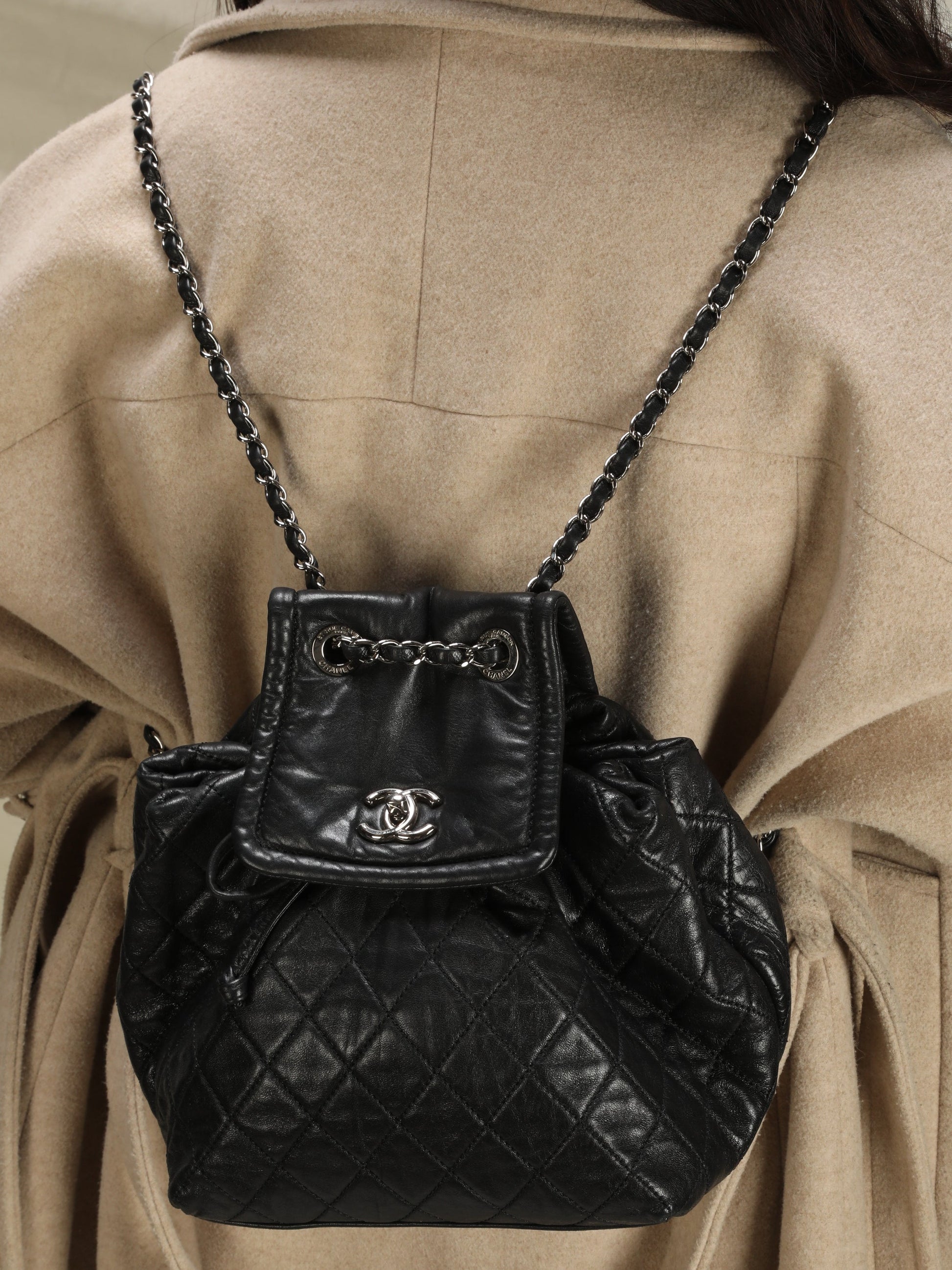 TWIN WITH ME!! I have the exact same backpack and love using her for traveling or quick trips on-the-go. Versatile piece can be as a backpack or chain strap can turn into a shoulder bag!!! Extra secure with a Chanel turnlock logo on the front and additional drawstring. Calfskin leather makes this more durable and less prone to scuffing. Can be loved for years to come. Perfect for traveling or festival season!??