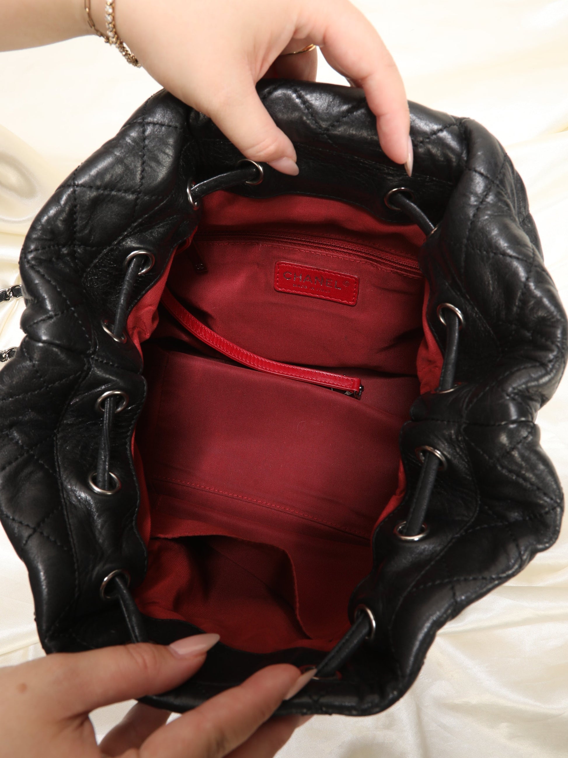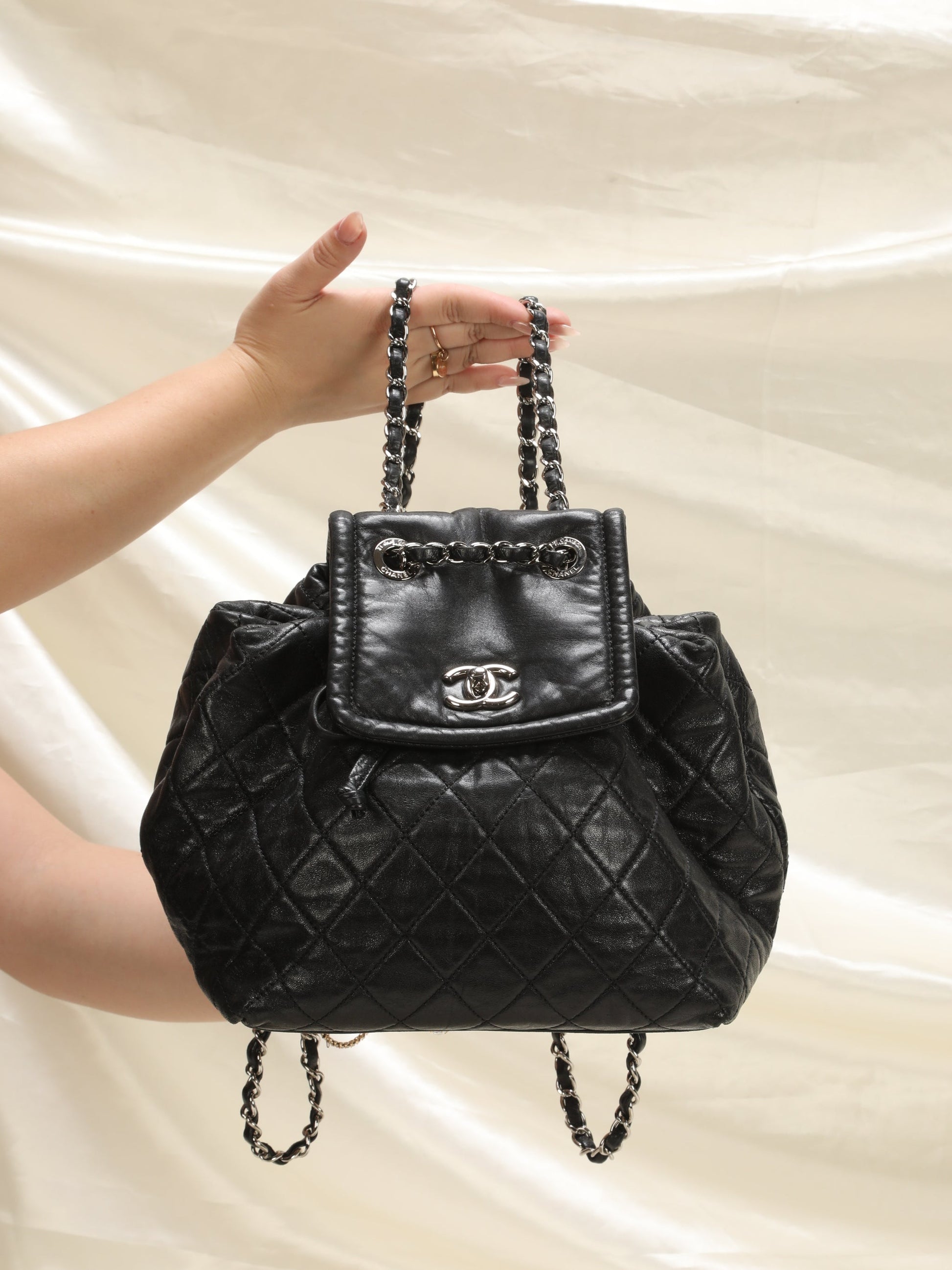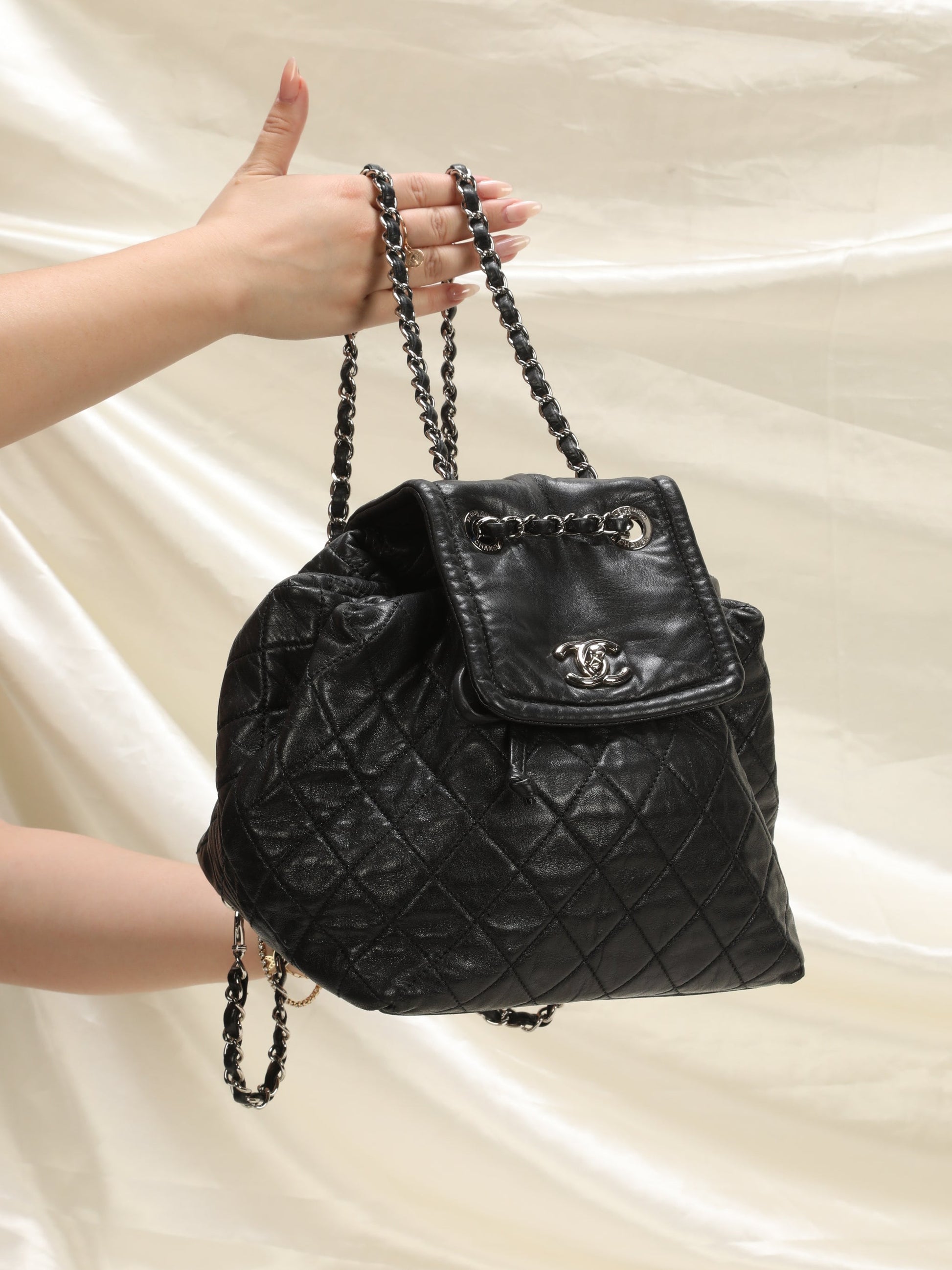 TWIN WITH ME!! I have the exact same backpack and love using her for traveling or quick trips on-the-go. Versatile piece can be as a backpack or chain strap can turn into a shoulder bag!!! Extra secure with a Chanel turnlock logo on the front and additional drawstring. Calfskin leather makes this more durable and less prone to scuffing. Can be loved for years to come. Perfect for traveling or festival season!??