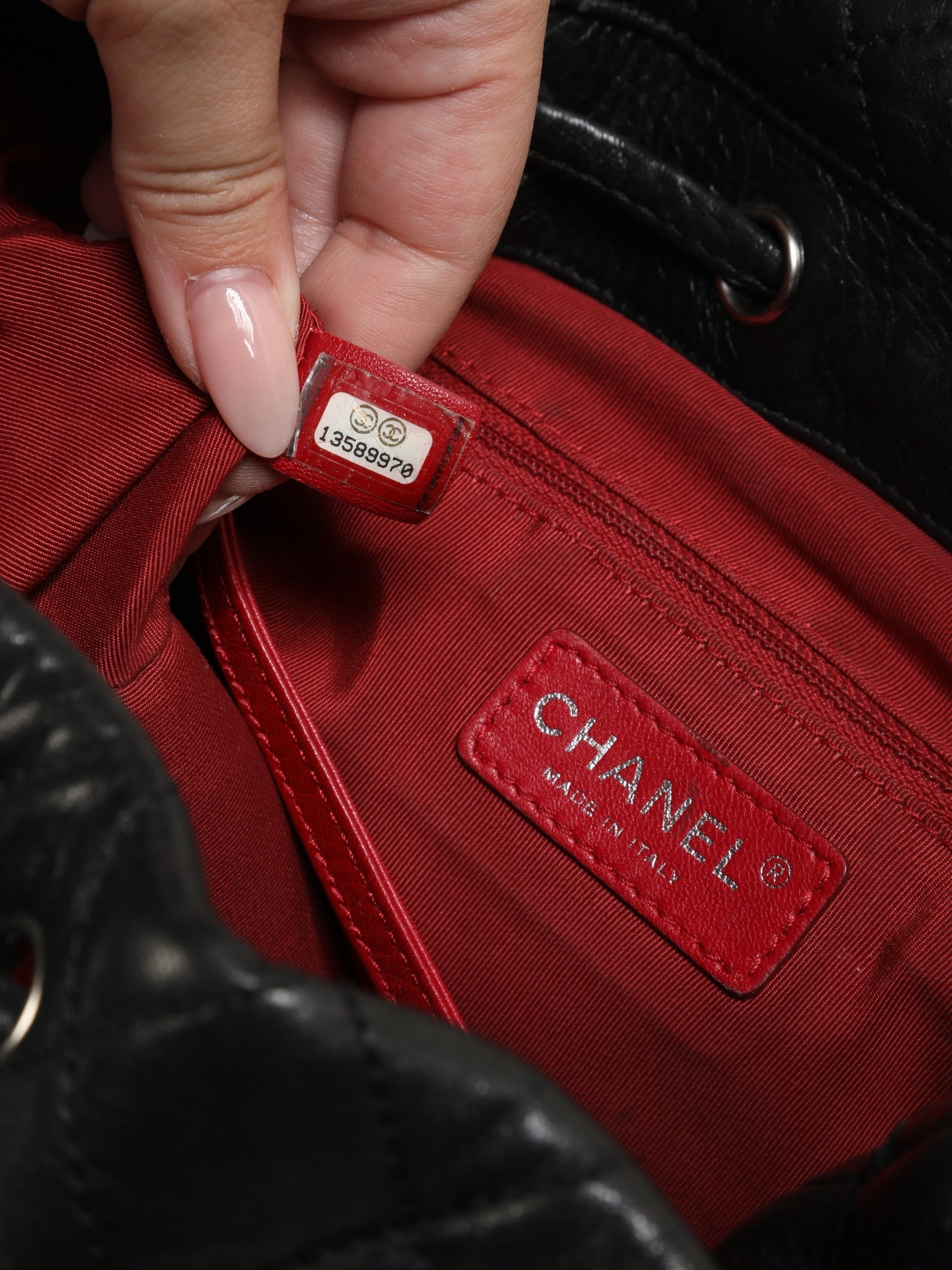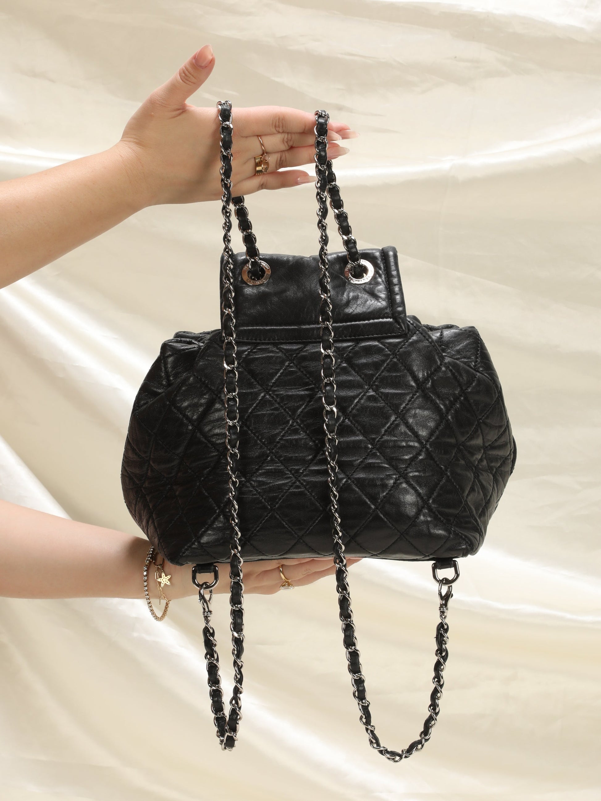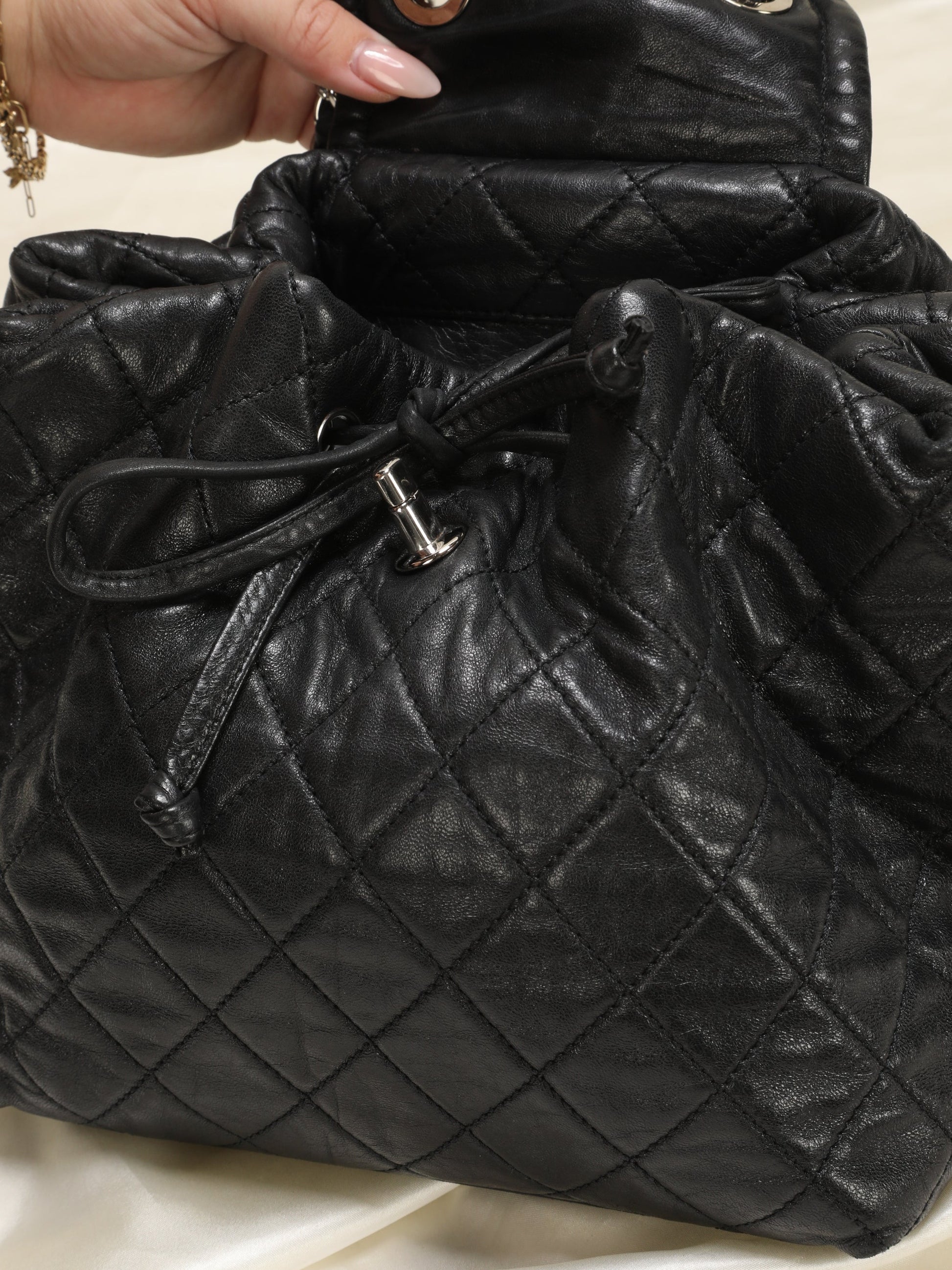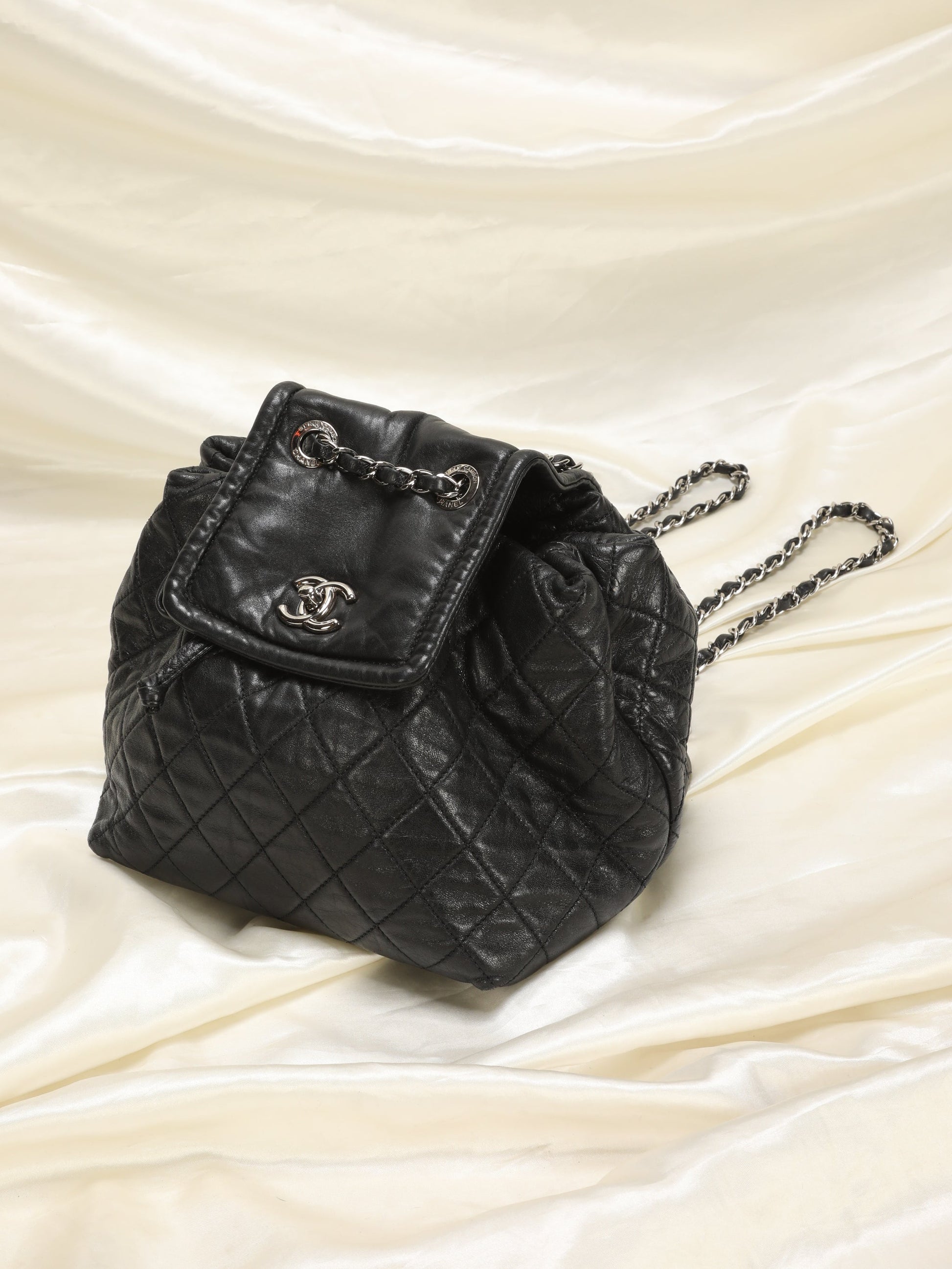 TWIN WITH ME!! I have the exact same backpack and love using her for traveling or quick trips on-the-go. Versatile piece can be as a backpack or chain strap can turn into a shoulder bag!!! Extra secure with a Chanel turnlock logo on the front and additional drawstring. Calfskin leather makes this more durable and less prone to scuffing. Can be loved for years to come. Perfect for traveling or festival season!??