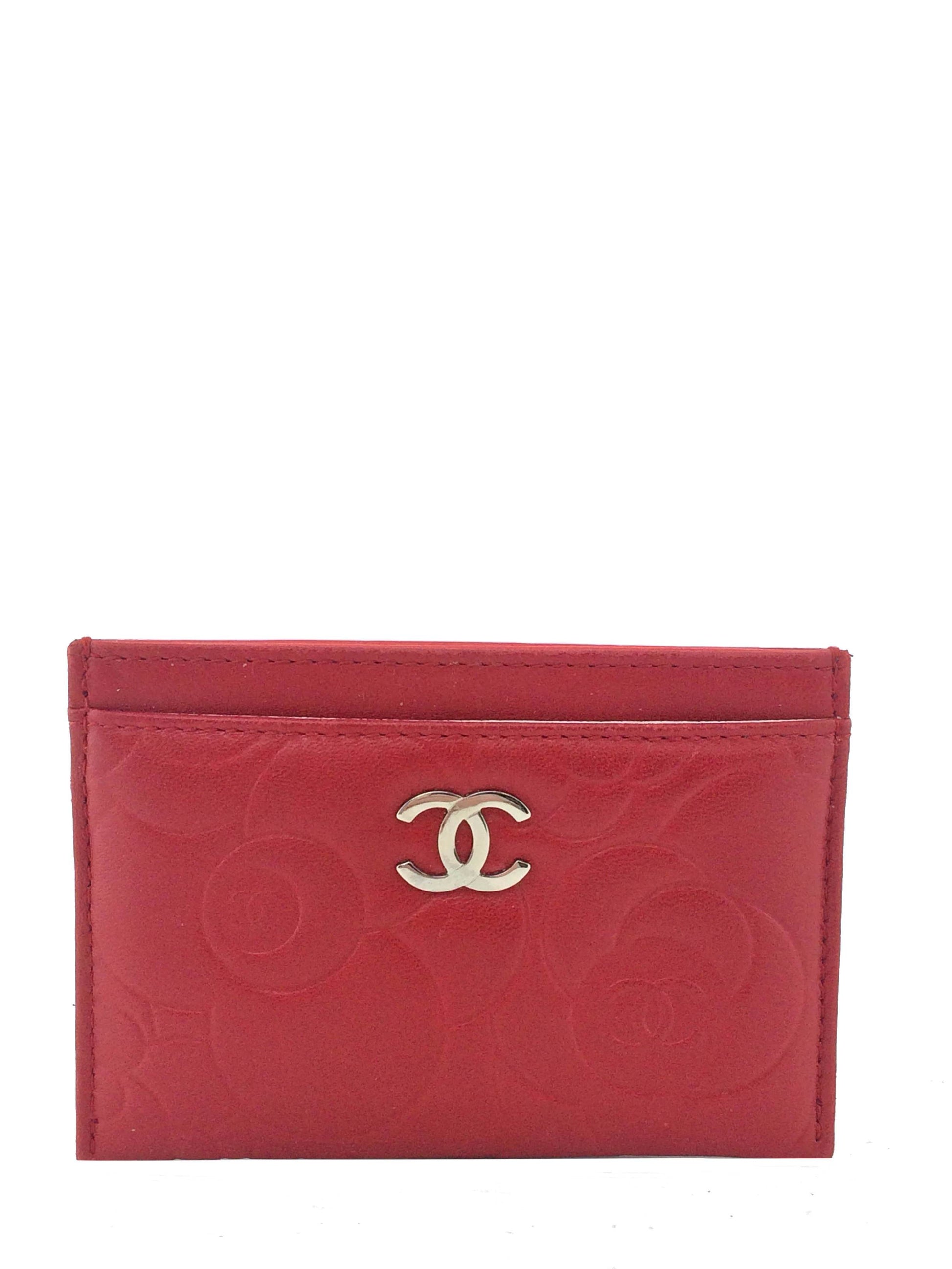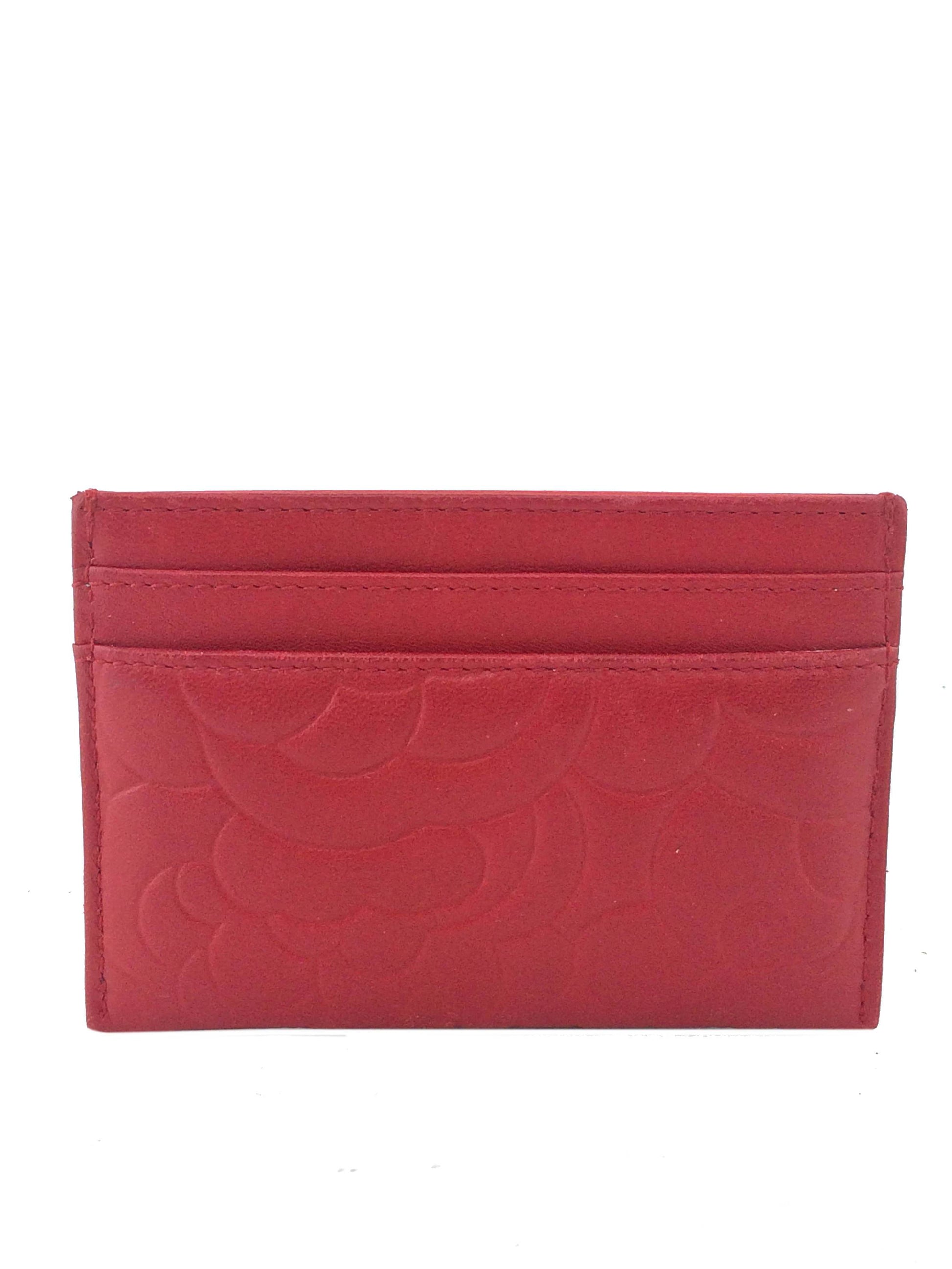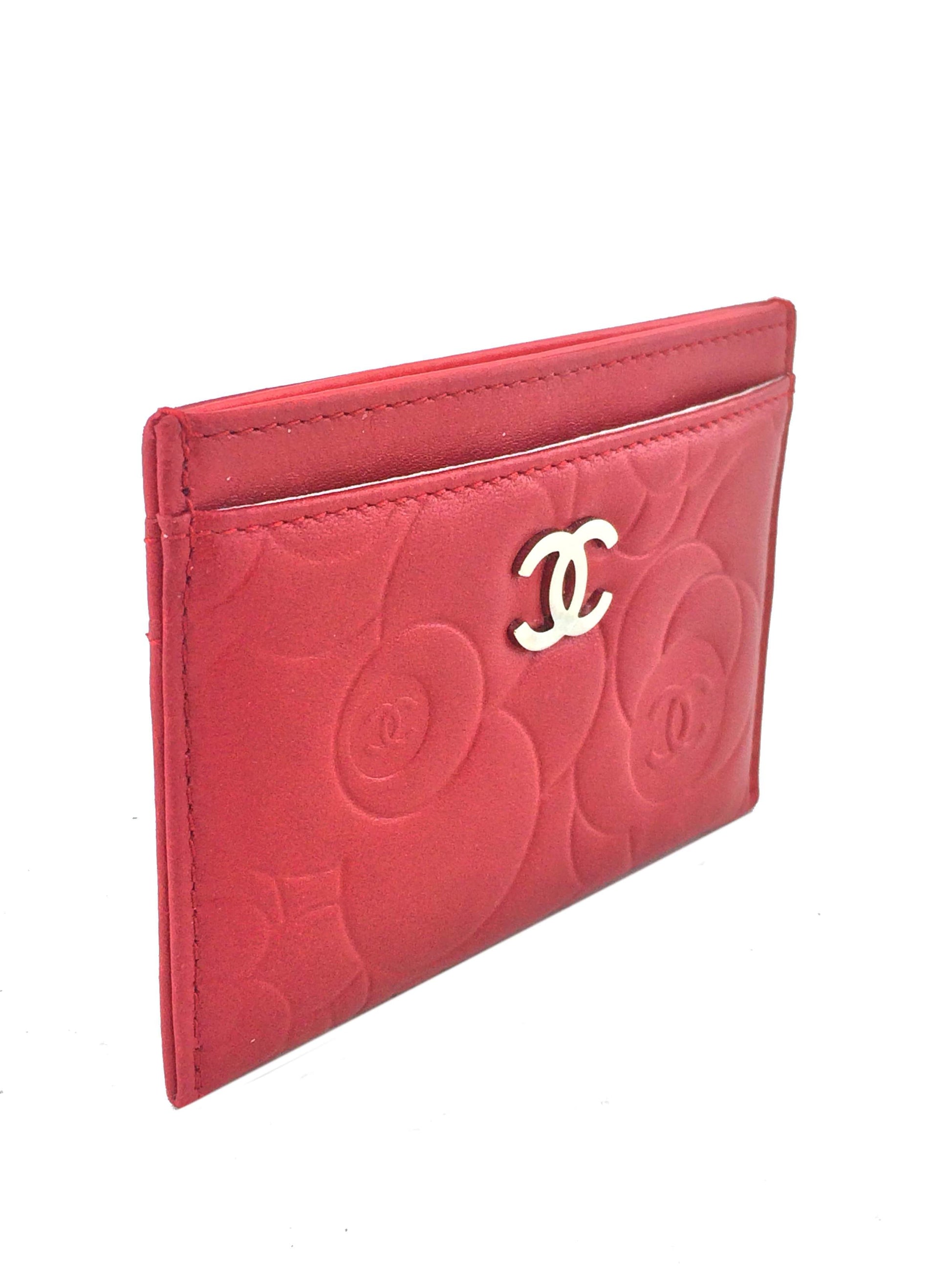 This Chanel Camellia Card Holder adds a touch of style to?carrying your cash and credit cards. This chic accessory is beautifully crafted from buttery-soft camellia flower embossed red lambskin with a silver-tone signature 'CC' accent at front and exterior card slots.