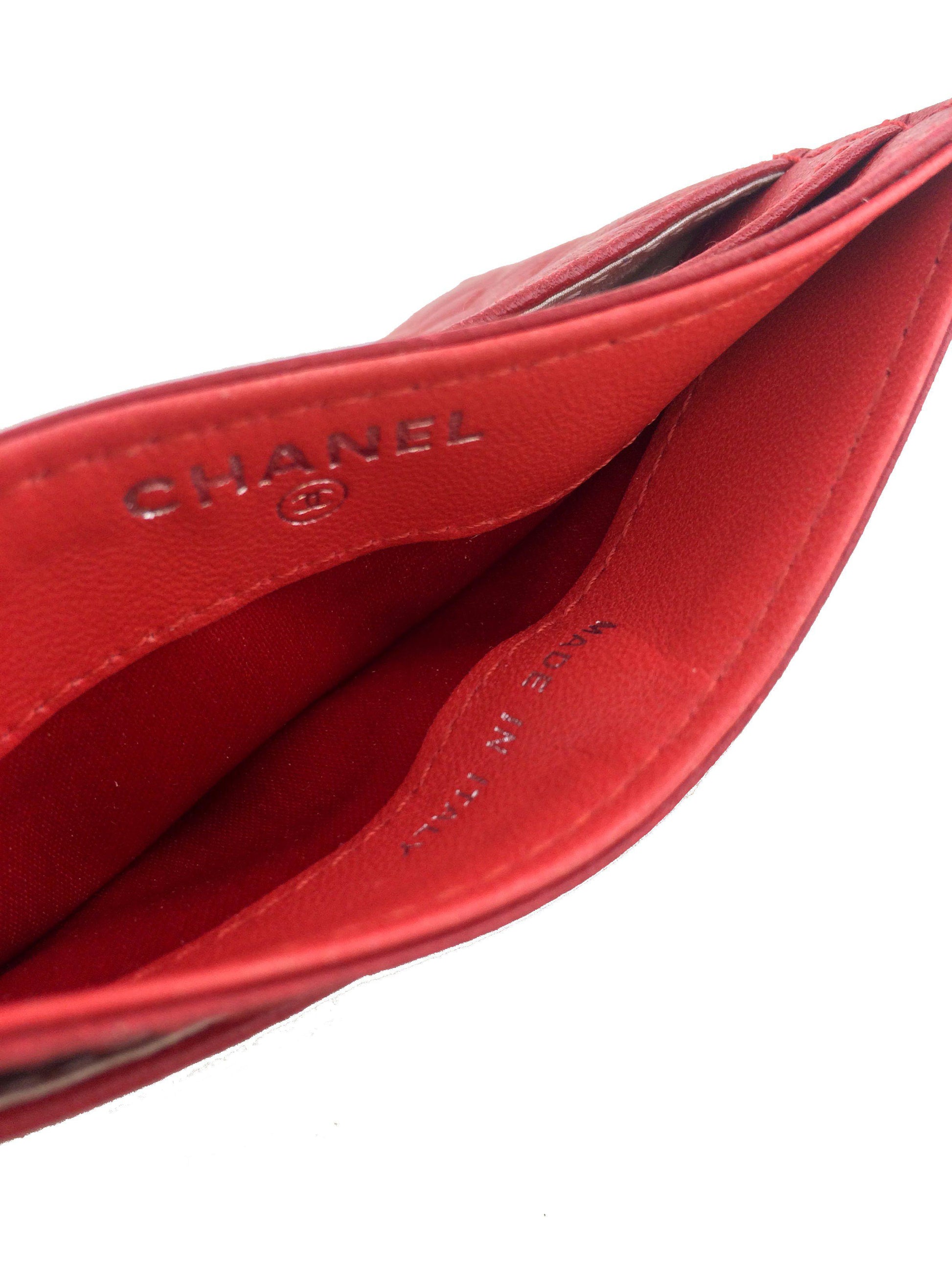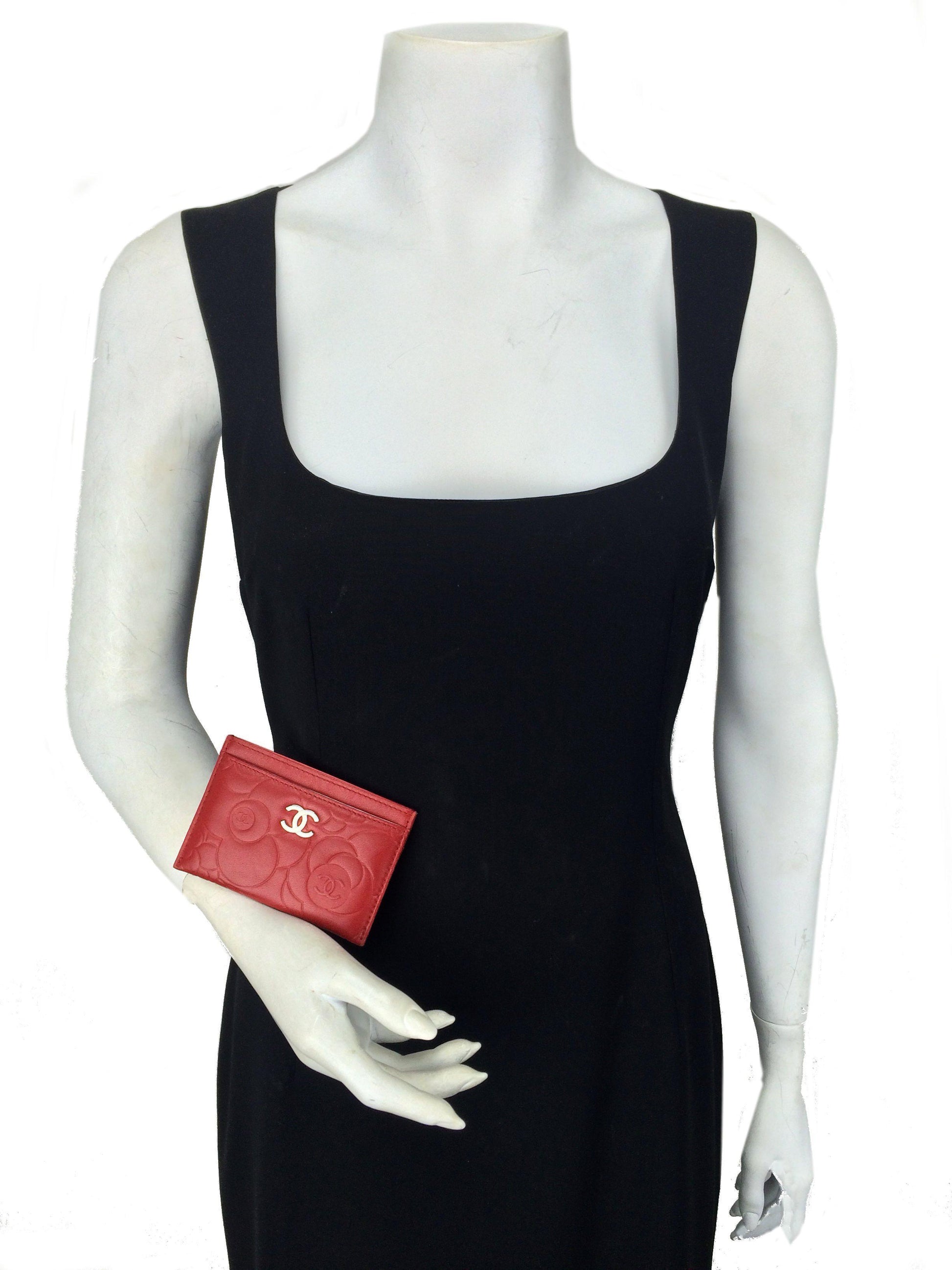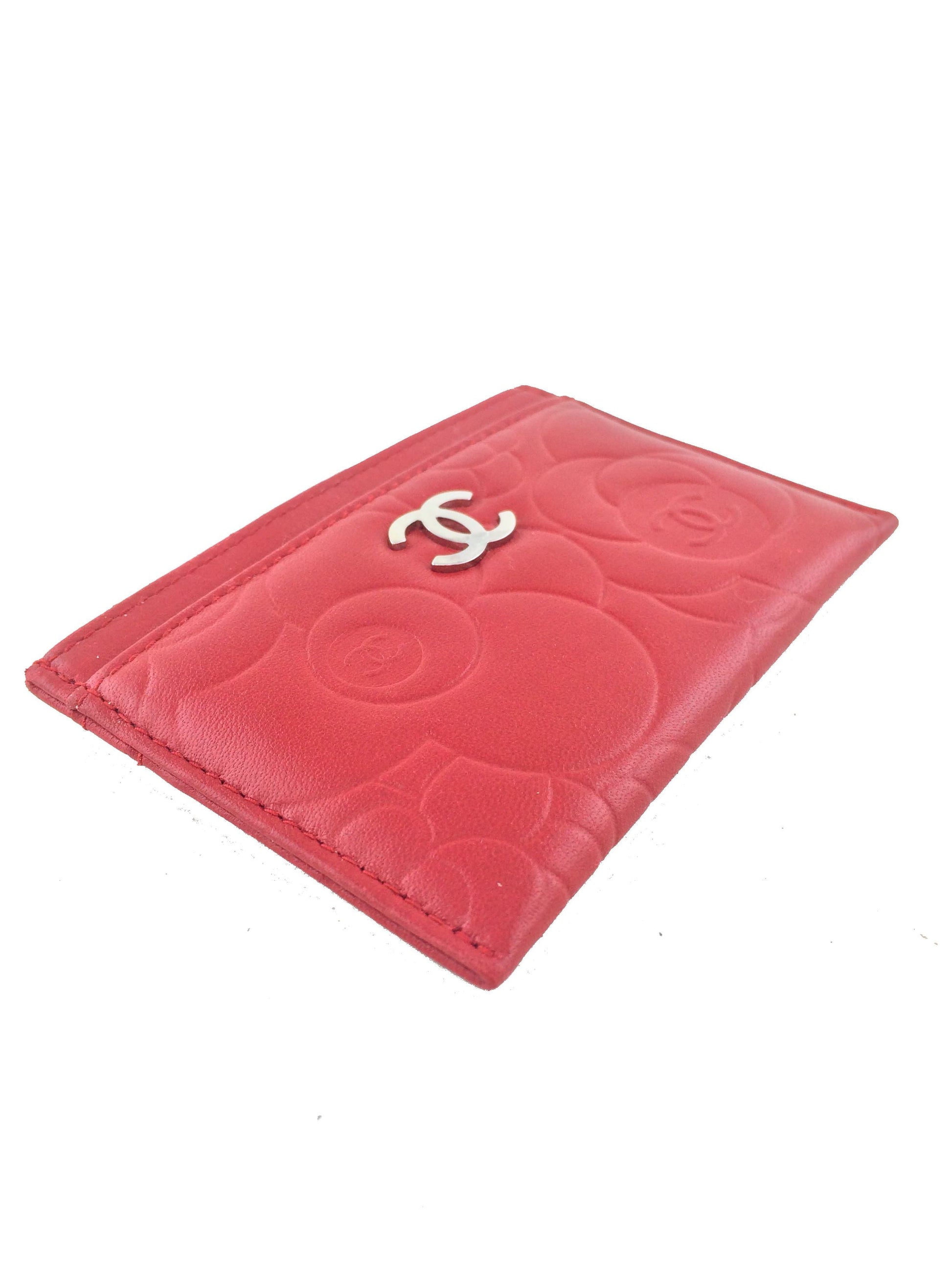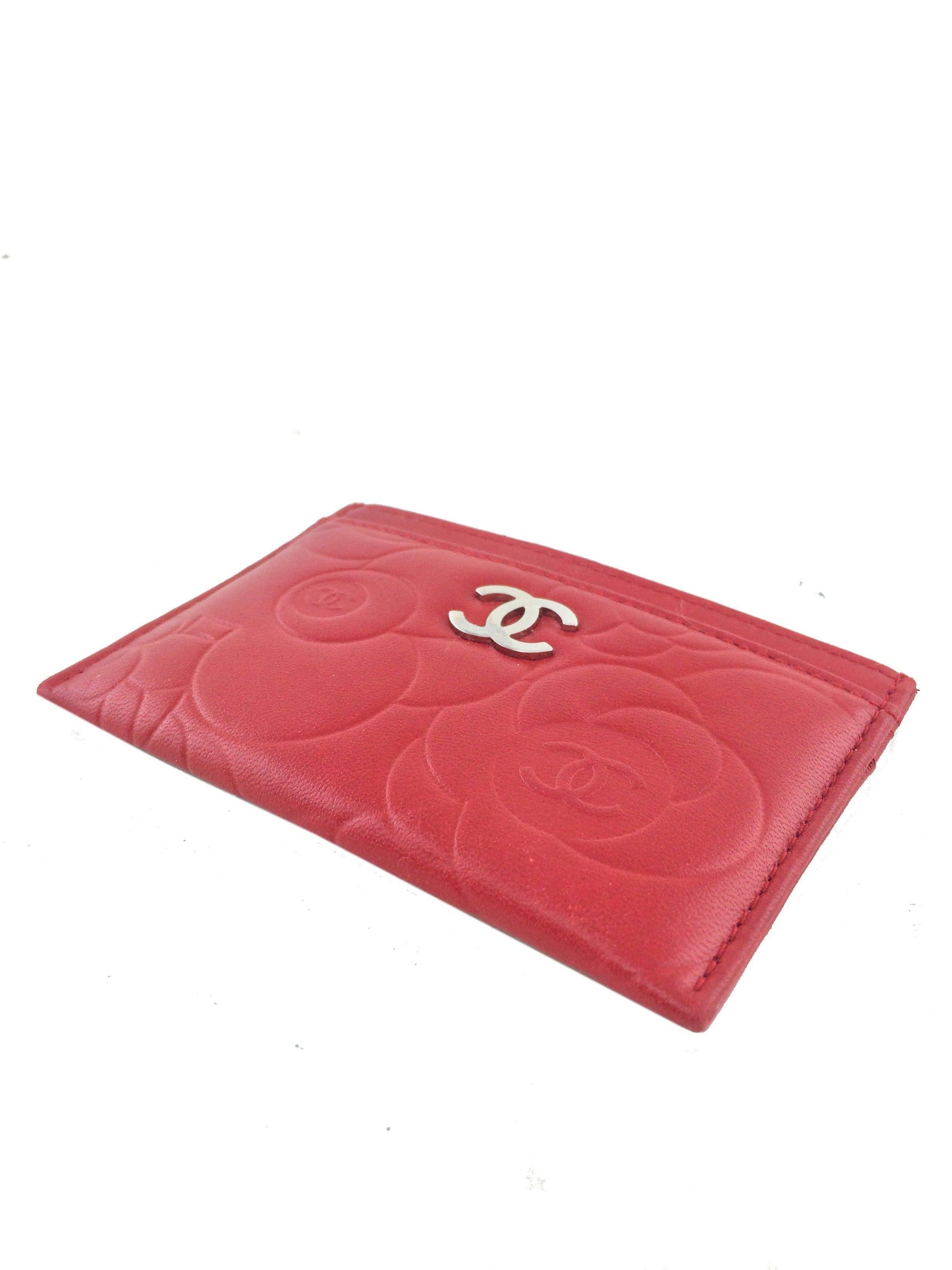 This Chanel Camellia Card Holder adds a touch of style to?carrying your cash and credit cards. This chic accessory is beautifully crafted from buttery-soft camellia flower embossed red lambskin with a silver-tone signature 'CC' accent at front and exterior card slots.