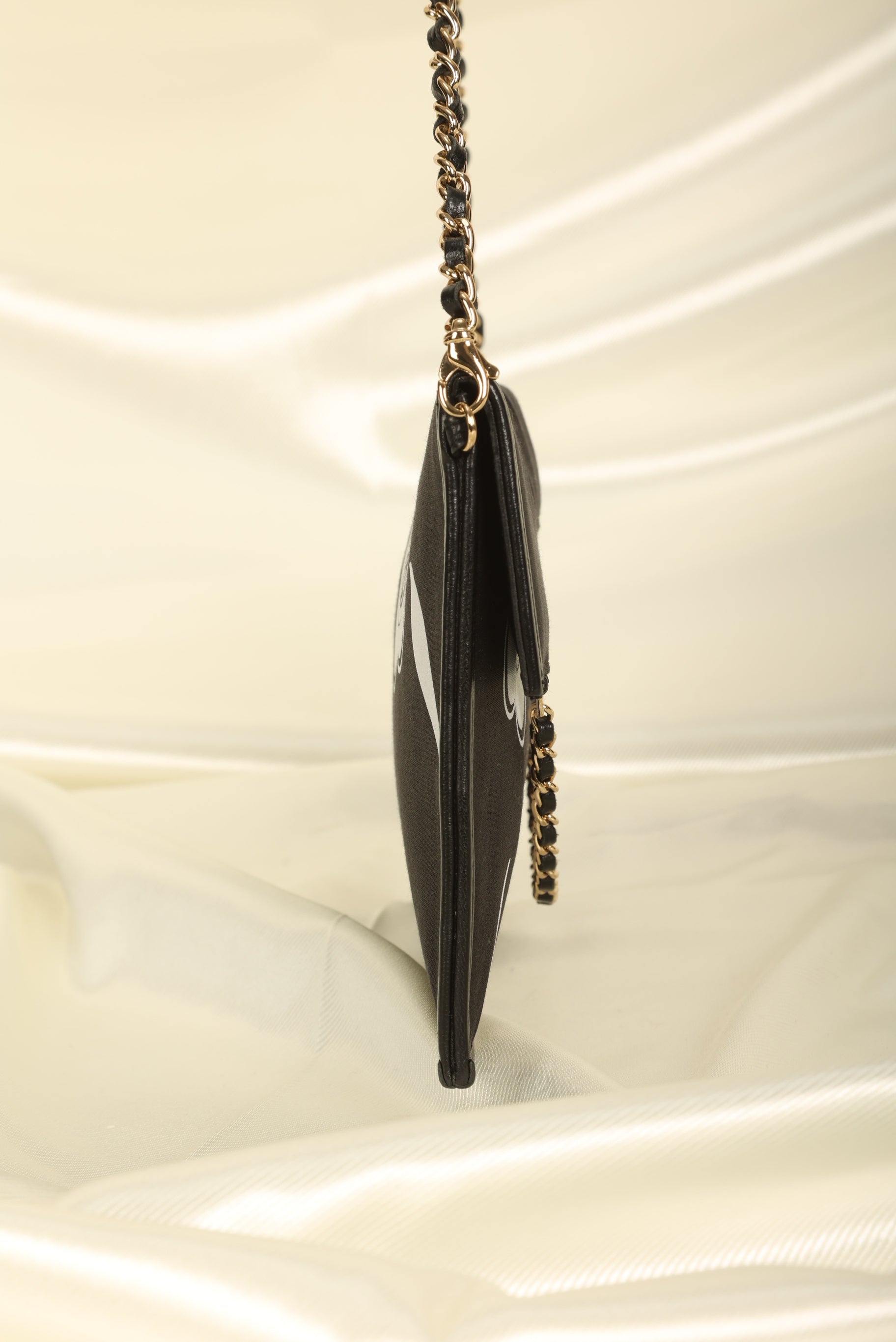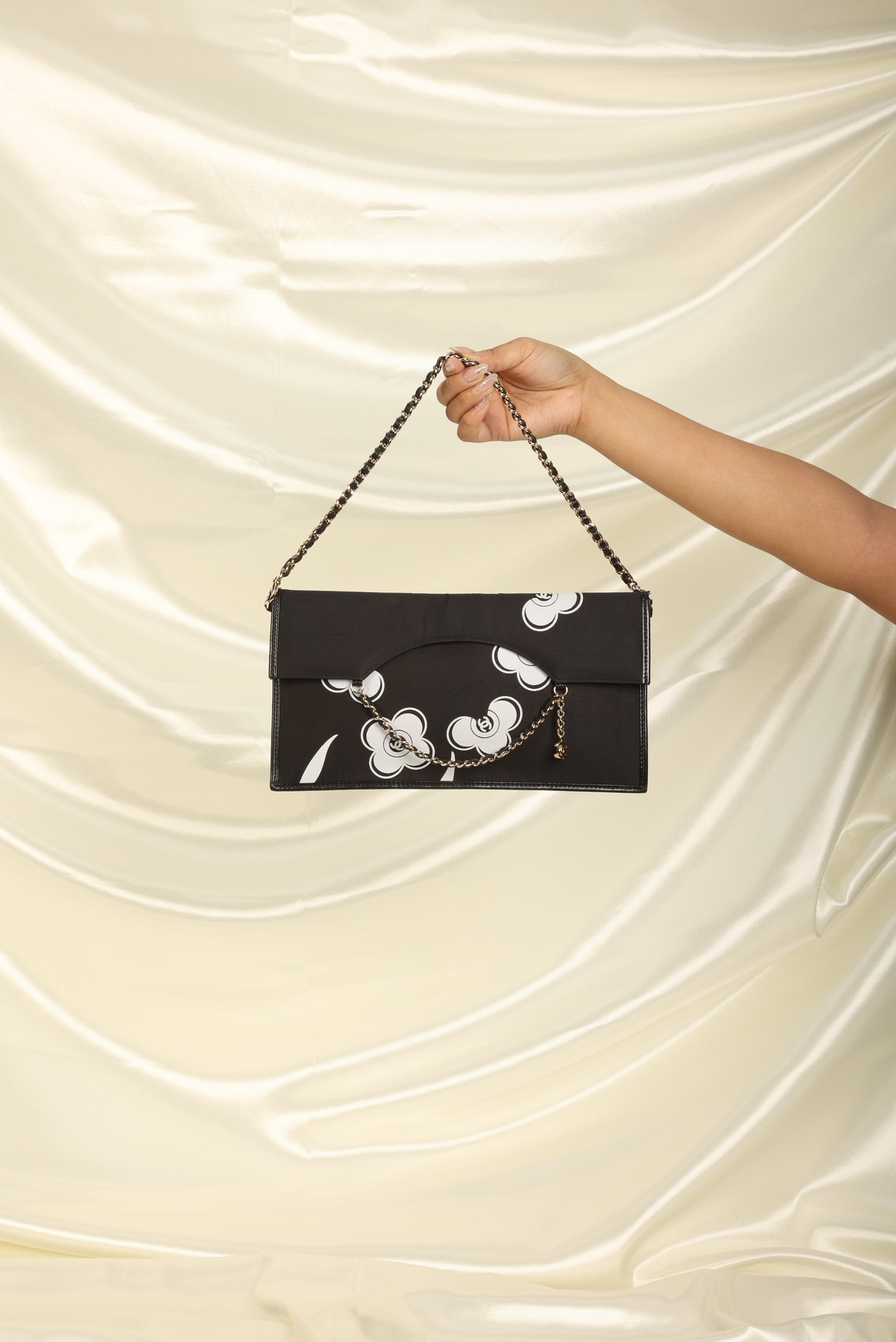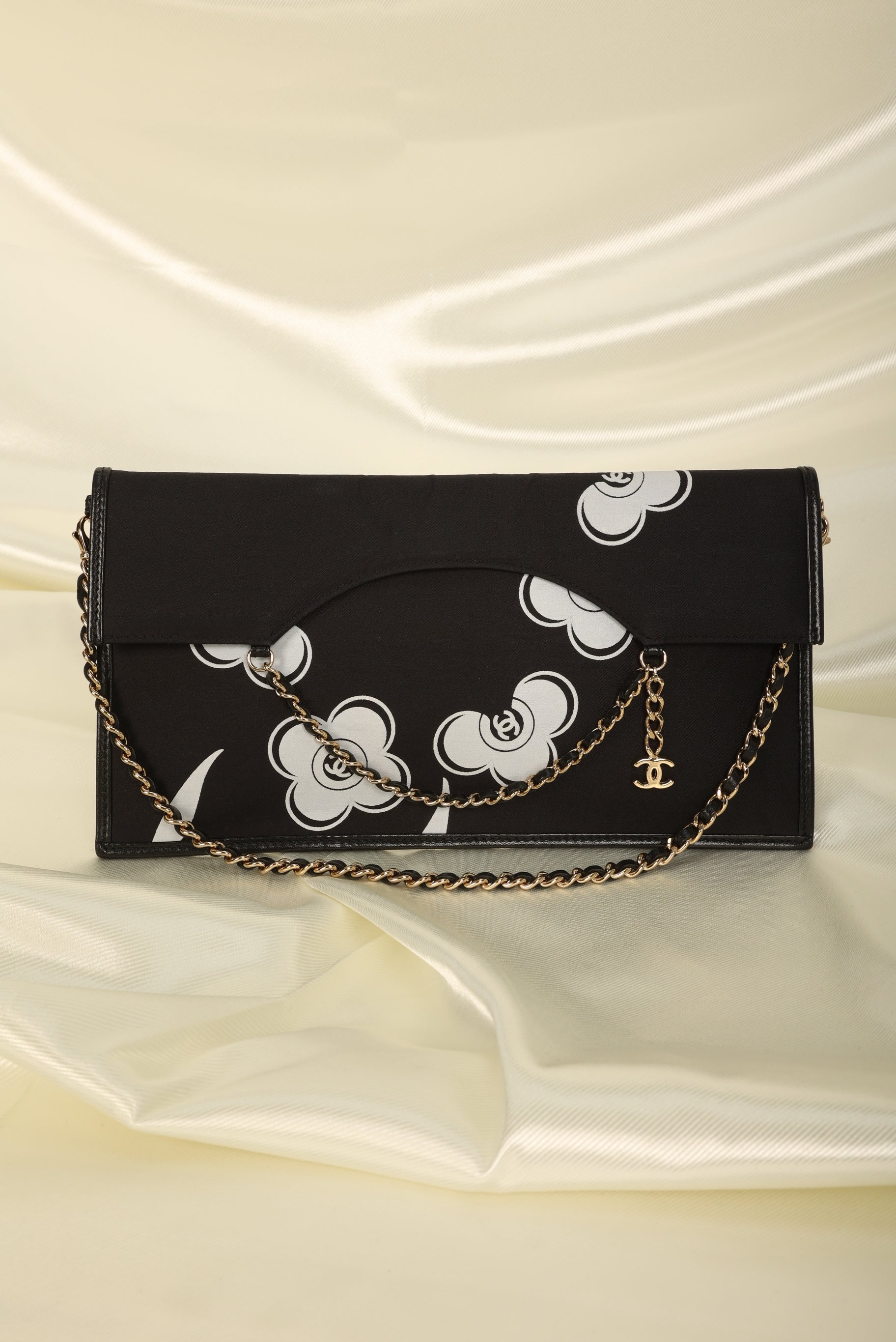 Introducing a Chanel pochette in the flat envelope style with the iconic camellia flower print. The light gold chain is removable, showing this gem's versatility in casual and classy settings. It's a true collector's item for the fashion connoisseur who would like to add it to their every day style.