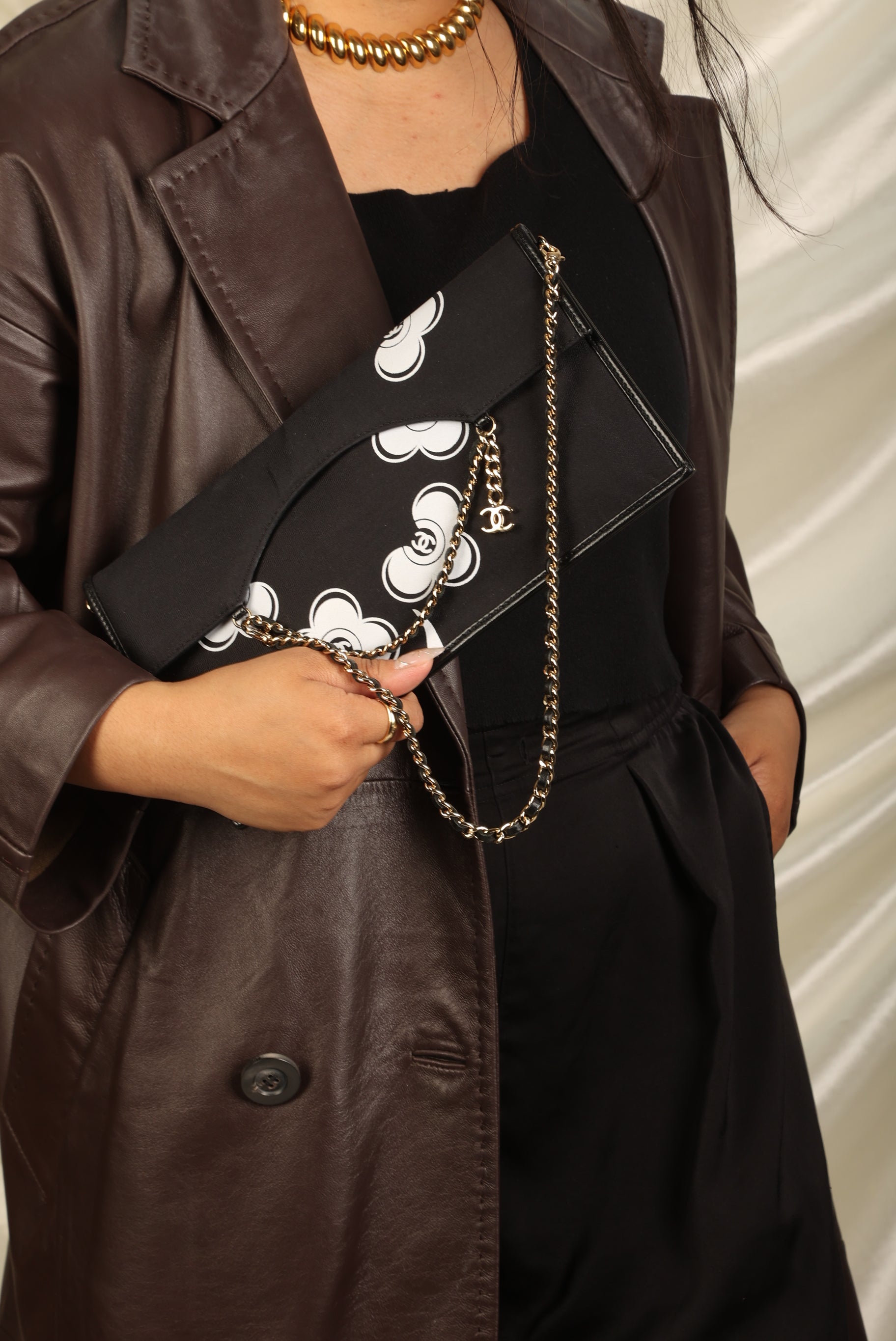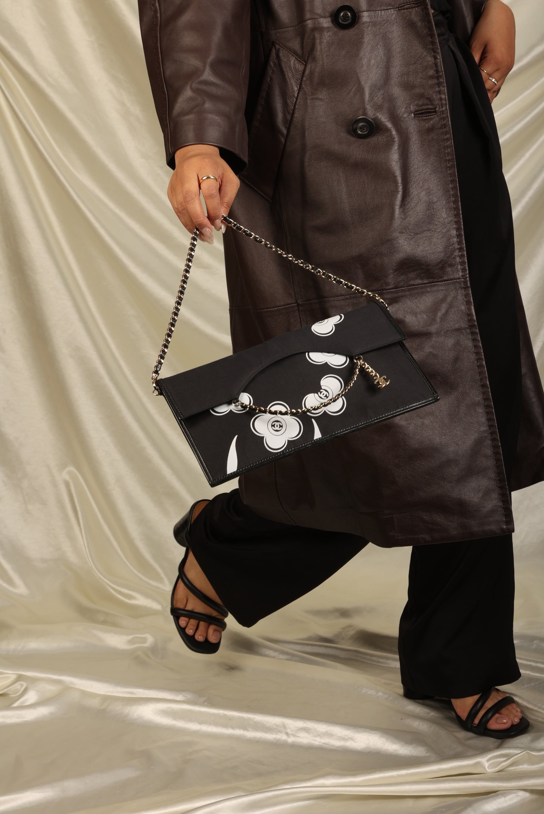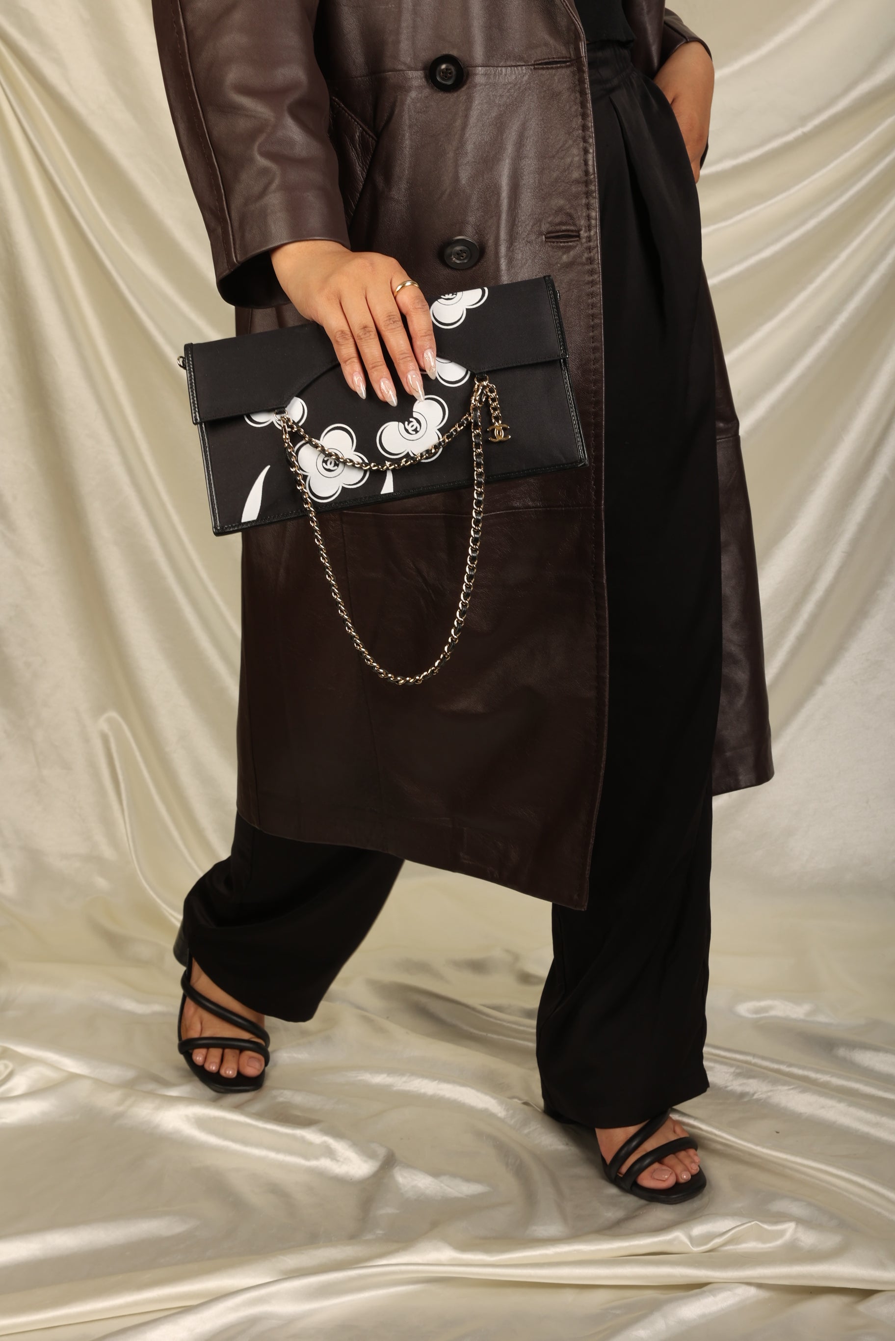 Introducing a Chanel pochette in the flat envelope style with the iconic camellia flower print. The light gold chain is removable, showing this gem's versatility in casual and classy settings. It's a true collector's item for the fashion connoisseur who would like to add it to their every day style.