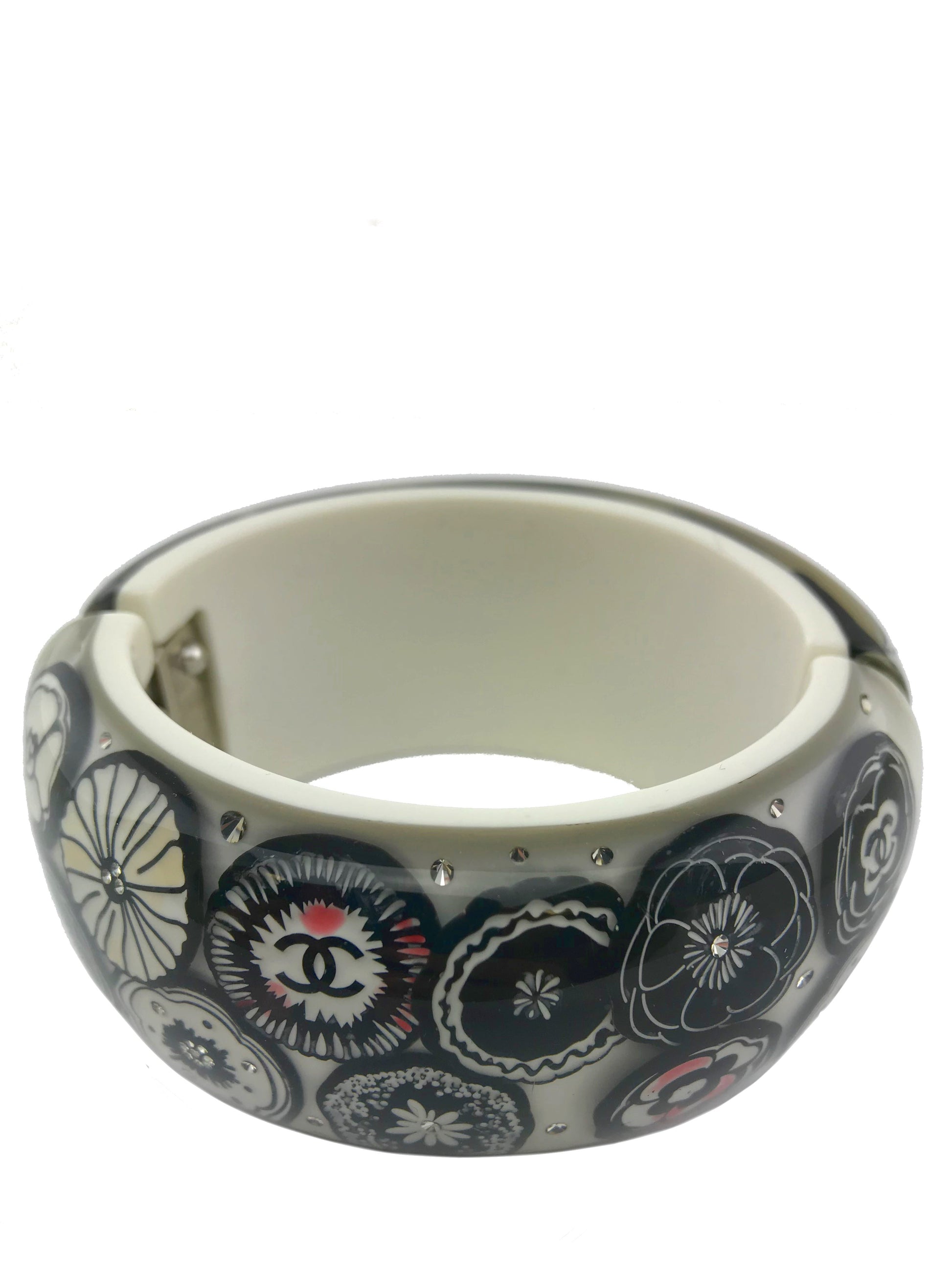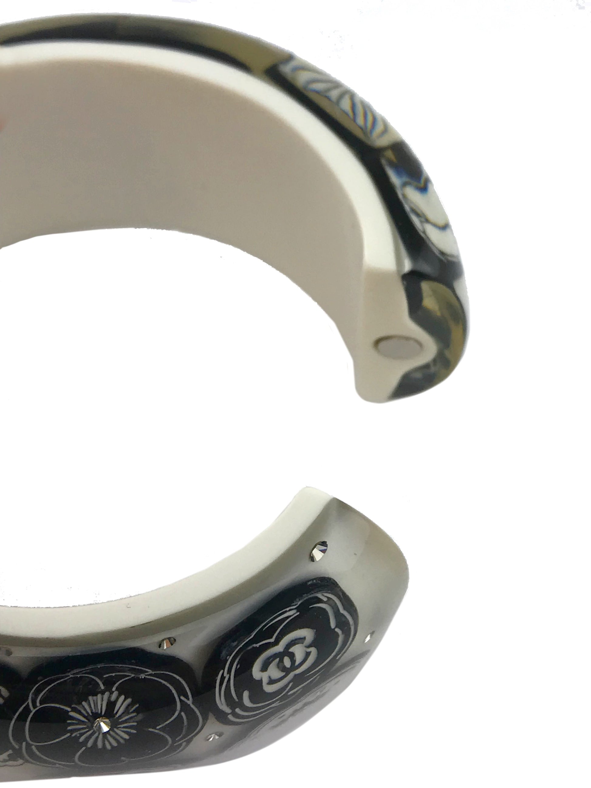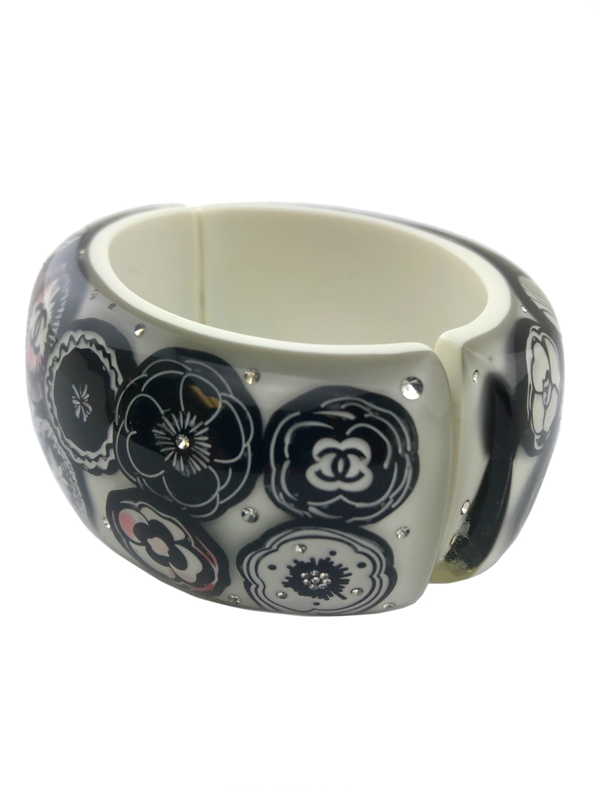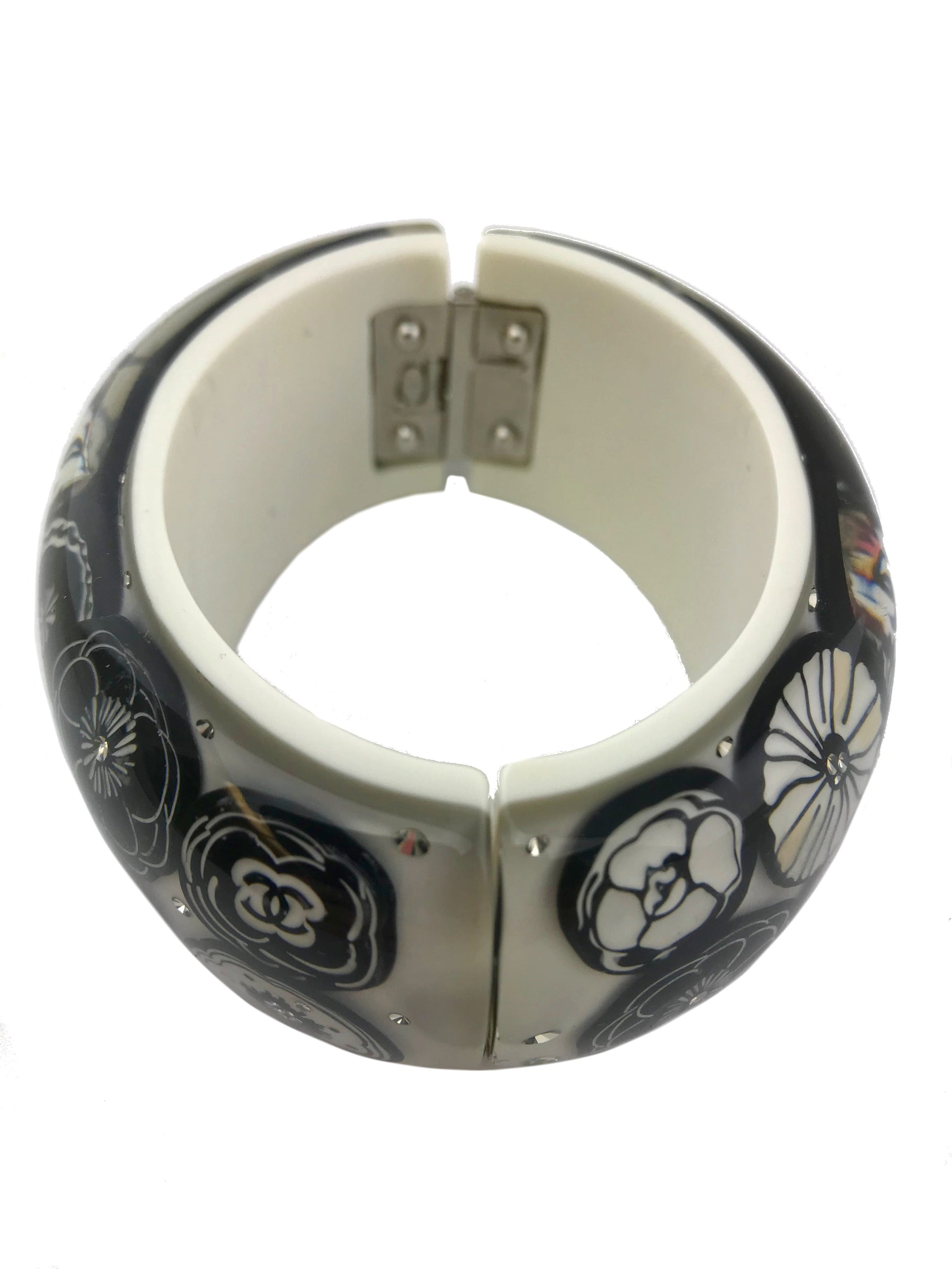 We the ity of this?one-of-a-kind?Chanel Camellia Flower Lucite Cuff Bracelet. Featuring gorgeous?black and white Camellia flowers with hints of color and a hinged magnetic closure.