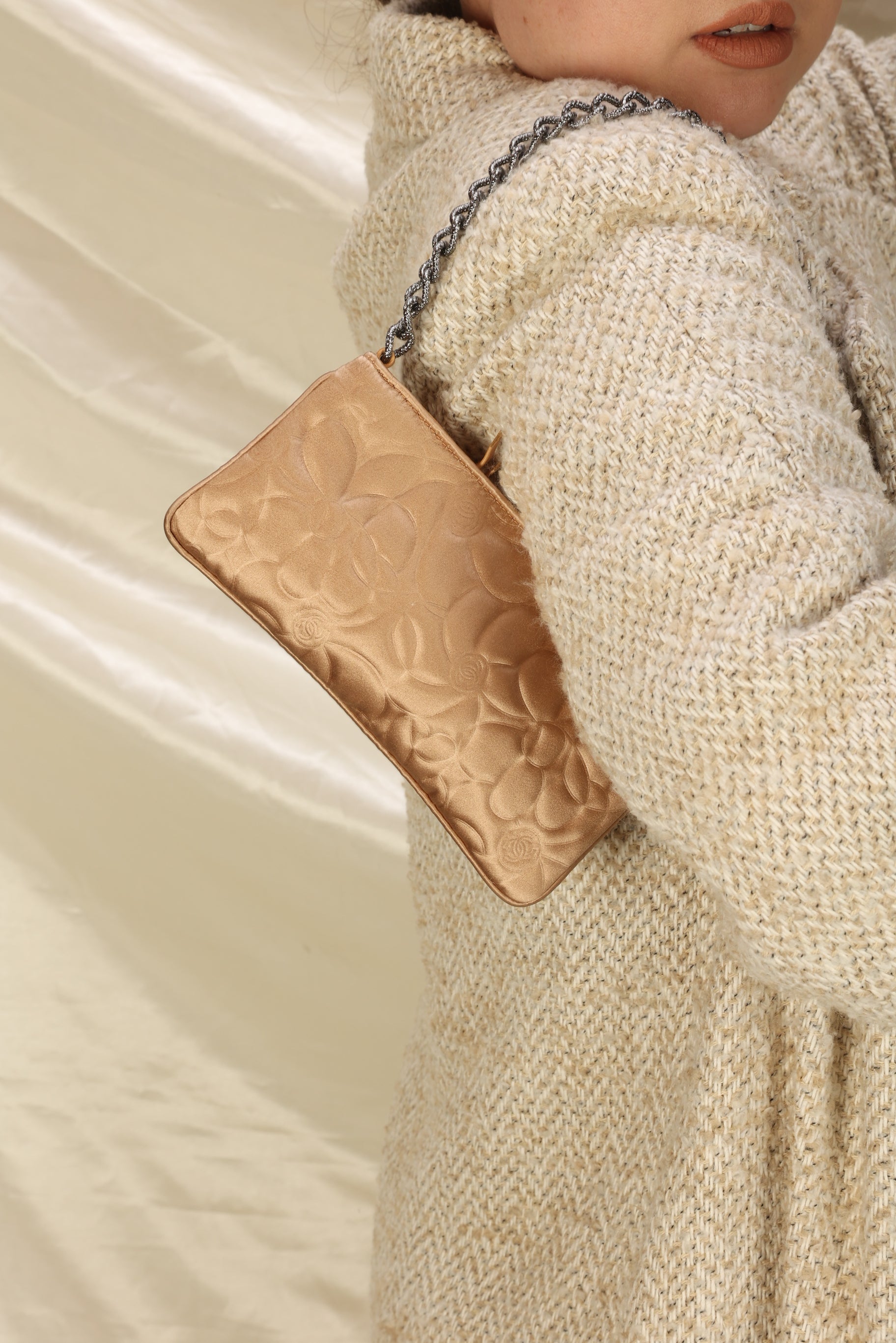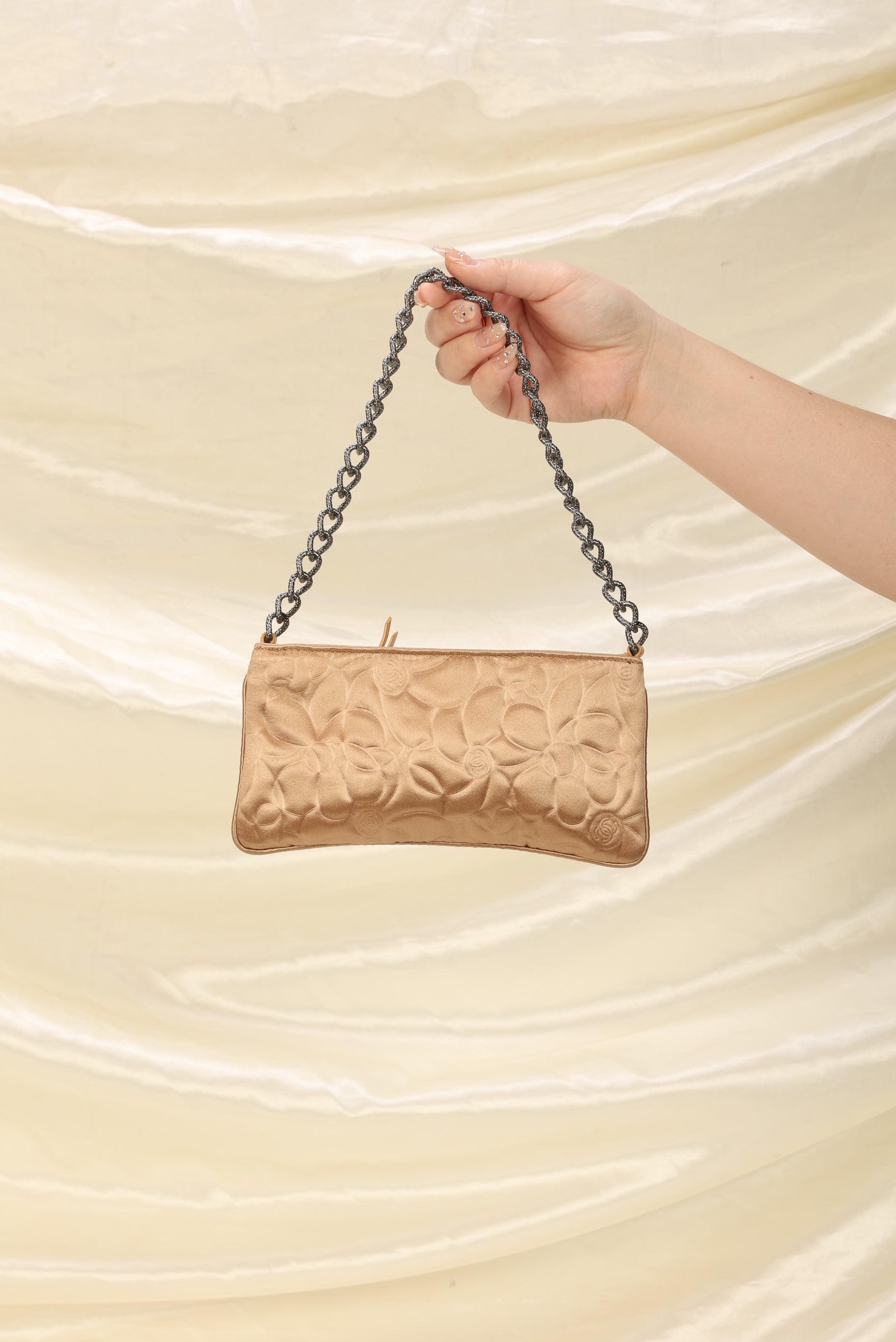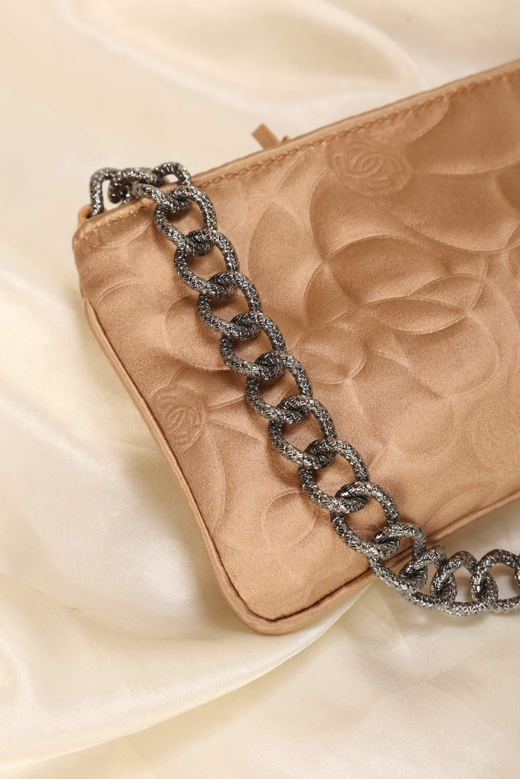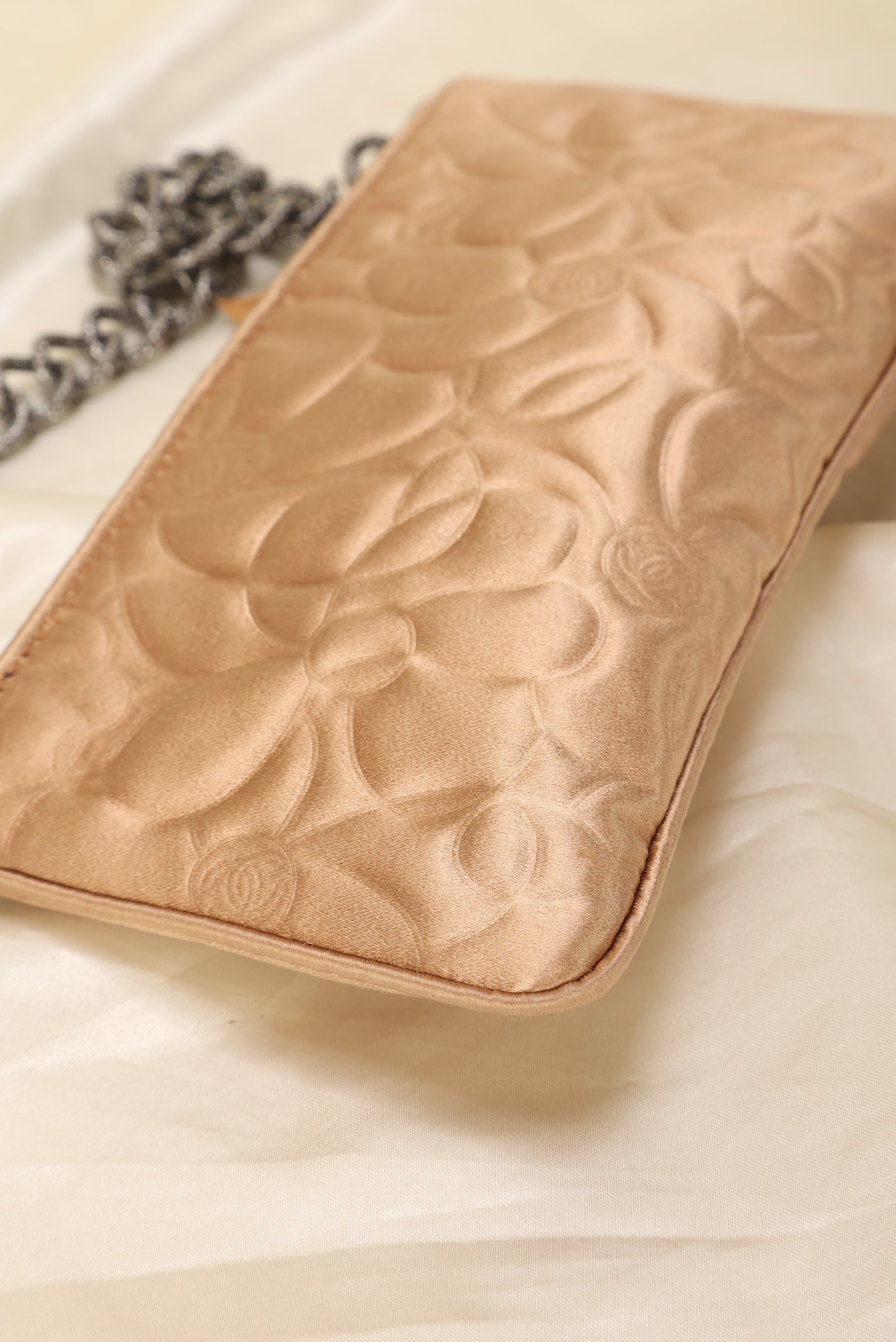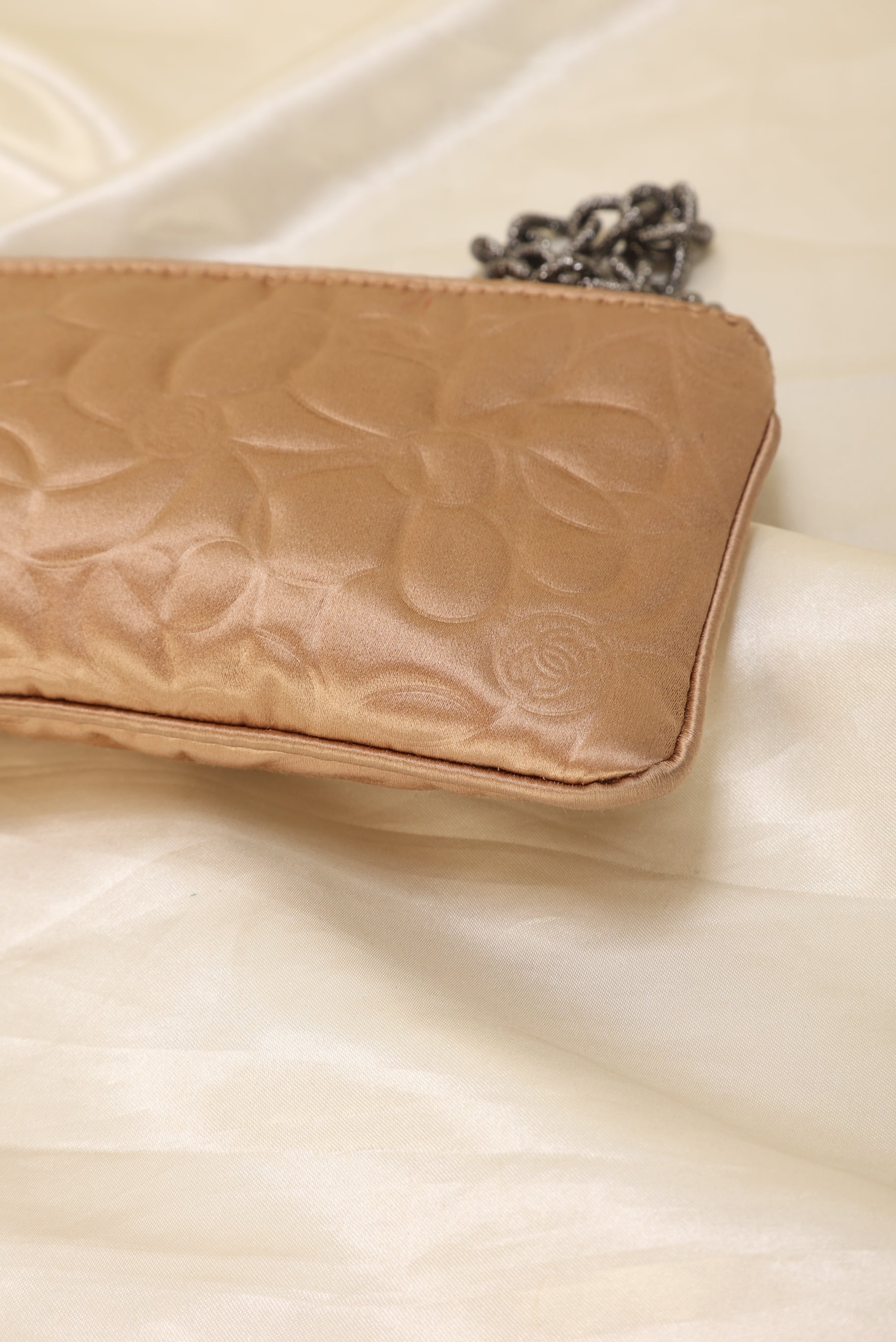 A champagne satin Chanel mini bag that has small camellia flowers and tiny, CC logos all over the bag - luxurious yet edgy. Gunmetal chain hardware is an unexpected touch to this sweet bag! Can fit a card holder and keys.