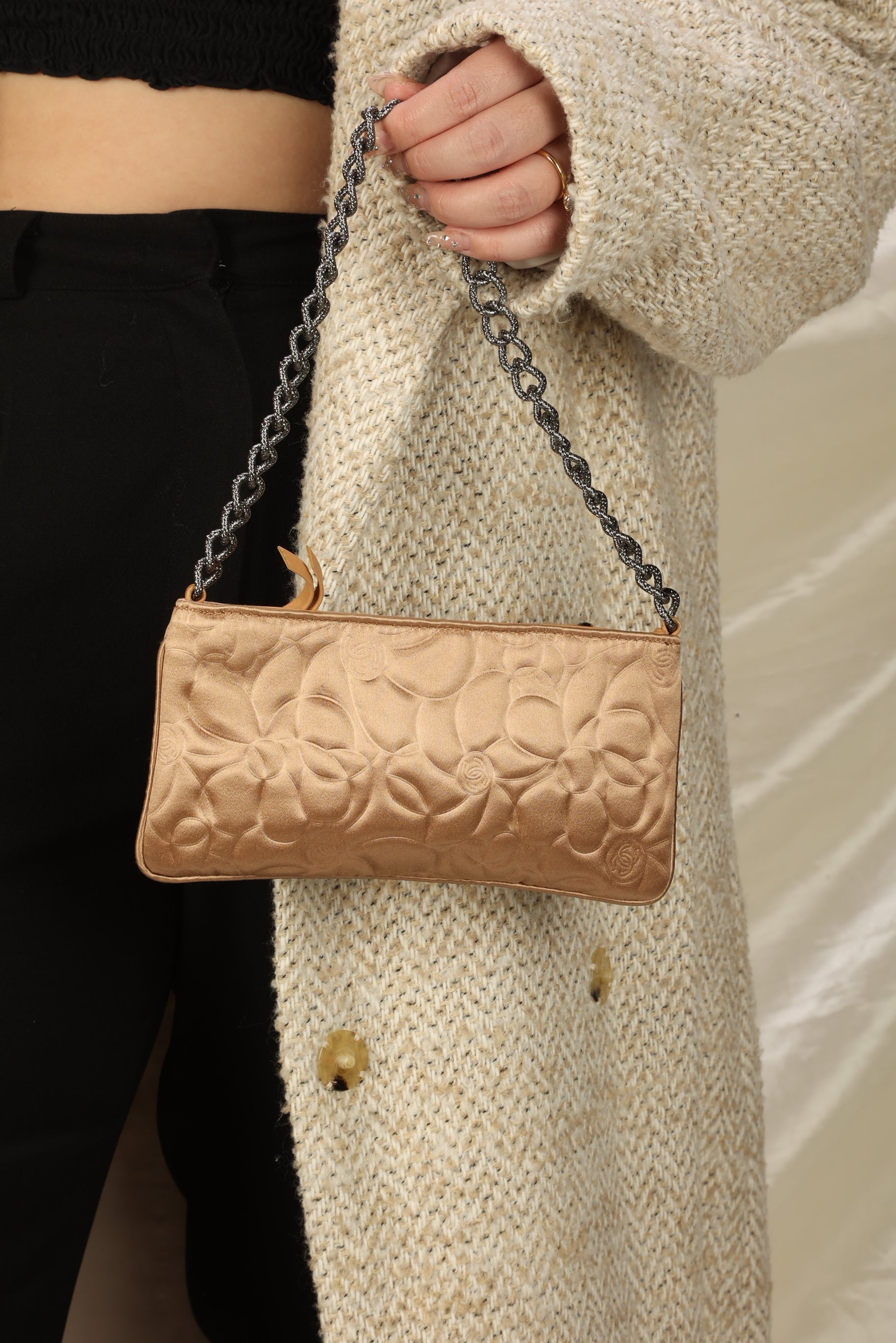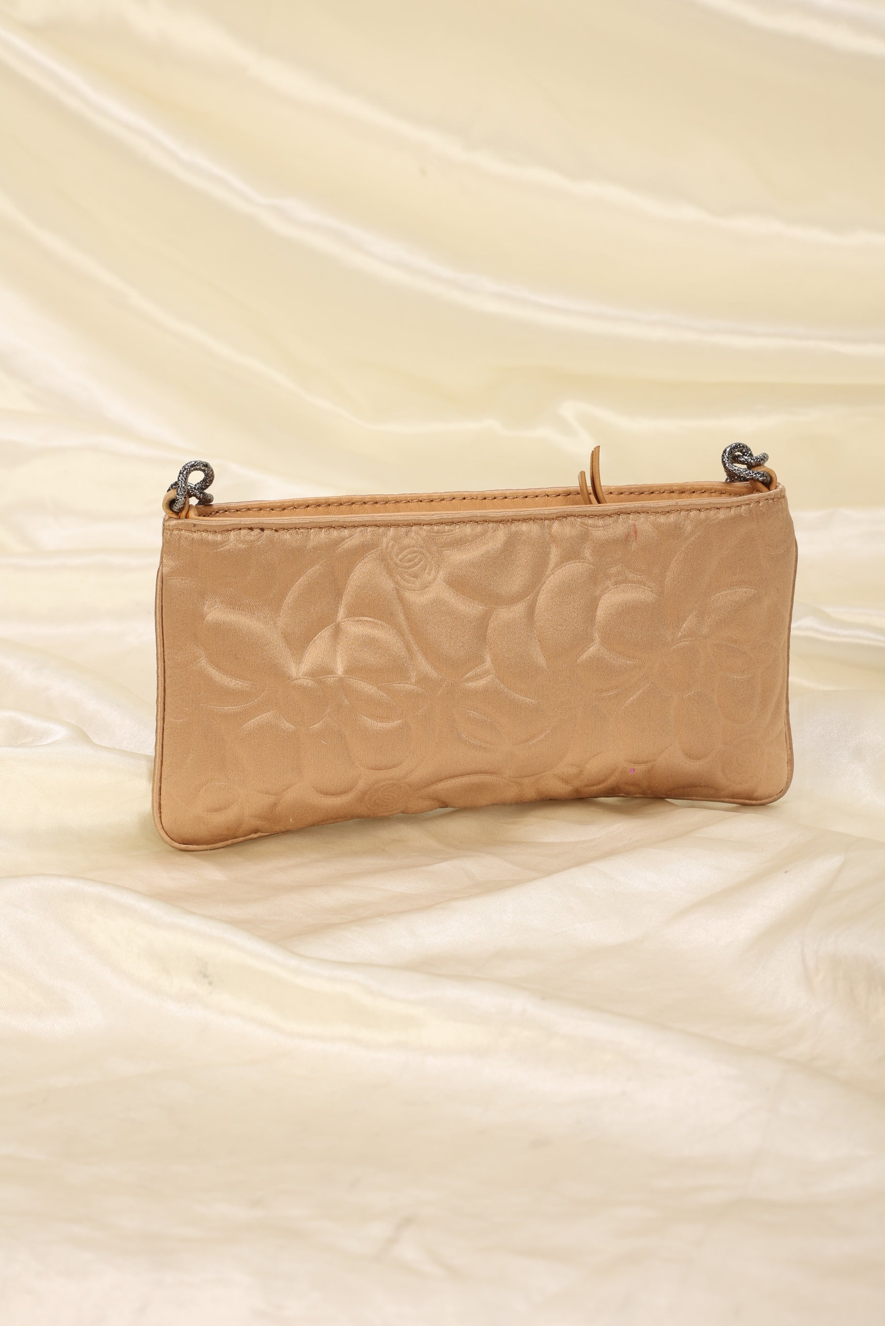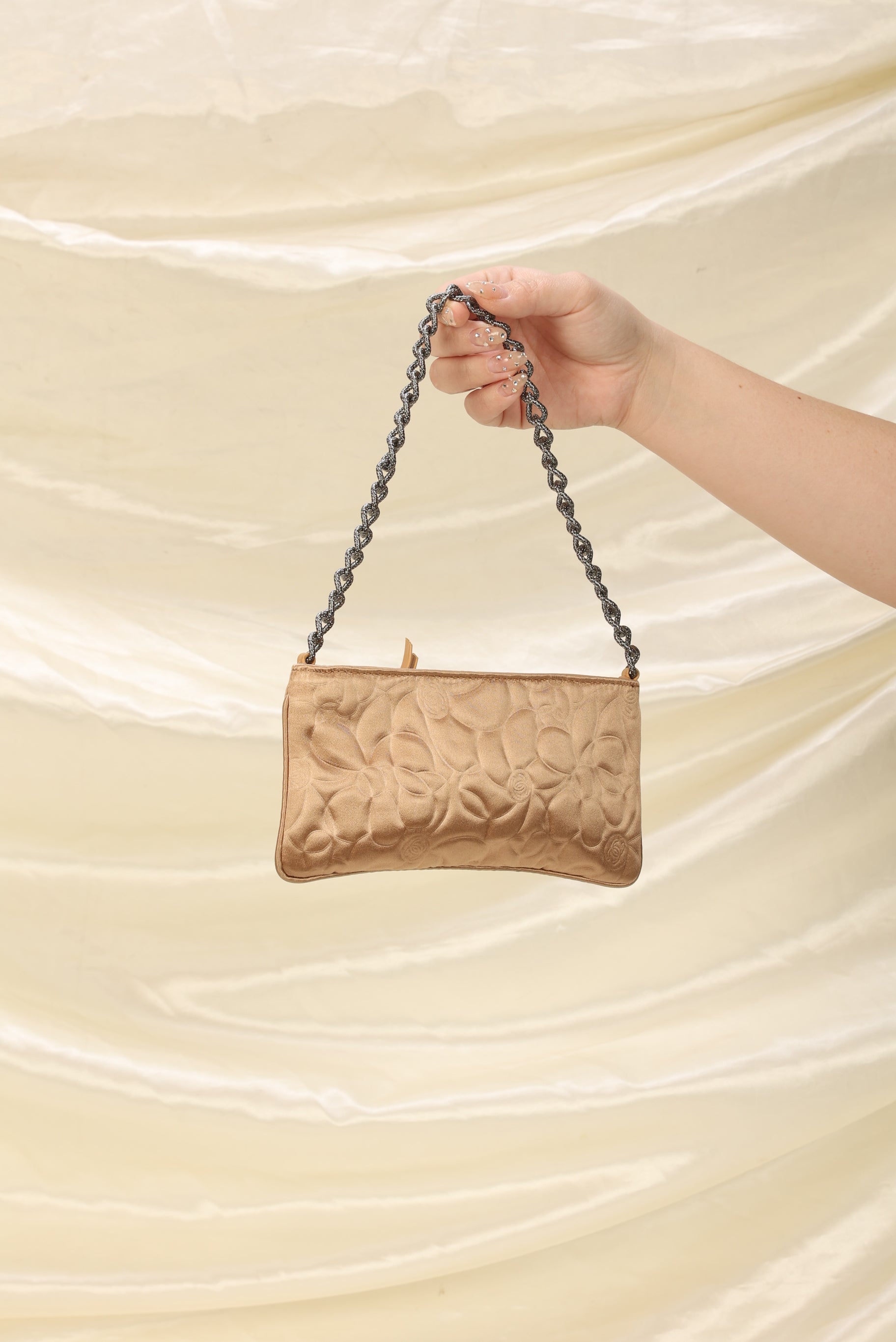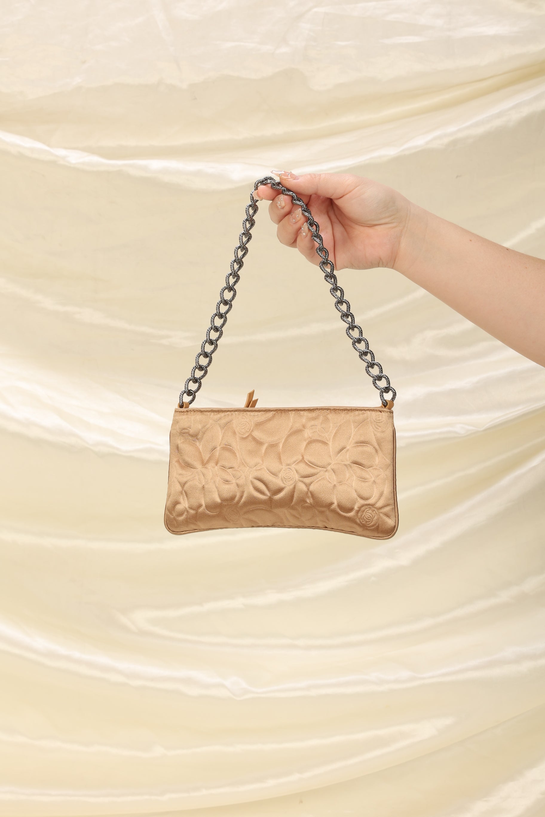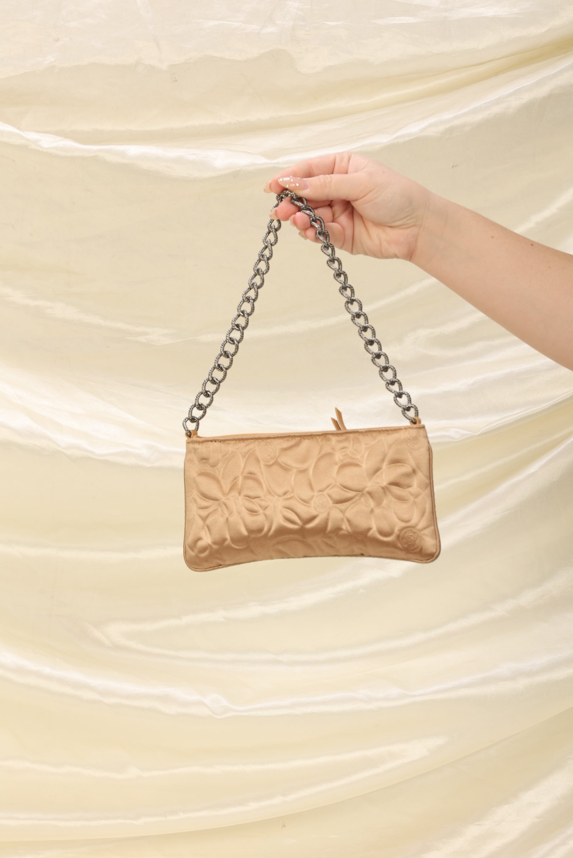A champagne satin Chanel mini bag that has small camellia flowers and tiny, CC logos all over the bag - luxurious yet edgy. Gunmetal chain hardware is an unexpected touch to this sweet bag! Can fit a card holder and keys.