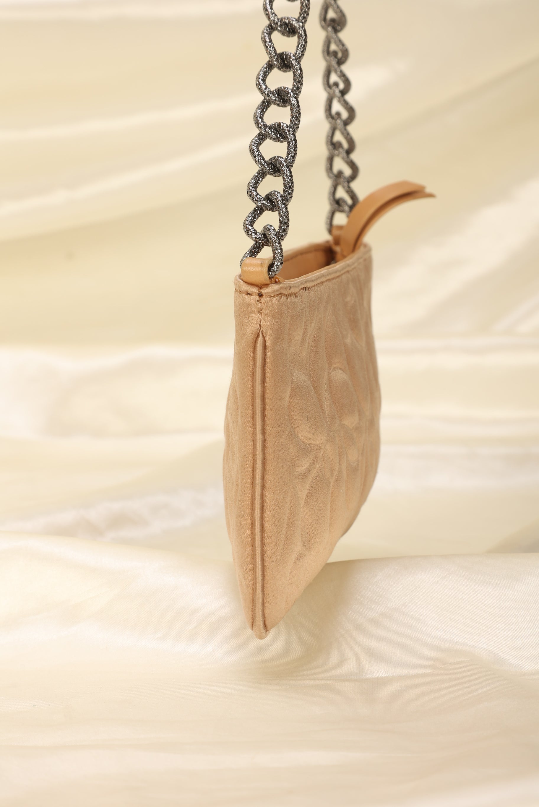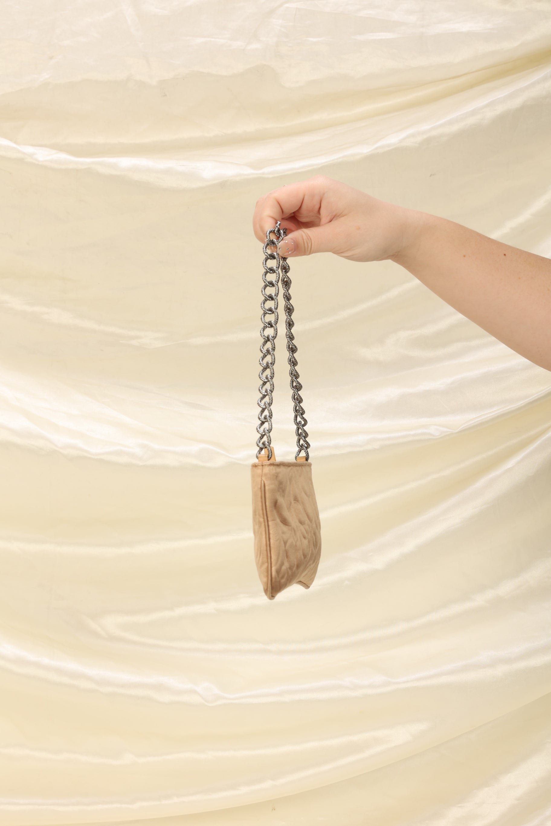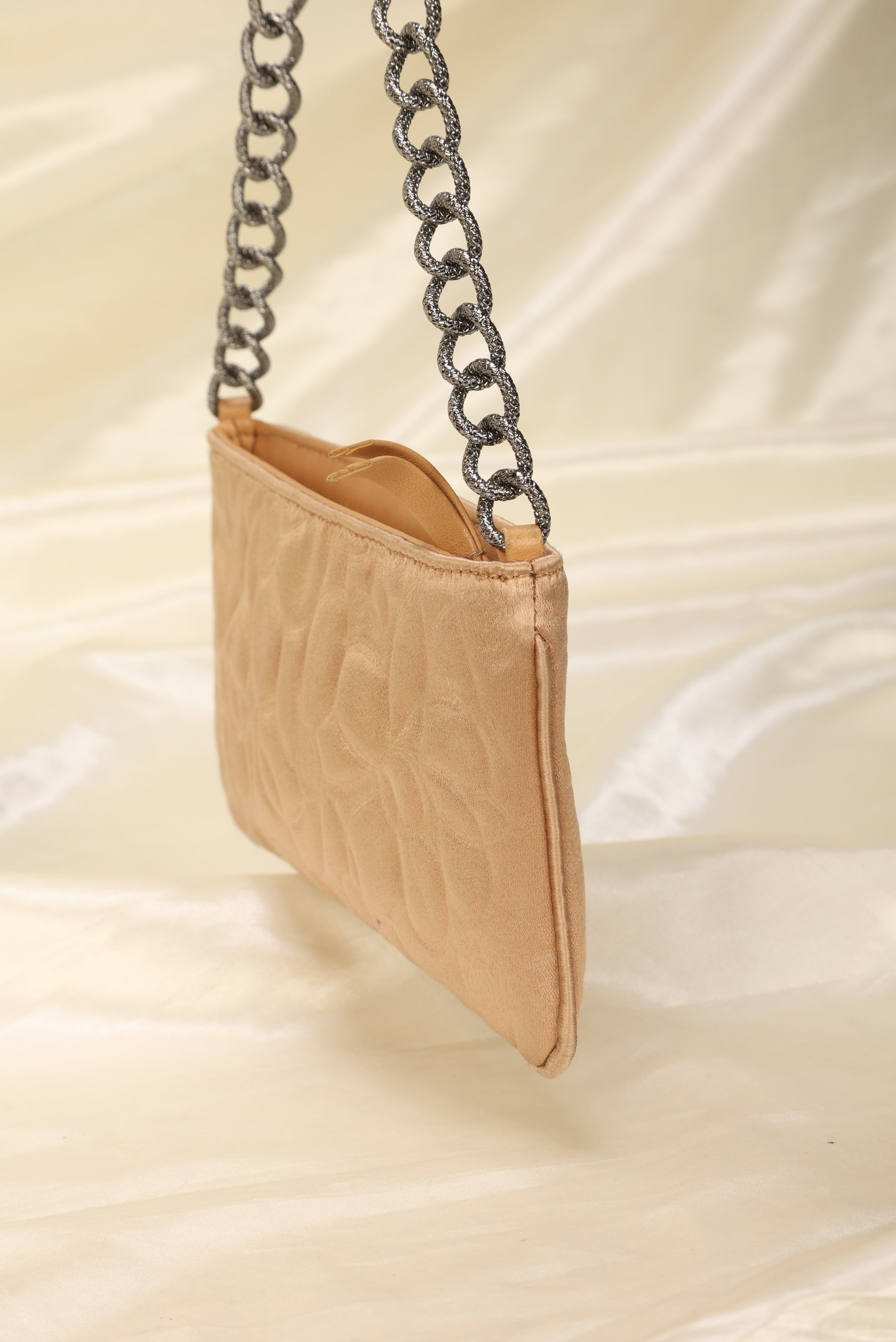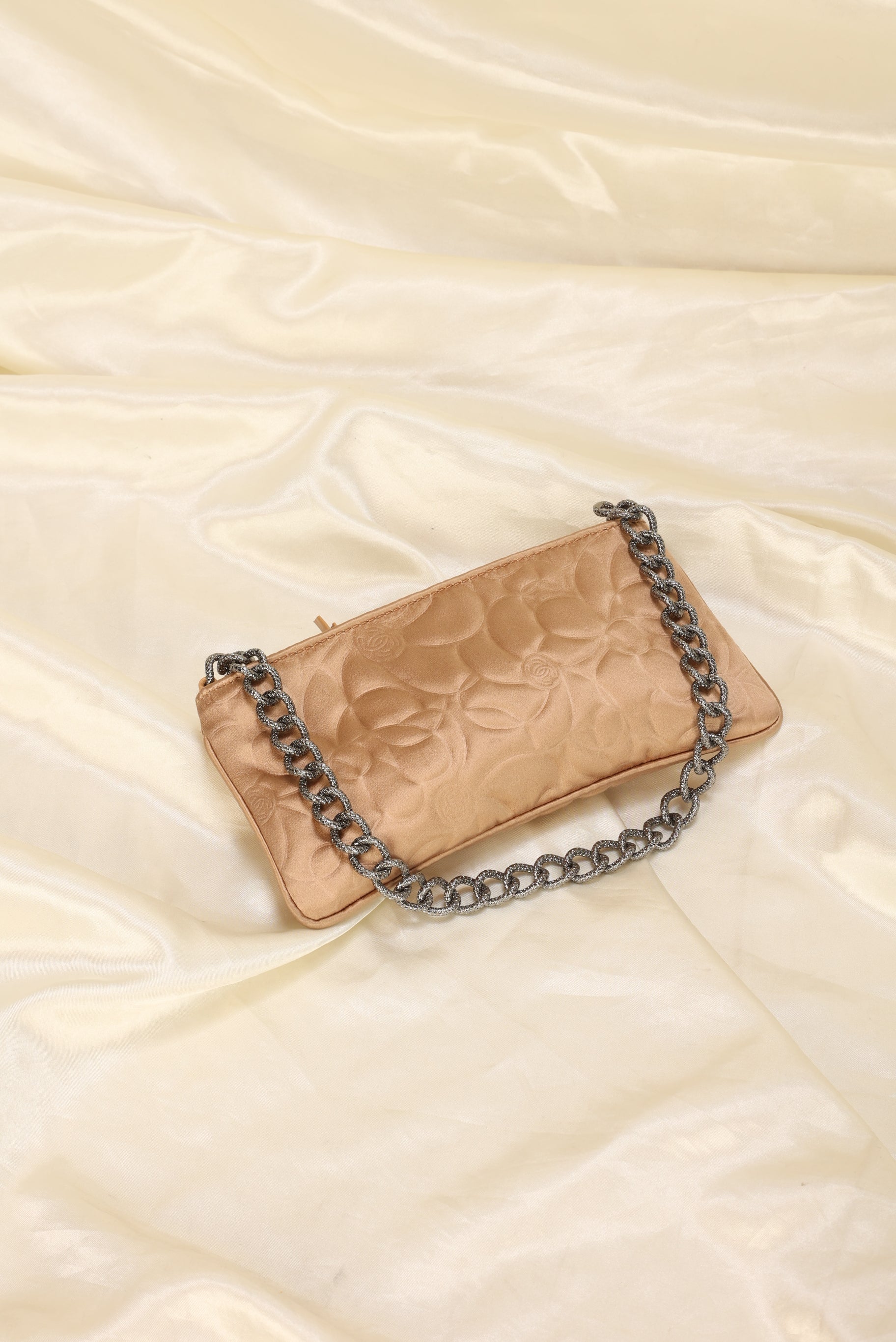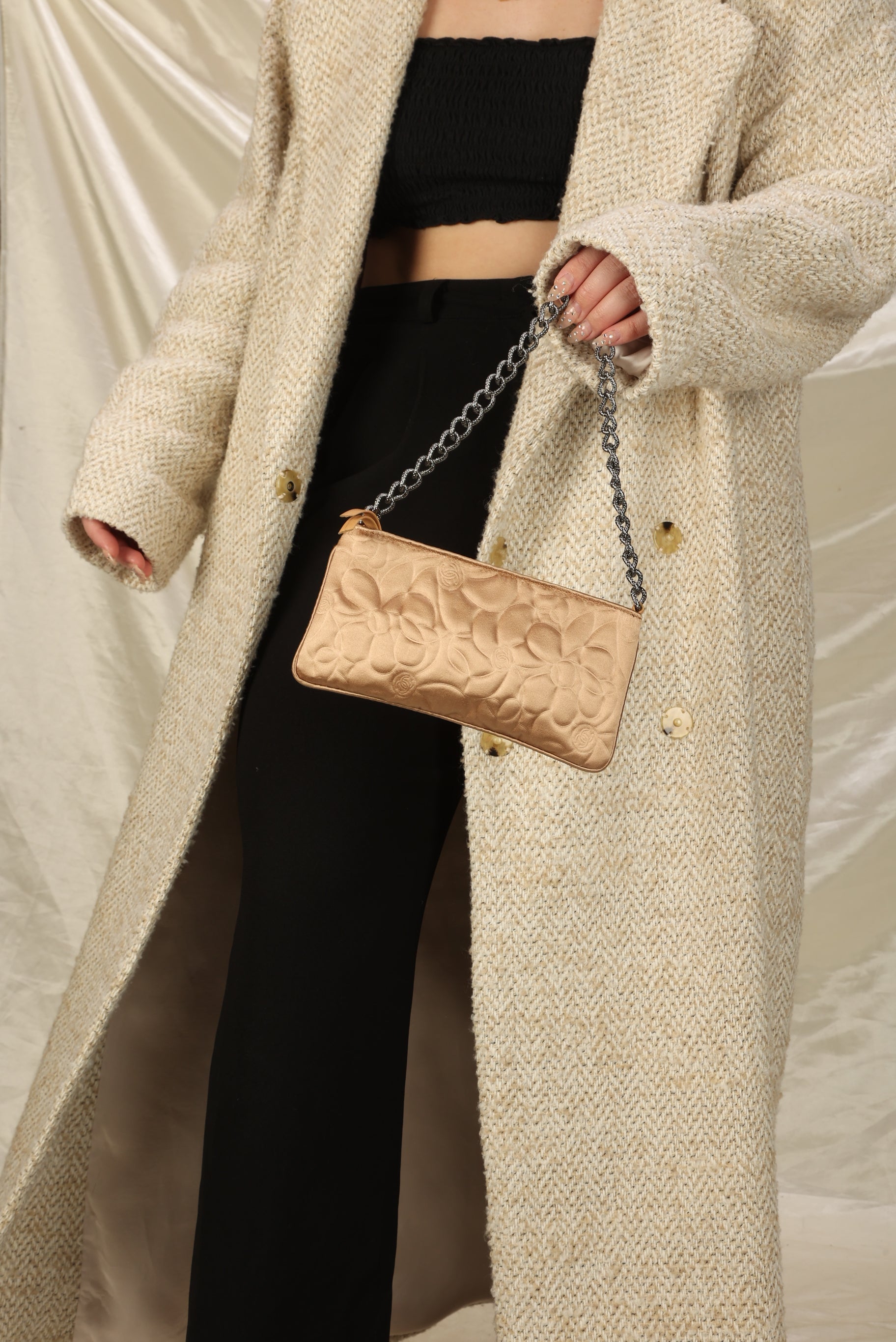 A champagne satin Chanel mini bag that has small camellia flowers and tiny, CC logos all over the bag - luxurious yet edgy. Gunmetal chain hardware is an unexpected touch to this sweet bag! Can fit a card holder and keys.